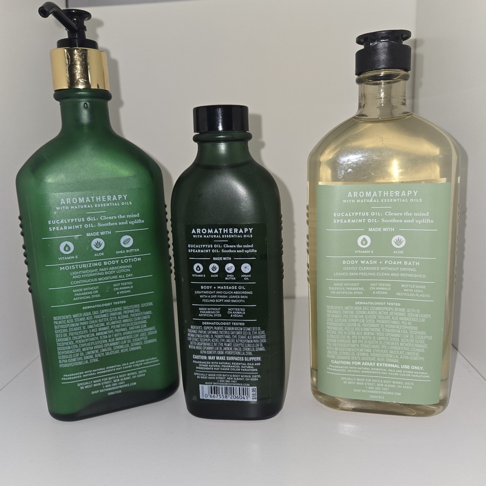 Formulation:Spray, Cream, GelMPN:NAFeatures:Animal Cruelty-FreeType:Gift SetPattern:FloralUPC:Does not applyProduct Line:Bath & Body WorksColor:GreenScent:Eucalyptus & SpearmintDepartment:UnisexSize:RegularCountry/Region of Manufacture:UnknownBrand:Bath & Body Worksgtin13:Does not apply