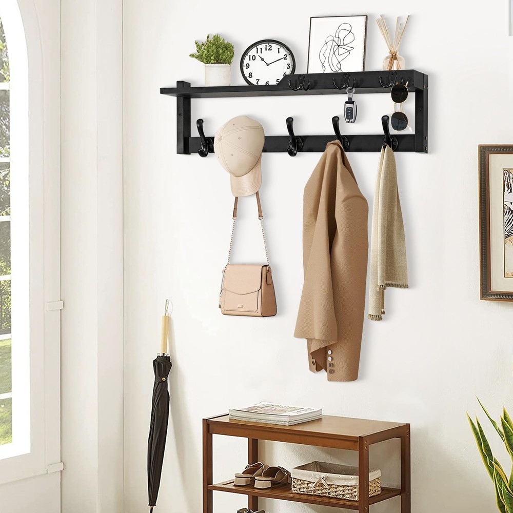 It is not only a coat rack, but also a key holder and mail organizer, and it is also a storage and display wall shelf; You no longer have to worry about forgetting things when you go out, because this coat rack can meet all your needs when you go out. PRACTICAL AND STYLISH: The appearance design of this wall-mounted coat rack is both fashionable and practical, and has applied for an appearance patent; It makes full use of the wall space at the entrance, can be matched with various decoration styles, adding an elegant touch to your space 4-IN-1 FUNCTION: It is not only a coat rack, but also a key holder and mail organizer, and it is also a storage and display wall shelf; You no longer have to worry about forgetting things when you go out, because this coat rack can meet all your needs when you go out UPGRADE AND IMPROVE: The upgraded coat hooks are thicker and stronger, combining durability and beauty, and can protect clothes from sharp hooks; Unique upper shelf design - Adding a baffle not only prevents items from sliding, but also makes it more aesthetically pleasing EASY TO INSTALL: The needed hardware(screws and anchors)are included; There are pre-drilled holes on the shelf and the hooks; You can refer to the instruction manual inside the packaging for installation STURDY AND WEAR: The frame is made of sturdy metal, and the shelf is made of carefully selected natural solid wood to ensure strong load-bearing capacity and long-lasting durability; Each hook can hang items lighter than 20 pounds; The fine craftsmanship and smooth surface treatment make it visually appealing