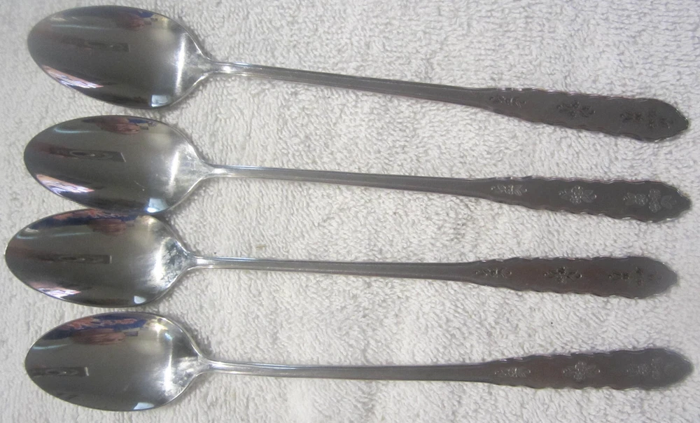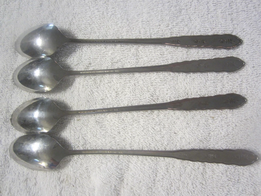 Set of 4 ice tea spoons in good used shape. See pics for condition. See photos for condition.Photos are considered part of the condition and description.If you are buying multiple items,save them in your cart and make one payment and they will ship together. USPS sets shipping prices and we always send cheapest unless requested otherwise. Shipping prices are non negotiable. We DO NOT ship to any other address besides your approved shipping address on ebay and our labels are printed from the same. We ship to the USA ONLY. All items will be shipped out the next day.(not including weekends and holidays) ASK QUESTIONS,DO NOT ASSUME.IF IT IS NOT IN THE DESCRIPTION AND PHOTO ,IT IS NOT INCLUDED. If an item is listed as untested,as is,or for parts or repair it is sold "as is" and assume it does not work. We ship USPS and Fed ex only.Fed-ex does not ship to PO boxes. R21
