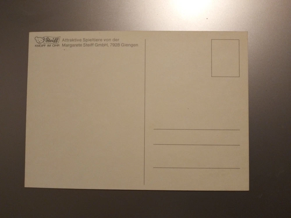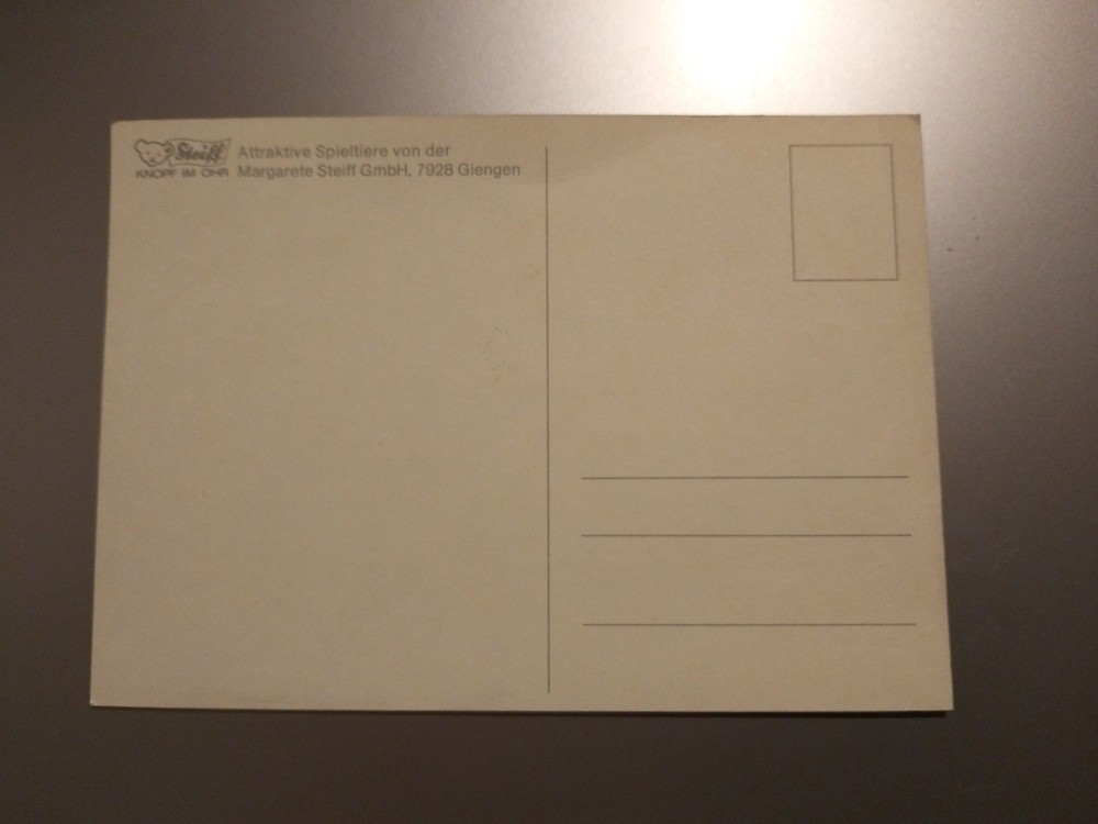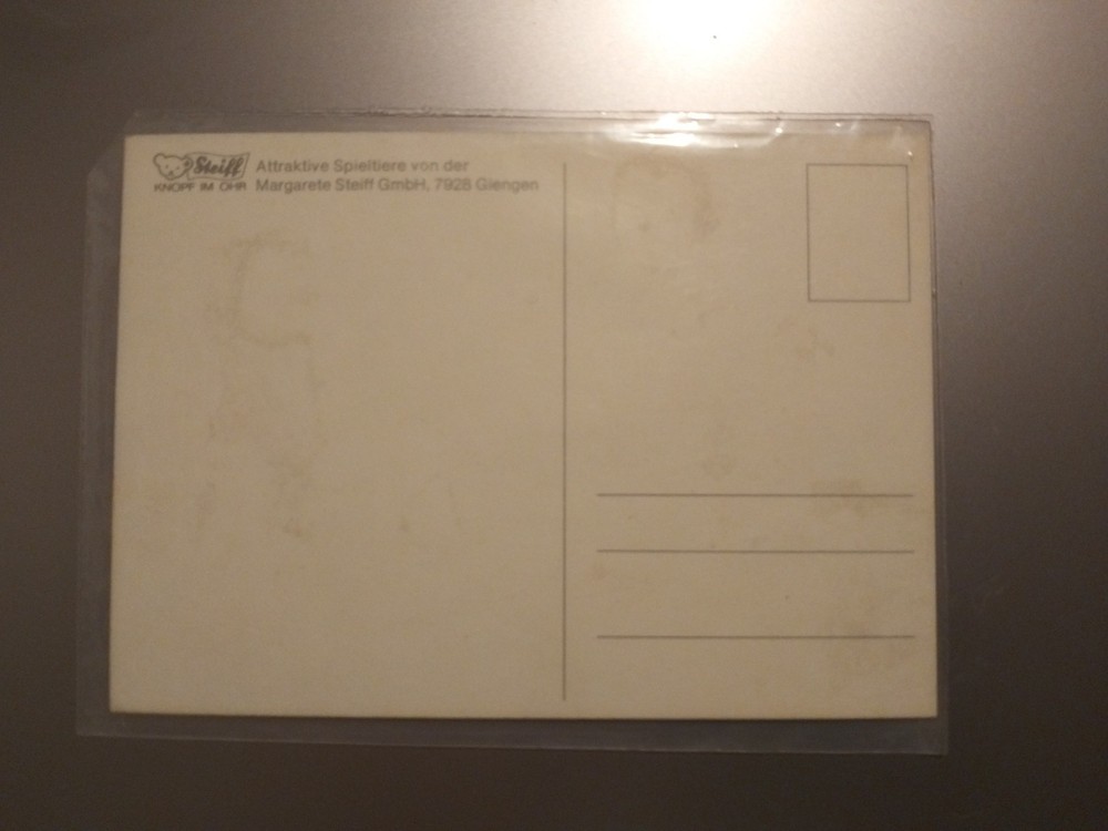 Tauchen Sie ein in die magische Welt von Steiff mit diesem exquisiten Satz von 4 unbeschrifteten Postkarten, die jeweils ein entzückendes Familienmotiv der Familie mecky zieren. Diese Original-Karten aus den Jahren 1980-1989 spiegeln die Tradition und den Charme der Nachkriegszeit wider und sind ein zeitloses Andenken an die festliche Zeit. Hergestellt in Deutschland, vereinen diese Karten die Liebe zur Kunst und zu Tieren, die sie zu einem wahren Schatz für Sammler und Liebhaber macht. Die hochwertige Kartonqualität sichert Langlebigkeit und Freude an diesen edlen Stücken, die sowohl als Dekoration als auch als Teil einer anspruchsvollen Sammlung dienen können. Privat Verkauf keine Garantie und keine Rücknahme und Ausschluss jeglicher Gewährleistung.