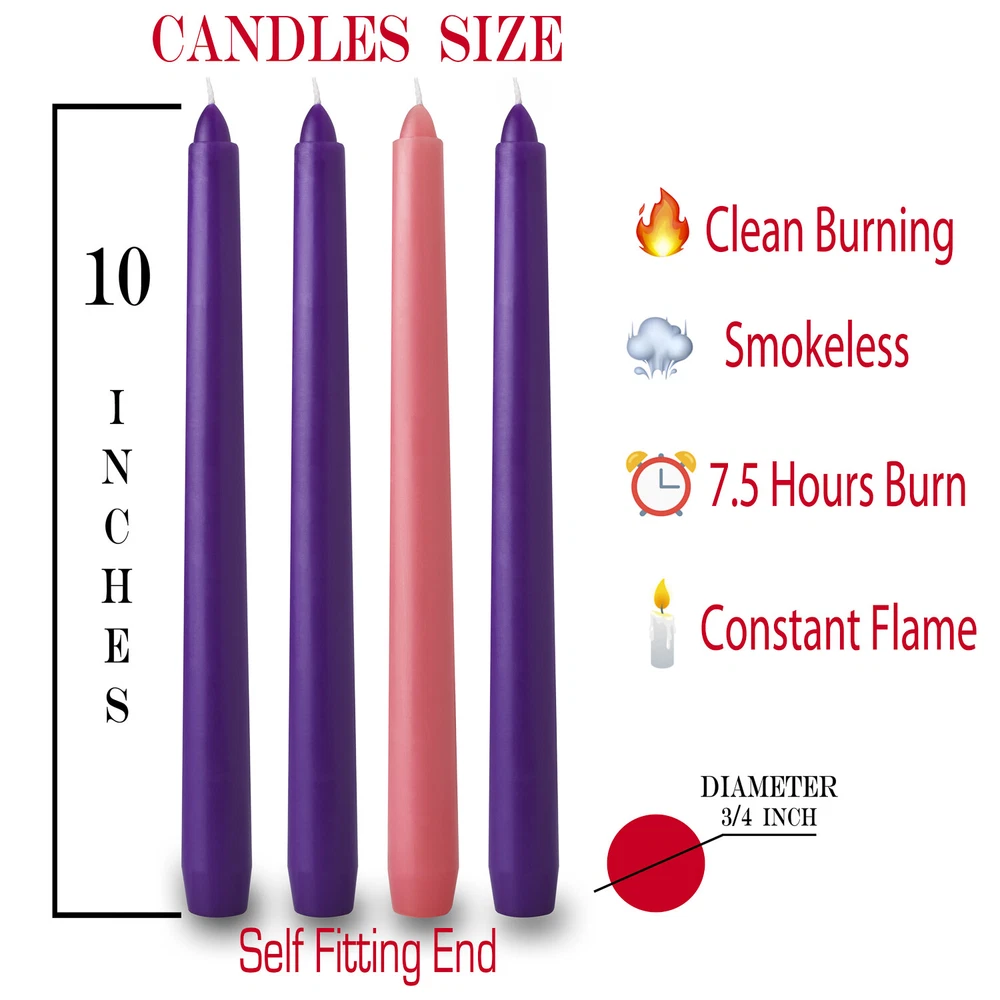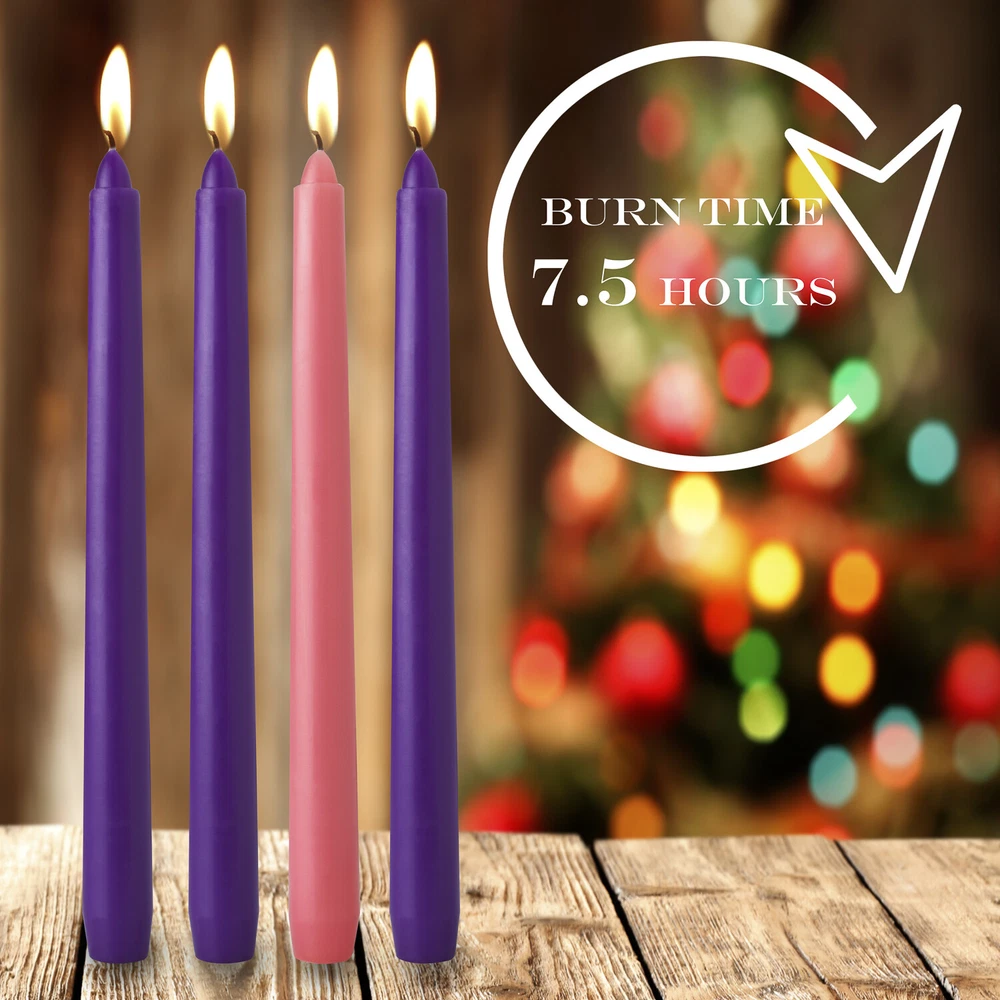 4 pcs Set of Christmas Advent Taper Candles- 10-inch x 0.75 (3/4)inch Diameter- 3 Purple & 1 Pink. 9-10 Hours Burn Time ★ FEATURES AND DETAILS – Packaged in 4 candles per box -Included 3 Purple and 1 Pink candle set [ Around 9 – 10 Hours burning Time] [ SIZE: 10 inches x 0.75-inch Diameter] ★ TOP QUALITY - You will love how these Advent candles burn. Smokeless. Perfect for congregation candlelight service and Chime Decorations ★ GIFT BOX PACKAGE - Properly packed. These sets of candles are packaged in an eye-catching designed gift box to ensure minimal or no damage during transportation. This will make a perfect add on gift or for use of your Christmas season home décor. ★ PERFORMANCE WICKS - Each wick is made from high-grade cotton. Raw wicks are coated with a blend of waxes to ensure proper smokeless burning. ★ 100% BUYER PROTECTION GUARANTEE - If you do not love it, we are not satisfied Let us know and we will make it right. Click ‘’ADD TO CART’’ and ORDER yours TODAY. 10-inch x 0.75 Inch Diameter Burn Time up to 7.5 Hours. Maintain color throughout burning. Cotton wick Clean Burn MULTIPURPOSE USE - Mini Taper Candles - Spell Candles - Chime Candles - Shabbat Candles - Rituals - Spells - Vigil Candles - Witchcraft Candle - Wiccan Supplies - Wax Play Candles The advent candle is lit on each of the four Sundays preceding Christmas. Traditional candle set for use in standard Advent wreaths. Advent Wreath: Circle that represents Eternity.Candle#1: The Candle of Hope Candle#2: The Candle of Peace Candle#3: The Candle of Love Candle#4: The Candle of Joy Perfect Chime Candles Taper Candles add elegance and sophistication to any formal event. Whether it is at a wedding, a reception table or just for a romantic candlelight dinner for that special person. They provide just the right amount of textured lighting for a dramatic presentation. Small Tapers make the perfect tabletop light for upscale restaurants and parties. Those mini taper candles are the perfect decorations for a Christmas tree, Christmas caroling or Holiday Season. They will fit to your angel chimes; pyramids and many other candle holders.