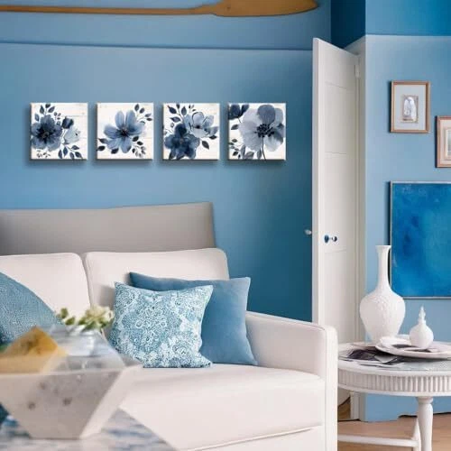 Return Policy Fast Delivery Trusted seller 4 piece Blue Floral Wall Art White Wood Artwork Canvas Prints Grey and Navy Flowers in The style of Watercolor Painting Vintage Floral Wall Decor Each 12 inches x 12 inches Product Description Decorative Wall Art: This set of 4 painted canvas prints wooden panels features a beautiful floral design, perfect for adding a touch of elegance to any room. Versatile Placement: Suitable for living rooms, bedrooms, dining areas, dens, nurseries, offices, kitchens, bathrooms, entryways, and hallways. Durable Construction: Crafted from high-quality wood, ensuring long-lasting beauty and durability. Easy Installation: Hang the panels individually or arrange them in a cohesive display for a stunning gallery wall. Dimensions: Each panel measures approximately 12 inches by 12 inches (30 cm by 30 cm). Shipping Returns Payment Shipping Shipping is FREE to all addresses other than APO/PO boxes in the lower 48 states. All our stock ships from US-based warehouses. Shipped via USPS or UPS (depending on location and package weight) Unless stated otherwise, all orders will ship within 24-72 hours of your payment being processed. Check our feedback to see the great reviews of FAST shipping we offer. Returns Seller does not accept returns Payment We currently accept payment via eBay managed payments only. Once payment is cleared, we will dispatch your shipment within 1-3 business days. Please refer to the "Shipping" tab for more information regarding shipping speed to your destination.