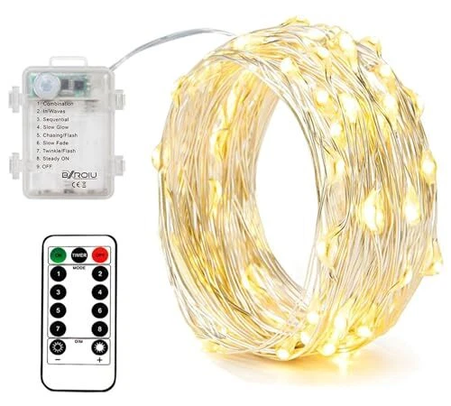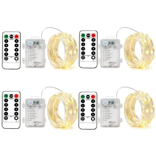 【Lighting 8 modals】 fairy lights battery with remote control of 8 modals with different light types: wave-type change, continuous change, change of flicker, single light gets brighter and darker, slow-flash change, dreamlike change, burst flash, always bright. 【Timer Mode】 Enjoy the convenience of our user-friendly timing function. Simply press the timer button, and the string lights will gently flicker once, indicating successful activation. The fairy lights will automatically illuminate for 6 hours and then gracefully turn off for 18 hours each day. Should you wish to deactivate this function, it can be easily suspended 【Battery Fairy Lights】 Elevate your decor with this set of 4 Silver Wire Fairy Lights. Each string extends 16.4Ft/5 meters and is adorned with 50 micro LEDs. These battery-powered lights are incredibly versatile and easy to hide, allowing you to effortlessly decorate any space. The battery case ensures a discreet power source. (Batteries not included; requires 3 AAA size batteries) 【Versatile Decoration】These string lights are perfect for both indoor and outdoor use, helping you craft a warm, romantic, and relaxing ambiance in various settings. Whether you're adorning your courtyard, garden, stairs, hallways, bedroom, or using them for special occasions like weddings, parties, Halloween, and Christmas, these lights are sure to enhance the atmosphere 【High-Quality Silver Wire】Crafted from thin and flexible silver wire, these fairy lights are incredibly versatile. They can be easily bent and twined around plants, handrails, scutcheons, furniture, and more, allowing you to bring your decorative ideas to life with ease