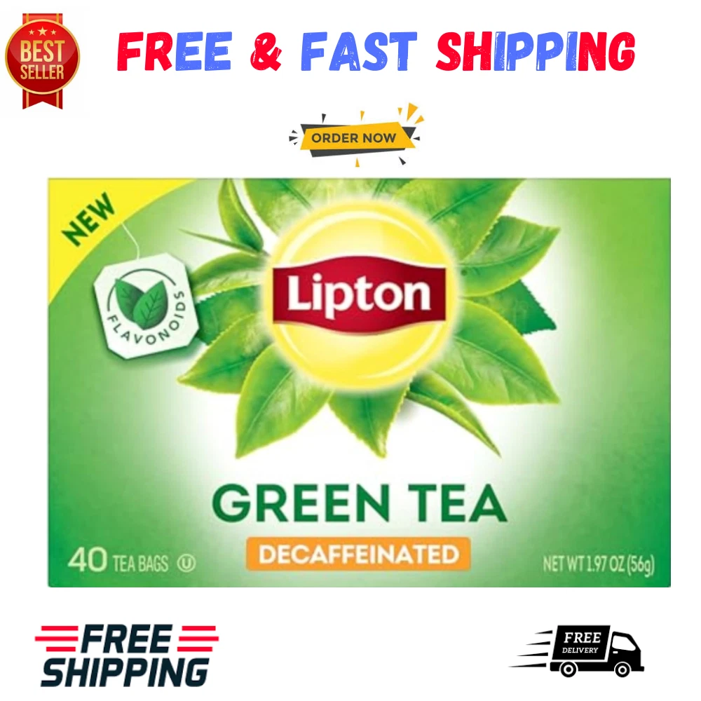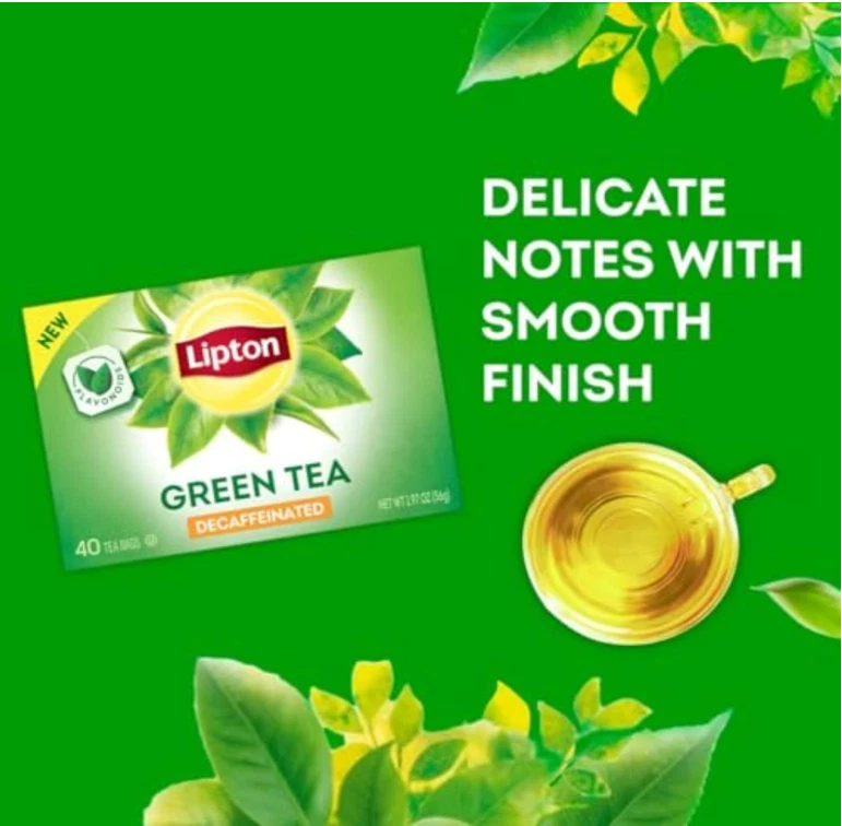 Lipton Decaffeinated Green Tea Bags, Unsweetened Teabags for Decaf Hot Tea or Decaf Iced Tea with Flavonoids, 40 Total Tea Bags About this item : Brand Lipton Item Form Teabags Flavor Green Tea Variety Green Unit Count 40 Count · DECAF GREEN TEA BLEND: Savor the smooth and delicate taste of Lipton Decaffeinated Green Tea any time of day. · 2 CUPS TO GOODNESS: Per serving, unsweetened Lipton Decaffeinated Green Tea contains about 50mg of Flavonoids, naturally occurring bioactives found in tea, vegetables, and fruit; Enjoy two cups a day to provide 100mg of Flavonoids. · EASY TO MAKE, HOT OR ICED: For hot decaf green tea, pour 8 fl oz of hot water (212°F) over a tea bag, infuse for 4 minutes, remove, and enjoy; For iced green tea, add 16 fl oz of hot water (212°F) over 4 tea bags in a pitcher, infuse for 4 minutes, remove, and sip away. · DELIGHTFUL TASTE AND AROMA: Bask in delicate decaf green tea notes with a smooth finish and a mellow woody aroma with Lipton decaf teabags. · YOUR DAILY HERO: Each serving of Lipton Decaffeinated Green Tea contains about 50mg of Flavonoids, 0 calories, 0g of added sugars, and is 99.5% water.