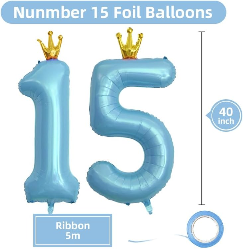 40 Inch Blue Crown Number 15 Balloons, 15Th Large Foil Helium Balloons,Gold 15Th