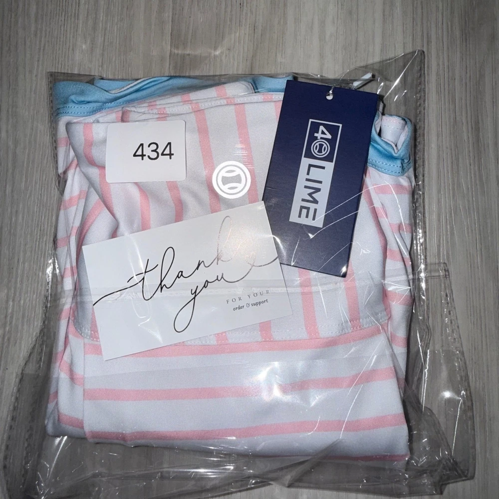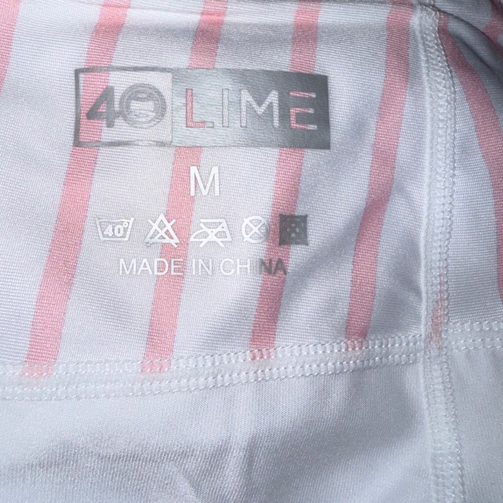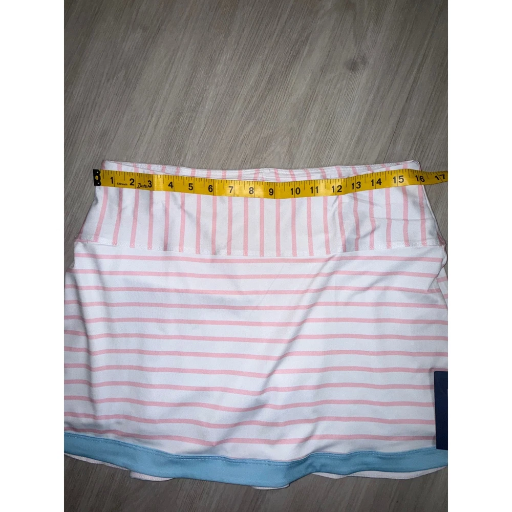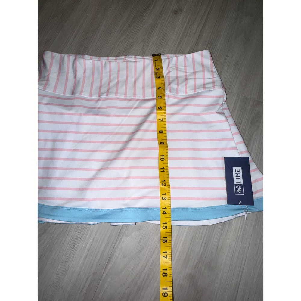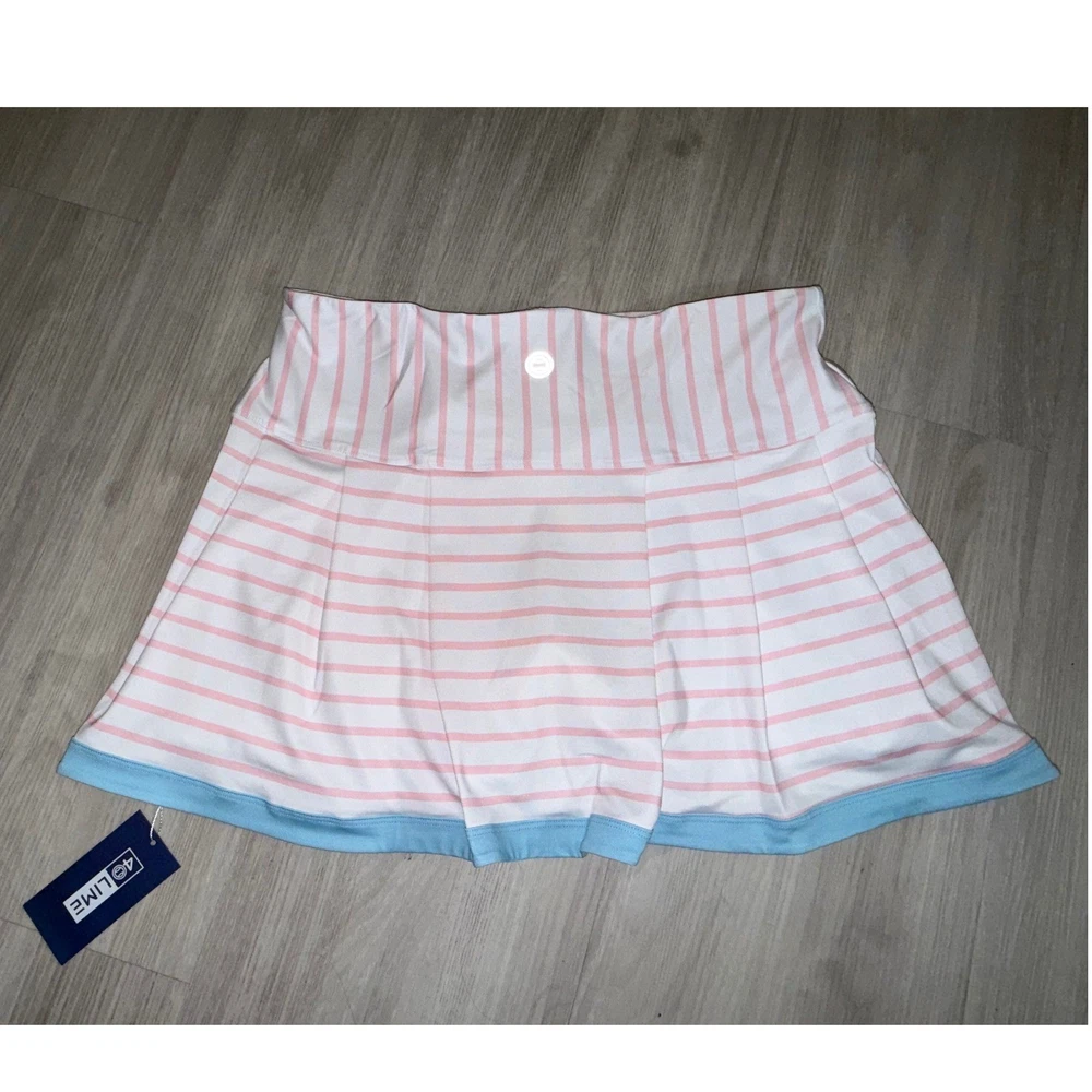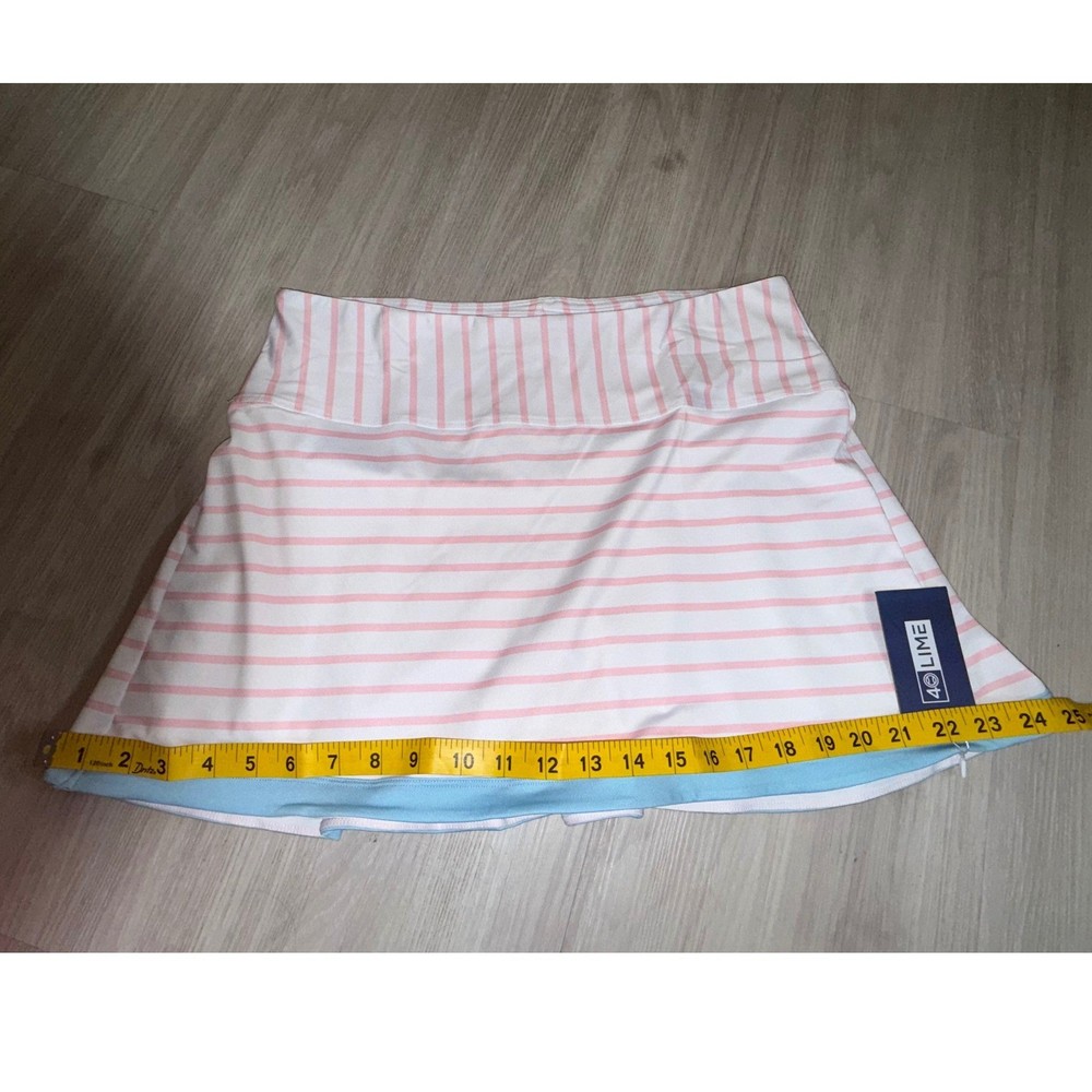 40 Lime tennis skort features a classic striped pattern in pink and white with a contrasting light blue trim at the hem. Designed for athletic performance, this piece includes built-in white compression shorts for coverage and comfort during movement. The wide, flat waistband provides a secure fit, while the back features subtle pleating for added flair and mobility on the court. Measurements: • Waist: 16" (32" doubled) • Length: 14.5" • Hem Width: 23"