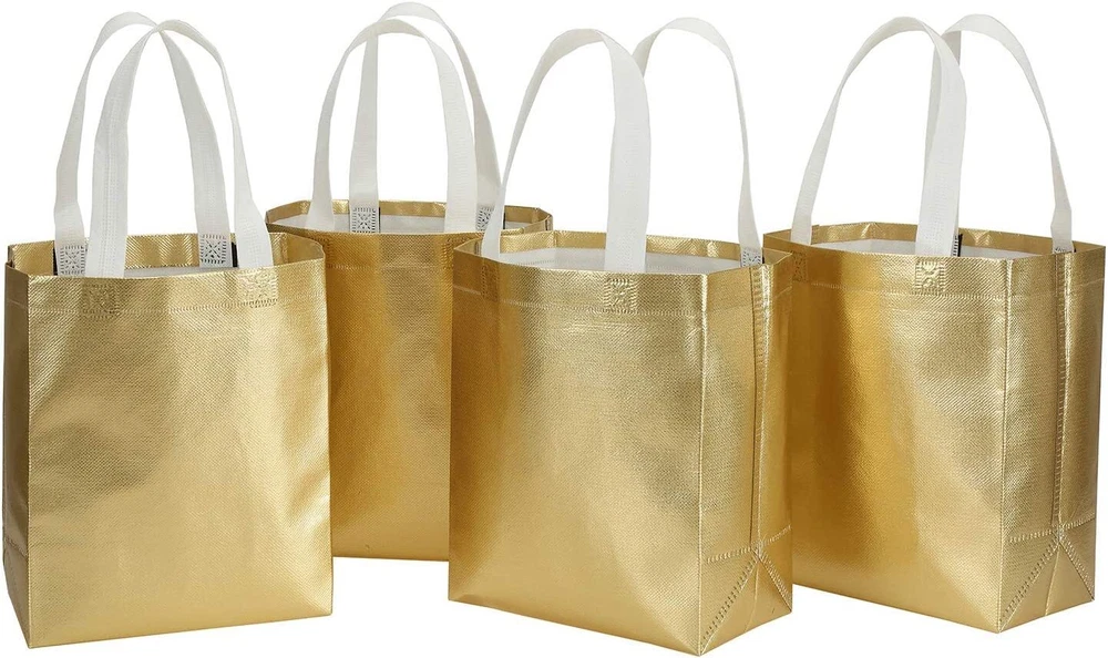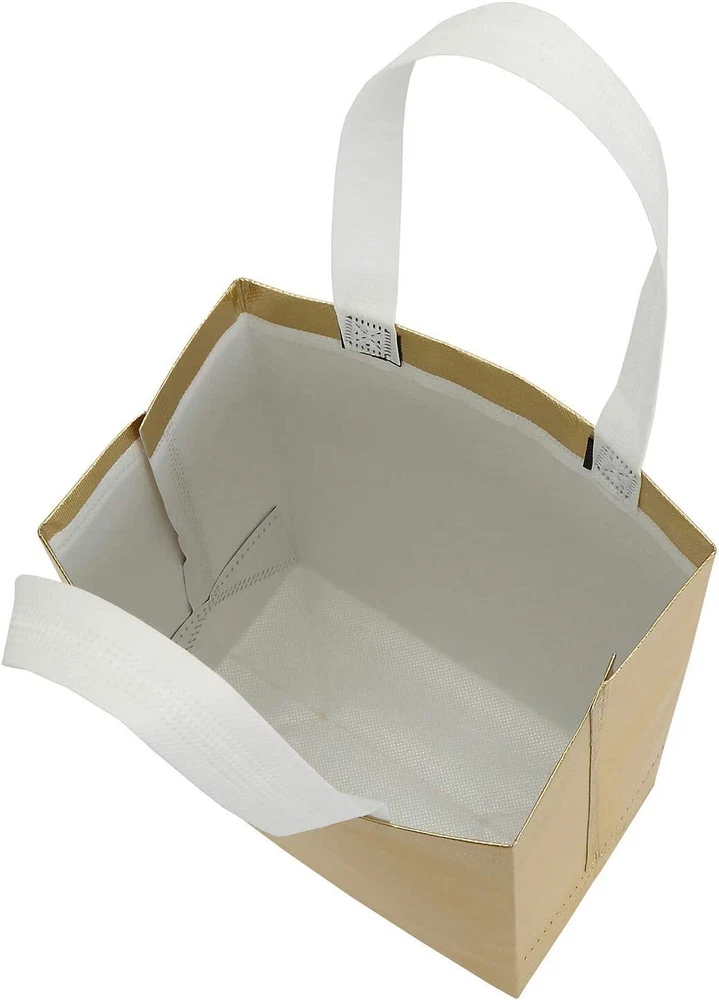 40 Pack 10 x 8 Inch Glossy Gold Reusable Grocery Bags Shopping Tote Bag with Handle Present Bag Gift Bag for Weddings, Birthdays, Party, Event - Gold Click the brand name around the product name to find more good items in ! Value pack 40 pieces bags in gold color. Each measures 10” x 8” x 4-3/4”; Handle is about 5-1/2” long. Made of environmental friendly non-woven fabric with gold laser printing, reusable and durable for daily use. Features comfortable handles for easy carry and waterproof surface for better protect your goods inside. Heavy duty and big enough size for you pack whatever you want. Folds easily for space saving storage when not in use. Perfect bags for shopping, grocery, travel, storage and practical for daily use, also great for giveaway favors packing for weddings, birthdays, Christmas, parties or any other events. Value pack 40 pieces bags in gold color. Each measures 10" x 8" x 4.75"; Handle is about 5.5" long Made of premium quality non-woven fabric with glossy laser printing, reusable and durable for daily use. Features comfortable handles for easy carry and waterproof surface for better protect your goods inside Heavy duty and big enough size for you pack whatever you want; Folds easily for space saving storage when not in use Perfect bags for shopping, grocery, travel, storage and practical for daily use, also great for giveaway favors packing for weddings, birthdays, Christmas, parties or any other events