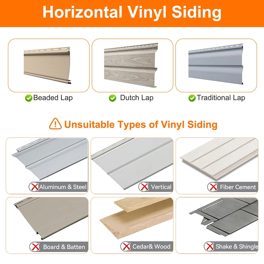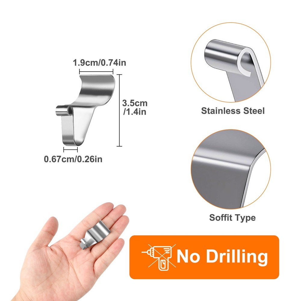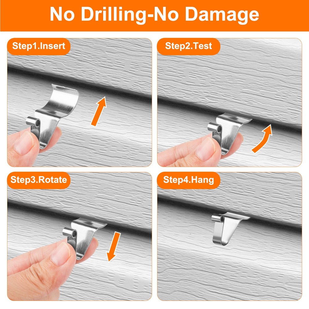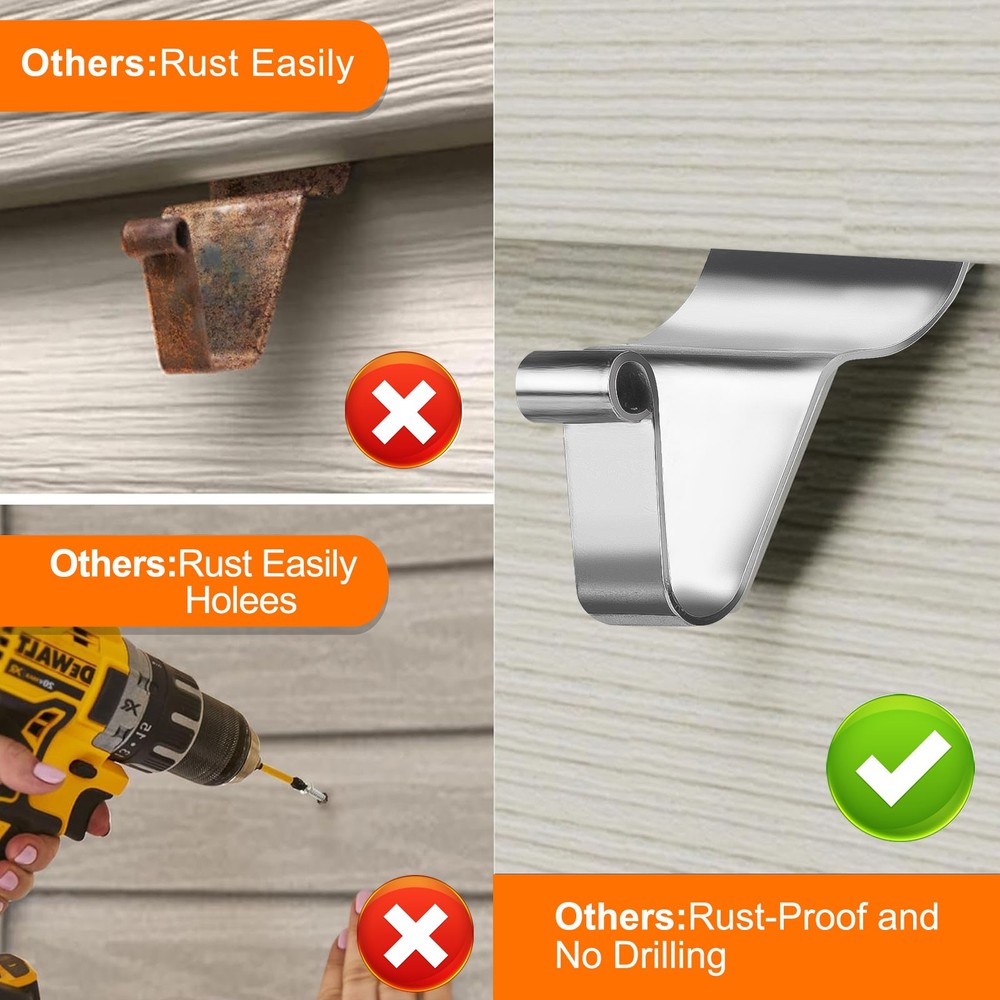Product Description 40-Pack Vinyl Siding Hooks Hanger, Heavy Duty Stainless Steel Vinyl Siding Clips, No-Hole Needed Front Porch Decor, Siding Hooks for Hanging Outdoor Product Feature 🛠 Sturdy and Durable Material: Premium quality heavy-duty stainless steel, durable, no deformation, with long-lasting service life. They will never damage, stain, or rust your vinyl siding. 💪 Heavyweight Support: Due to the heavy-duty material construction, these hooks are able to carry weights of up to 11 lbs, which makes the no-hole siding hooks not deform or bend easily. Therefore, you will be able to hang various daily or festival decorations on the siding to add a great touch to your home. 🔧 Simple to Use: No hole needed, no tools required, just rolls into any seam in your vinyl siding without screws or drilling. Provides you with a practical way to conveniently hang your outdoor walls without tools or holes. 📦 40 Value Pack in One Package: Coming in a value pack with 40 house siding clips, this pack provides you with a way to maximize your vinyl siding space for your needs. 📐 Space-Saving Design: Compact size allows you to maximize available siding space for multiple hangings. 🎉 Versatile Application: Set of 40 stainless steel siding hangers ideal for hanging decorative items like wreaths, planters, or lights on horizontal vinyl siding gaps. Product Specification Type Wall Panel Gaphook Color Silver Qty 40PCS Finish Type Polished Mounting Type Integrated Siding Seam Mount Item Dimensions L X W X H 1.4 X 0.26 X 0.74 Inches Material Stainless Steel Maximum Weight Limit 11 Lbs Special Feature Rust Resistant Recommended Uses Wall Theme Vinyl Siding Decoration Features Removable, Reusable, Adjustable, No Drilling Required, Non-Damaging To Siding Suitable Types of Vinyl Siding Beaded Lap, Dutch Lap, Traditional Lap Unsuitable Types of Vinyl Siding Aluminum & Steel, Board & Batten, Vertical, Cedar& Wood, Fiber Cement, Shake & Shingle Recommended Uses Hanging Wreaths, Lights, Signs, Flags, And Outdoor Decor Package Included 🎁 40 × Wall Panel Gaphook Location Descriptions To improve your buying experience and ensure fast delivery, Your order will be shipped from the warehouse located in either new jersey or california that is closest to your address. If you have any questions, Please contact us. Thank you for your support !