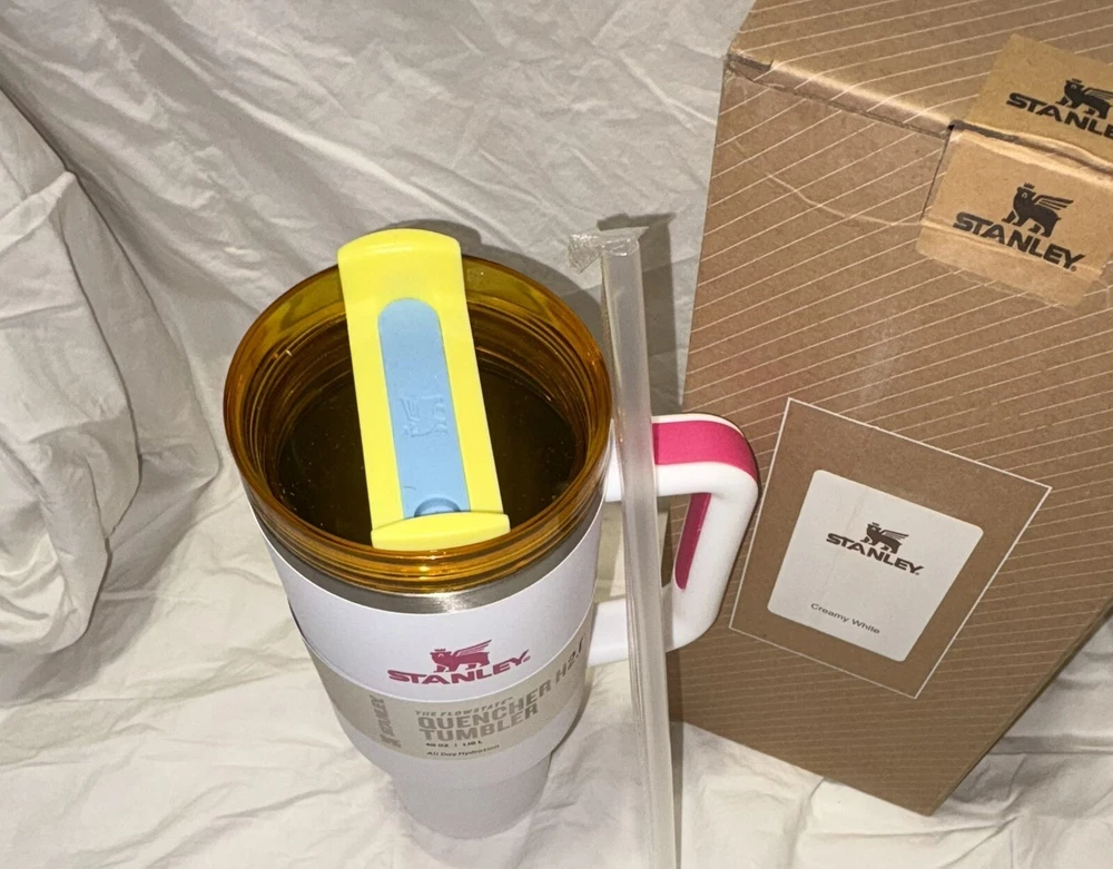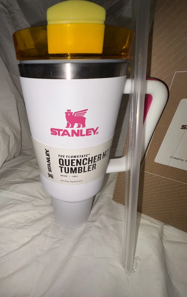 Introducing the Stanley 40 oz Stainless Steel H2.0 Flowstate Quencher Tumbler in White, perfect for keeping your hot or cold beverages fresh for hours. This three-piece tumbler set comes with a drink-through lid, making it easy to sip on your favorite beverage. The tumbler is made of high-quality stainless steel, plastic, steel, and BPA-free plastic materials, ensuring it is durable and safe to use. With a capacity of 2 liters, this tumbler is perfect for teens, adults, kids, and everyone in between. It comes with a handle, lid, straw, and is freezer safe. The tumbler is also break/chip resistant, etched, decorated, and suitable for hot beverages. It is insulated and has a capacity of 40 oz. The tumbler is hand wash only and measures 6.7 inches in height and 2.7 inches in width. This tumbler set is perfect for any occasion, whether it is for sports or for enjoying your favorite beverage.