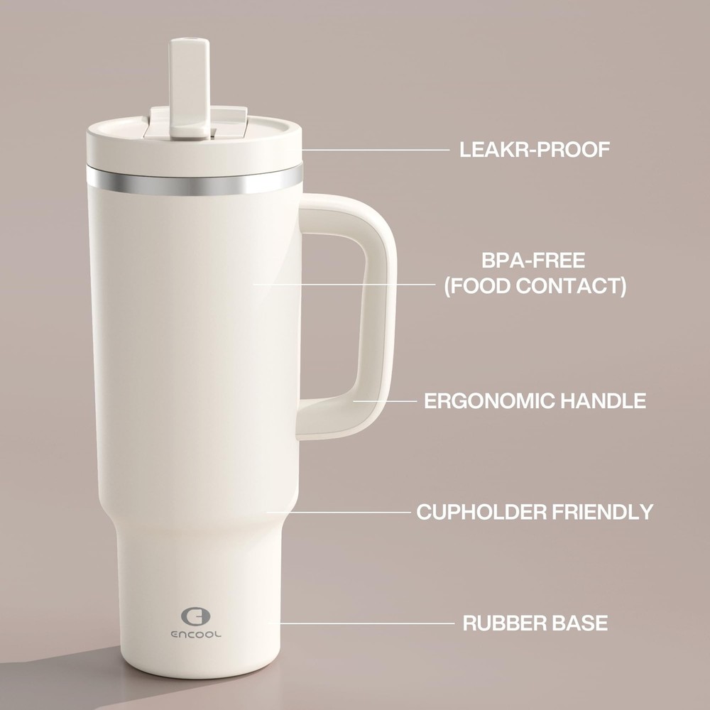 40 oz Tumbler with Handle and Straw: Stainless Steel Insulated Tumbler Keeps Cold for 24 Hours, Leakproof Travel Cup Fits in Cup Holder and BPA-Free, Cream Moon Product Details Size: 40 Ounces Color: Cream Moon Brand: ENCOOL MPN: EC-THD EAN: 6978104550544 UPC: Does not apply Brand: ENCOOL Color: Cream Moon Special Feature: Manual Style: Casual Theme: Sports Brand: ENCOOL Color: Cream Moon Special Feature: Manual Style: Casual Theme: Sports Recommended Uses For Product: Home, Travel Included Components: Lid Shape: Tumblers Product Care Instructions: Hand Wash Only Material Feature: Insulated, BPA-free Reusability: Reusable Unit Count: 1.0 Count Item Weight: 0.77 Kilograms Product Dimensions: 5.51"W x 10.63"H Number of Items: 1 Manufacturer: ENCOOL Size: 40 Ounces Item Weight: 1.7 pounds Item model number: EC-THD Date First Available: February 13, 2025 Leakproof Convenience: The secure, flip-top lid ensures a spill-free experience. Flip it open for easy sipping on the go, and snap it shut to keep your drink safely containedperfect for your active lifestyle. All-Day Temperature Control: Equipped with double-wall vacuum insulation, this tumbler keeps your beverages ice cold for up to 24 hours. Whether youre on a road trip, at the office, or hitting the trails, enjoy your drink at the perfect temperature. Sleek Style, Everyday Comfort: Designed with a modern look and available in multiple vibrant colors, this tumbler complements your style. Its ergonomic shape and soft-grip handle make it as comfortable to carry as it is stylish to use. Sustainable & Durable: Crafted from BPA-free, high-quality materials, this eco-friendly tumbler is built to last. Easy to clean and reusable, its your go-to solution for reducing waste while staying hydrated. Travel-Friendly Design: With its anti-slip base and narrow shape, this tumbler fits effortlessly into most car cup holders. Lightweight and portable, its the ideal companion for commutes, workouts, and outdoor adventures.