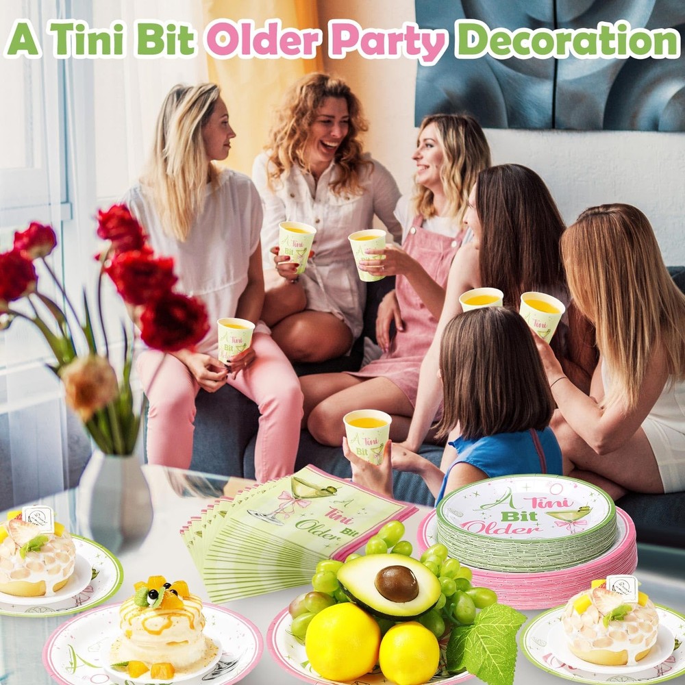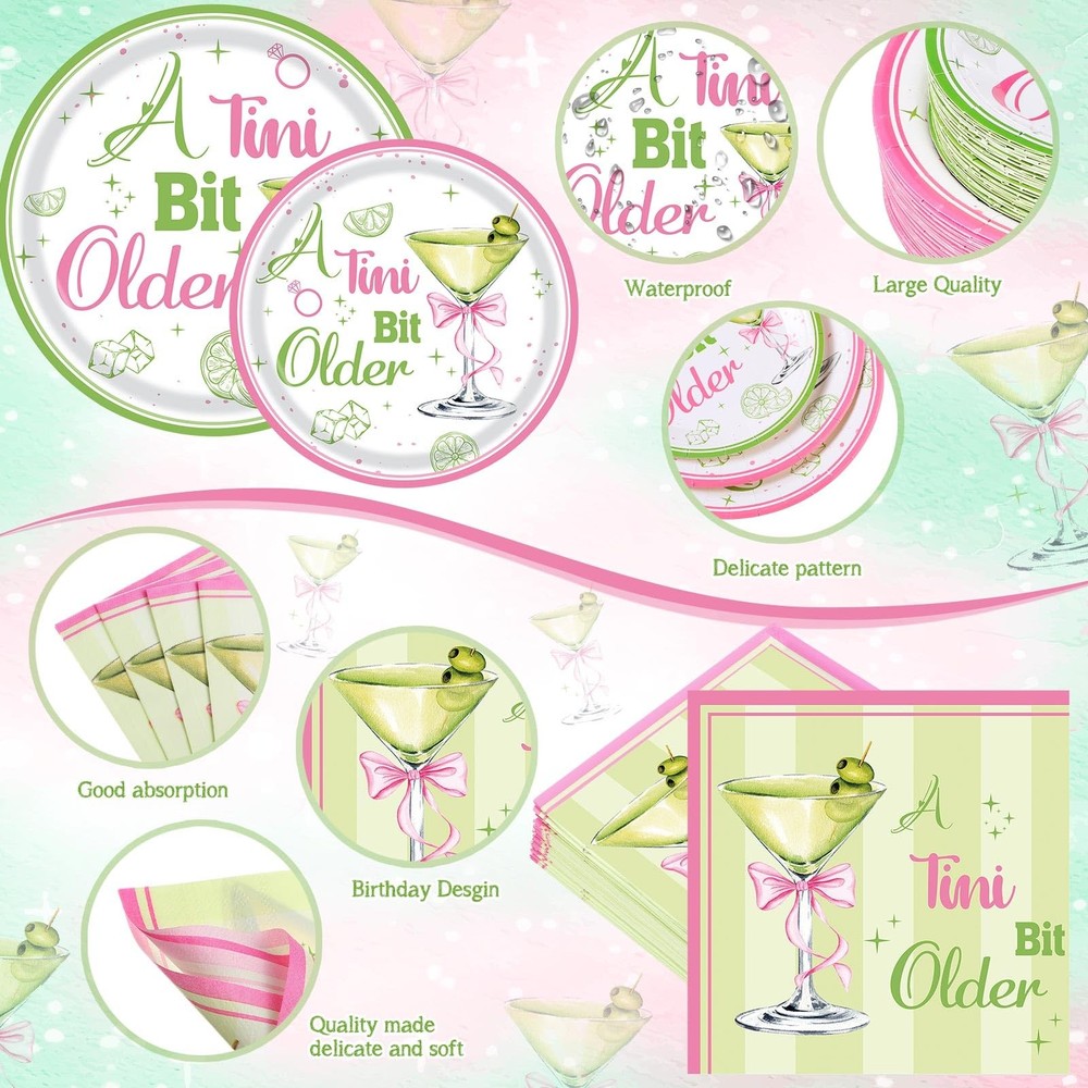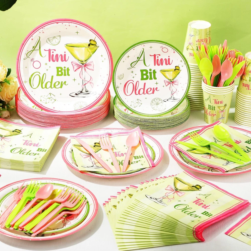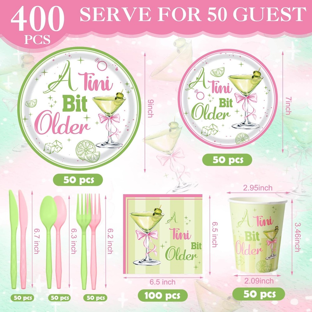 Features: Our paper plates come in both 7 and 9 inches sizes, possibly fitting a variety of foods. The 9oz cups are convenient for drinks, and the 12.99 x 12.99-inch napkins are excellent at coping with spills and messes The package includes everything necessary for a party: 100 plates, 50 cups, 100 napkins, and a cutlery set of 50 spoons, forks, and knives. All you need, the set for hassle-free preparation and coordination Specifications: Material: Plates: paper Cups: paper Napkins: paper Spoons: plastic Forks: plastic Knives: plastic Color: pink green Size: Paper plates: about 7 inches and 9 inches Cups: about 9 oz Napkins: about 12.99 x 12.99 inches/ 33 x 33 cm Package includes: 100 x Plates 50 x Cups 100 x Napkins 50 x Spoons 50 x Forks 50 x Knives Notes: Manual measurement, please allow slight errors on size. The color may exist a slight difference due to different screen displays A Tiny Bit Older Party Supplies Set: the package includes 50 pieces of 9 inches paper dinner plates, 50 pieces of 7 inches paper dessert plates, 50 pieces of 9 oz paper cups, 50 napkins, 50 plastic forks, 50 knives and 50 spoons, durable and abundant quantity tiny bit older party dinnerware set to allow you serve 50 guests at one time Quality Material: the plates, cups, and napkins are made from paper, sturdy; The spoons, forks, and knives are made of firm plastic that allows for comfortable use and can withstand the weight and texture of various foods Exquisite Design: this a tiny bit older birthday decorations features pink and lemon green as main colors, with a playful martini glass with a playful olive on the top and printed with "a tini a bit older", the martini and bow pattern will make your party more fun and bring you a memorable and impressive experience Easy to Use: using our martini themed disposable tableware saves you time and energy; Setting up is a breeze as you just need to unpackage the items; After the party, clean up is quick and effortless as the items are disposable; Spend more time enjoying the party and less time worrying about the aftermath Wide Application: our colorful martini theme party supplies are suitable for most of parties, such as birthday celebrations with your family and friends, hot pink green, bachelorette parties or for just fun-filled daily meals; Shrieks of joy will be your reward when you use these fun and unique party tableware sets
