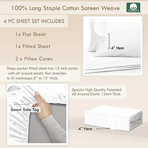 Menu 1. We require immediate payment. 2. We currently accept payment via eBay managed payments only. 3. Once payment is cleared, we will dispatch your shipment within 1-3 business days. Please refer to the "Shipping" tab for more information regarding shipping speed to your destination. 400 Thread Count Queen Cotton Sheets Set White, 100% Long Staple Cotton Sheet Set, Soft Cotton Bed Sheets Deep Pocket fit Upto 15” (White Queen 100% Cotton Sheets) Product description COMFORT & BREATHABLITY provided by using specially compacted yarns made from 100% Long Staple Cotton. The Long Staple Cotton Sateen Weave Bed Sheets are Sweat Wicking and Temperature Balancing to keep you cool during summer and warm during winters. These pure natural cotton sheets are distinctively breathable, durable, and smooth. They get softer with each wash. The special color range is selected in such a way that it will look good with almost any color of Duvet Covers. PERFECT FITTING The cotton sheet set includes deep pocket fitted sheets with specially patented stitching patterns using high-quality all-around elastic. They fit mattresses from 8” to 15” thick. Queen Size Top sheets: 90” x 102”; Fully Elasticized Fitted sheet with deep pockets: 60” x 80” + 15”; 2 Pillowcases: 20” x 30”. The Queen Size Flat sheets & Pillowcases have a stylish 4 inch Hem detailing. AUTHENTICATED 400 THREAD COUNT Cotton Sheet Sets Queen size are soft with everlasting comfort of Luxury 5 Star Hotel at an AFFORDABLE price. EASY CARE AND MAINTENANCE - These 400 TC Queen sheets with Fade Resistant Dyes stay bright after extended use. Machine wash warm on gentle cycle, tumble dry low. Contact with bleach/bleaching agents contained in certain detergent and skin creams may lead to color loss. SUPERIOR QUALITY STANDARD: Individually Tailored, Measured and Quality Checked (piece by piece). It is OEKO-TEX Standard 100 certified an independent certification system that ensures our textiles meet high safety standards to keep your family safe and healthy. All fabric used are 100 % Eco friendly, Chemical free and certified AZO FREE, making it soothing for even the most sensitive skin. BUY RISK FREE! SATISFACTION GUARANTEED: We are so confident in the quality of our product that we offer a satisfaction . If you are unsatisfied, contact us through seller tab to return the product for a refund. It’s an Ultimate gift idea for Mom, Dad, Son, Daughter, Valentines Mothers Father’s Day, Thanksgiving, and Christmas New Year presents. Best for any bedroom even your guest room or in vacation home. PLEASE MESSAGE US IF YOU HAVE ANY OTHER QUESTIONS, AND MANY THANKS FOR READING ALL OF THIS. Copyright ©#. All Rights Reserved.