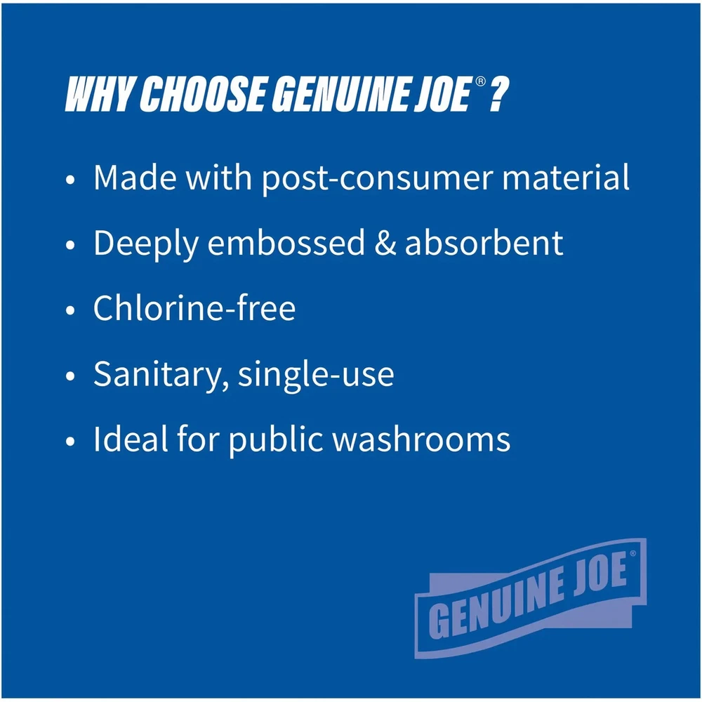 4000 White Paper Multifold Towels Bulk C-Fold Recycled Fiber Genuine Pack of 16 Genuine Joe multifold towels facilitate hands-free dispensing to help prevent cross-contamination. Interfolded towels encourage faster traffic and cleaner restrooms. Deeply embossed design offers thickness and preferable feel. Ideal for public environments. Each bundle includes 250 towels. One-ply towels are made from a high percentage of recycled fiber with post-consumer material that easily exceeds EPA guidelines. Embossed and facilitates hands-free dispensing to help prevent cross-contamination Interfolded towels encourage faster traffic and cleaner restrooms 15% post-consumer material Neutral white color Embossed design wicks away moisture for fast, effective drying Size: 9.50" x 9.10" (9.06" x 3" folded) 250 one-ply sheets/pack, 4000/carton Designed for easy use in most standard, single-sheet paper towel dispensers 16 packs per box, each pack contains 250 multifold hand towels
