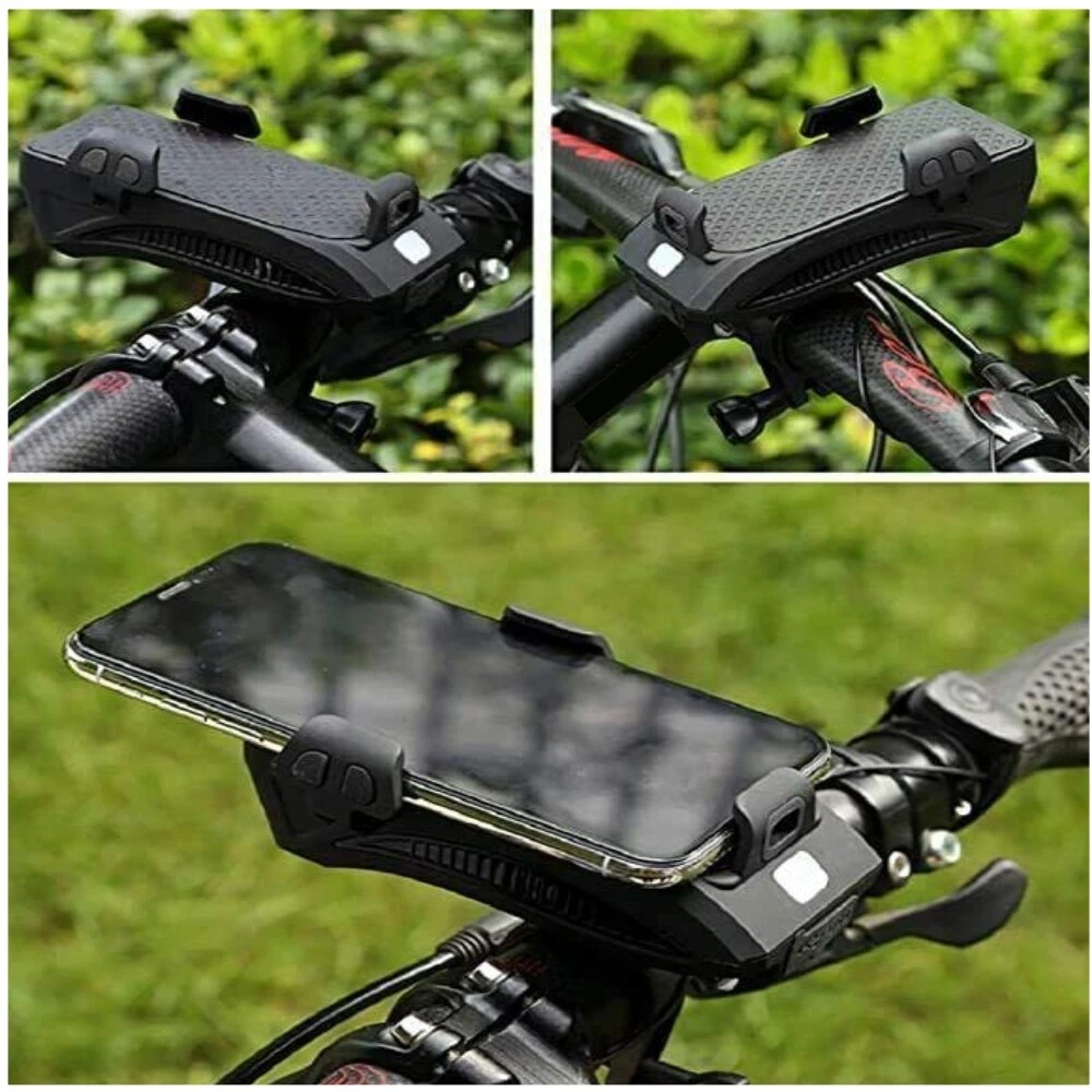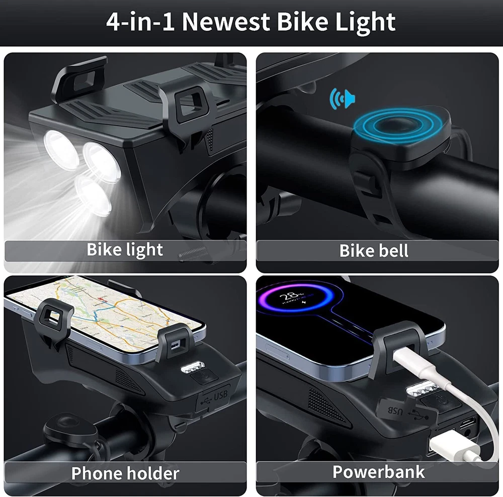 Product Description 【USB Rechargeable&Power Bank】 Built-in High-capacity 4000mAh rechargeable batteries. It only takes 2 hours to fully charge with an extra-long run time. USB bike light can also charge your mobile phone or provide lighting, Even if you are outdoors, you no longer have to worry about your phone running out of power or being dark. 【3 LED Beads & 3 Modes】 The Bike Headlight is equipped with 3 professional LED lamp beads adopt German advanced technology produces ultra bright light which making your bike stand out. Features 3 lighting modes (High,Low,Flash) for choosing according to your needs. Enhance the safety during night riding. 【Waterproof-Rainproof-Anti-Snow】 Made of premium material, it has excellent impact resistance, heat dissipation and corrosion resistance. Waterproof bike headlight against splashing water from any angle. 【Multi-Functional】 This LED bike light set is versatile enough for cycling, hiking, camping, or any outdoor activity and can be used as phone holder, emergency flashlight and powerbank. And built-in horn with 5 sound modes, the highest decibel can reach 130dB, you can easily press the button to warn others in an emergency. Note:As phone holder, adjustable width(55-90mm), suitable for most mobile phones(4-6.5 inch) Specification: Color:Black Material: ABS Size: width 60MM* length 120MM Chuck range: 50-80MM (4-6.3 inch mobile phone) Charging type: USB charging Charging time: 5 hours Battery capacity: 4000mAh Output voltage / current: 0.8A Headlight brightness: 40000LM Lamp type: LED lamp beads *3 Speaker decibel: 130 decibels Sound mode: 5 sound modes Mobile phone size requirements: 4-6.3 inch mobile phone Packing List: 1x Bike Headlight
