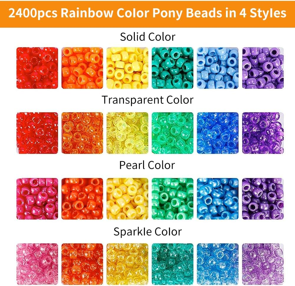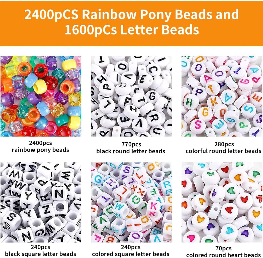 【Package contains】Each package contains 2 boxes, 20m crystal string and 30m elastic string. The large box contains 2400pcs rainbow pony beads. These colorful beads have 6 colors: red, orange, yellow, green, blue, violet and 4 styles: solid color, pearl color, transparent color, sparkle color. The small box contains 1600pcs letter beads in 5 styles. 【Quantity & size】The pony beads bulk has 4000pcs beads in total. Rainbow kandi beads are 69mm and about 100pcs per color. Flat round letter beads are 4x7mm, contain 280pcs colored flat roung letter beads and 770pcs black flat round letter beads. Square letter beads are 6x6mm, contain 240pcs colored square letter beads and 240pcs black square letter beads. The pony beads kit also contains 70pcs colored flat round heart beads. 【Well packaged】The kandi beads kit and letter beads are placed in two storage boxes with 24 separate grids. These craft beads will not be mixed together even if they are shaken. In addition, these boxes can be used to store other things besides beads. 【Widely used】The pony beads kit can be used to make jewelry bracelet necklaces, couple souvenirs, pet collars, key rings or hang anywhere as a special mark of the name to make your life more meaningful and becomes a special self. It is especially suitable for all beads threading in the existing combination with 20m crystal cord and 30m elastic string. 【Notice】The plastic beads are made of premium quality acrylic. No need to worry about quality, but children should use them with adult supervision and avoid getting into their mouth due to curiosity. Product Description Package Included 2400pcs rainbow pony beads 280pcs colored round letter beads 770pcs black round letter beads 240pcs colored square letter beads 240pcs black square letter beads 70pcs heart beads Size rainbow pony beads: 6*9mm flat round letter beads: 4*7mm square letter beads: 6*6mm 20m crystal cord and 30m elastic string Wide Usage A perfect DIY beads set for craft, making friendship bracelets, name necklaces, rings, hair braids, etc. This is the ideal holiday or birthday present for children.