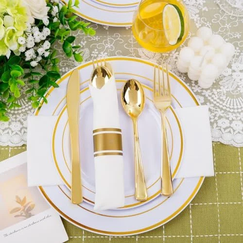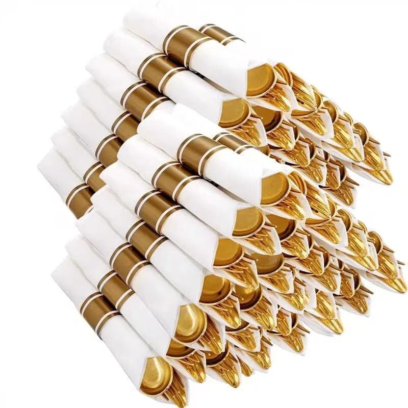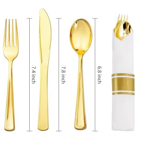 Non-Toxic: The pre rolled gold plastic silverware sets are made of 100% food grade plastic, BPA free and no-toxic. Our gold plastic cutlery are heavy duty plastic utensil, they are durable and sturdy. Elegant and Convenient: The Gold disposable cutlery feel smooth and shiny, maintaining the standard of luxury you want. The wrapped disposable silverware set are very clear and Convenient for you dinners. You can throw them away afterwards without having to wash them. Value Packaging: This is a large capacity packaging of gold plastic flatware. The 100 pack includes 100 forks, 100 knives, 100 spoons, and 100 wrapped napkins. This plastic silverware is perfect for large parties or weddings. Suitable for All Occasions: You can use this heavyweight gold plastic silverware in any occasions. Classic design whether it is a business meeting or a birthday party, including all formal and informal events. Such as anniversaries, tea parties, wine tastings, wedding receptions, engagement and graduation parties, fancy restaurants, big lunches, etc. Soft Napkins - We've made sure these napkins are the softest, plushest most absorbent napkins available. By the way, We have 24 hours online after-sales service.