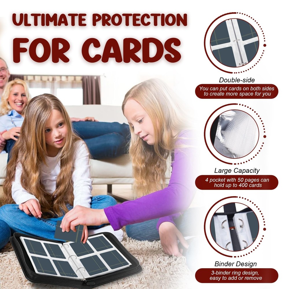 The surface of this card collector binder is made of premium-quality PU leather, which is waterproof, scratch-resistant and not easy to deform. The fully closed zipper design protects the card in all directions, and the card will not fall out when you hold the card binder at any angle. Quality zipper seals the binder to keep cards intact Massive Storage Capability - The baseball card binder has 50 double-sided protective sheets to hold up to 400 cards. The cards can be stored in an orderly manner, instead of throwing them everywhere, which helps children develop good storage and organization habits Premium Protection - The card holder binder constructed with thickened PU leather exterior to prevent scratches, bending and UV damage, ensure long-lasting protection and keep your trading cards in mint condition for decades Multi-protection for Your Cards - This sports card binder adopts a closed zipper design to prevent the card from falling. The protective sheets are made of thick waterproof material, dust-proof and moisture-proof, which effectively protects the card from fading and staining Wrist Strap Design - Card collection binder adopts a humanized wristband design, and you can hang it on your wrist when you go out, easy to carry. The stainless steel 3 ring buckle can be easily opened and is not easy to scratch your hands, and it is convenient to increase or decrease the card sleeve - suitable for expanding collections of trading cards and sports cards Wide Application - The card holder binder not only can store game cards, business cards, photos, and other standard-size cards but also can as present for Thanksgiving, Christmas, birthdays, and other holidays for children, adding different fun to them