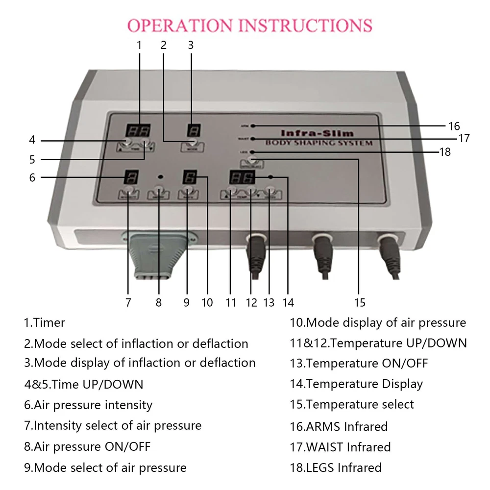 Technical Parameter Voltage: 110V Frequency: 60Hz Power: 400W Material: Sheet metal+ABS Max Time: 90 minutes Temperature Range: 35°C to 80°C,optional AirPressure INTENSITY: 1-7 levels,adjustable Massage PARTS: LEGS、FEET、WAIST、ARMS Massage Mode: 1,2,3,4,5,6 Gross Weight 14.0KGS(All accessories included) Packing Dimension 56CM(L)x37CM(W)x37CM(H) Package Including 1x host 1x Costume 1x trachea 1x Power line 1x manual 400W Air Pressure Lymphatic Drainage Pressotherapy Weight Loss Slimming Machine 400W Air Pressure Pressotherapy SPA Body Contouring Machine Massager Weight Loss Working Principle This system combines functions of Far-infrared ray heating and Airpressure massage therapy.Airpressure therapy is also called pressotherapy that aims to massage the whole body so that to promote blood circulation、eliminate body muscle tiredness、tighten skin and improve body metabolism.Far infrared heating further helps speeding up body discharges sweat so that to get rid of toxins,quickly burns redundant fatness/cellulite.Both combination, it can achieve the effects of weight loss、body contouring and health-keeping. Main Effects 1.Lymphatic drainage. 2.Burning fat to lose weight. 3.Contouring body and keeping fit. 4. Perspiration detoxification,discharge heavy metals along with sweat,promote the metabolism. 5.Relieve rheumatism and cold,unclog the meridian,reducing body fatigue and relieving stress. 6.Activate,purificate and optimize the blood cells and body tissues,improve body immunity. 7. Stimulate body circulation system, promote blood circulation, strengthen and cultivate Viscera. 8.Enhancing medication/nutrition lead-in and obsorption. Technical Parameter Voltage: 110V Frequency: 60Hz Power: 400W Material: Sheet metal+ABS Max Time: 90 minutes Temperature Range: 35°C to 80°C,optional AirPressure INTENSITY: 1-7 levels,adjustable Massage PARTS: LEGS、FEET、WAIST、ARMS Massage Mode: 1,2,3,4,5,6 Gross Weight 14.0KGS(All accessories included) Packing Dimension 56CM(L)x37CM(W)x37CM(H) Package Including 1x host 1x Costume 1x trachea 1x Power line 1x manual Forbidden Crowd 1.Pregnant women. 2.Women have not completely recovered from childbirth. 3.Women with menstruation. 4.The persons with high blood pressure. 5.The persons with heart disease and serious diabetes. 6. The persons with serious skin diseases. 7.The persons with metal rack inside the body. 8.Minors are prohibited from using it. 9.Do not use in patients with internal injury Statement (FDA, ARTG) The sale of this item may be subject to regulation by the U.S. Food and Drug Administration and state and local regulatory agencies. If the item is subject to FDA regulation, I will verify your status as an authorized purchaser of this item before shipping of the item. If you have questions about legal obligations regarding sales of medical devices, you should consult with the FDA's Center for Devices and Radiological Health: https://www.fda.gov/cdrh/devadvice/ https://www.fda.gov/cdrh/industry/support/index.html Thank you for your cooperation. Statement (FDA, ARTG) The sale of this item may be subject to regulation by the U.S. Food and Drug Administration and state and local regulatory agencies. If the item is subject to FDA regulation, I will verify your status as an authorized purchaser of this item before shipping of the item. If you have questions about legal obligations regarding sales of medical devices, you should consult with the FDA's Center for Devices and Radiological Health: https://www.fda.gov/cdrh/devadvice/ https://www.fda.gov/cdrh/industry/support/index.html Thank you for your cooperation. Payment Delivery details Terms of sales About us Contact us Payment We accept ebay payment 。 Fees such as import duties, taxes are not included in the item price or shipping costs. These charges are the buyer's responsibility. Delivery details Shipping: 2-9 working days to: USA Terms of sales We maintain high standards of excellence and strive for hundred percent customer satisfaction. Feedback is very important to us. We hope that you contact us immediately before you give neutral or negative feedback, so that we can address your concerns. It is impossible to address issues if we do not know about them! About us Your satis faction is our ultimate goal. We work hard to earn your trust and future business. Our certified technicians have tested each item before shipping. The unit comes with 1 year limited warranty on all manufacturing defects. a) If you receive a defective item, you may return it or ask for a discount. Please contact us within 14 days after you receive the package. b) What you returned must be intact and in its original packaging as re? u. Customer is responsible for shipping costs of the returned item. c) We will cover the cost of shipping back t with the shipping rate indicated in the registration page. We will send you a new unit or refund the full payment you paid. Thank you. Contact us Business Hour Business Hour: Monday To Friday: 8:30 AM to 5:00 PM (Beijing China time) Due to time zones, our reply to your questions may not be immediately. But within above working time, we will reply your email within 24 hours. If it's non-workdays, please kindly be patient and wait till Monday. Please contact us with ebay message. Please feel free to contact us if you have any questions. Monday To Friday: 8:30 AM to 5:00 PM (Beijing China time) Due to time zones, our reply to your questions may not be immediately. But within above working time, we will reply your email within 24 hours. If it's non-workdays, please kindly be patient and wait till Monday. Please contact us with ebay message. Please feel free to contact us if you have any questions. Type Anti-Cellulite Massager Brand Unbranded Body Area Full Body MPN Does Not Apply Model Infra-Slim 600 Voltage 110 V Material ABS Features Multispeed Massage Functions Air Compression Color Purple Power Source Corded Electric Machine Type Body Shaping System Frequency 60Hz Max Tim