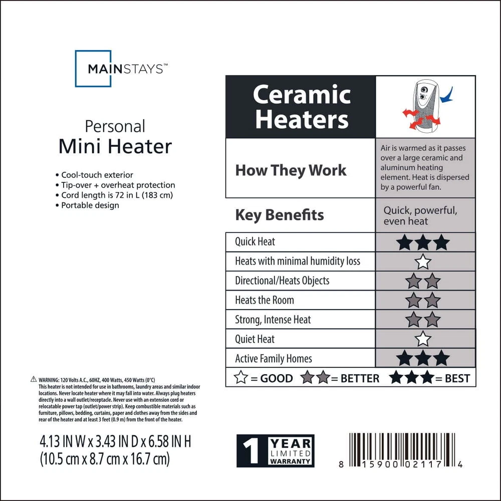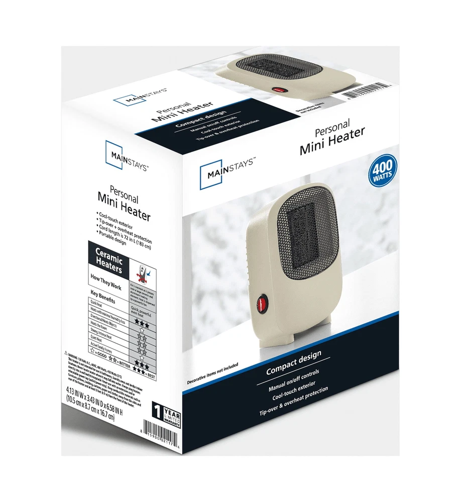 Mainstays Personal Mini Electric Ceramic Heater 400W,Space Heaters for Inside, Portable Electric Heater for Home , 400W Mini Heater, PTC Ceramic Fast Safety Energy Efficient Heater for Office ,Bedroom. Compact 400W Ceramic Fan Space Heater, Portable Mini Desk Electric Warmer, Overheat & Tip-Over Protection, Low Noise Quiet Fast Heating. Experience enhanced comfort with Mainstays Mini Ceramic Heater. This item is a portable, energy-efficient solution that provides just the right amount of heat for you. Use this Mainstays heater anytime at home, at school or in the office. Designed with ceramic technology that provides fast, even heating, it only uses about 400 watts. This Mainstays electric heater has a modern, compact design that fits just about anywhere. Use it on or underneath desks, tables and work spaces. The overall look is sleek and streamlined, blending with most interiors. You can even choose between four colors to suit your personal taste and environment. Space Heater: Introducing the New Portable Out Compact 400W Space Heater, your ideal solution for bringing warmth to small spaces at home or in the office. Its compact design easily fits on desks or tables, perfect for personal heating needs. This heater quickly creates a cozy indoor environment, heating up in just 2 seconds, so you can enjoy warmth almost immediately. Desktop Space Heater: Wattage: 400W Heating method: Ceramic heating Working Condition Feature: Switched off automatically for overheat and tip-over Condition: New Features include: - Quick 2-second heat-up time for instant comfort. - Quiet operation, ensuring your peace and tranquility are undisturbed. - A safe and easy-to-use on/off switch for hassle-free operation. - Tilt safety switch, enhancing the safety by automatically turning off if tipped over. It's not just a heater; it's your personal comfort companion during the colder days Mainstays 400W Personal Electric Ceramic Mini Heater for Home,Indoor Use Only,New Experience enhanced comfort with Mainstays Mini Ceramic Heater. This item is a portable, energy-efficient solution that provides just the right amount of heat for you. It's a good choice for virtually all personal spaces, such as bedrooms, cubicles and more. Use this Mainstays heater anytime at home, at school or in the office. Designed with ceramic technology that provides fast, even heating, it only uses about 400 watts. This Mainstays electric heater has a modern, compact design that fits just about anywhere. Use it on or underneath desks, tables and work spaces. The overall look is sleek and streamlined, blending with most interiors. You can even choose between four colors to suit your personal taste and environment. PTC heating element Flame Resistant, Overheat Protection, Tip-Over Protection Fully assembled Condition: New