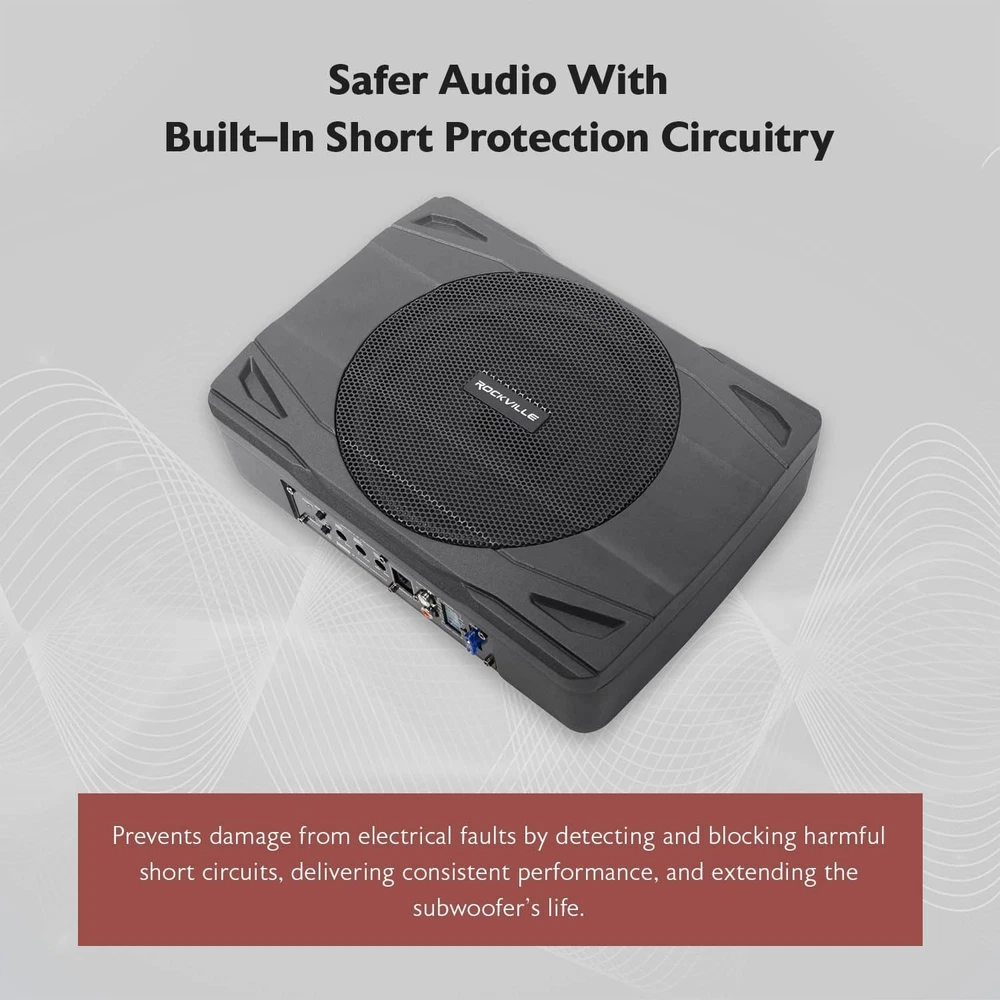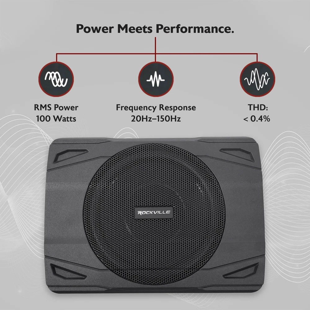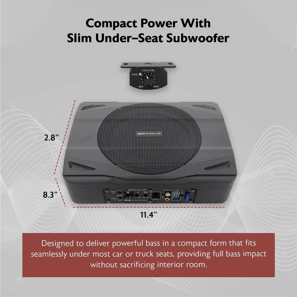 DEEP BASS PERFORMANCE: Delivers 400W peak power with an 8" subwoofer for rich, immersive low frequencies in your car or truck audio system. SPACE-SAVING DESIGN: Slim 2.8" profile fits under most vehicle seats, maximizing space while providing powerful bass for small cars, trucks, or SUVs. BUILT-IN AMPLIFIER: Integrated amp simplifies setup, with high-level inputs and auto turn-on technology, plus adjustable controls for bass, phase, and gain. EASY INSTALLATION: Includes mounting hardware and remote bass knob for quick setup; compatible with factory or aftermarket audio systems. DURABLE CONSTRUCTION: Cast aluminum enclosure helps dissipate heat and keeps the subwoofer cool, ensuring long-lasting, reliable performance. The Rockville SS8P 400W 8" Slim Under-Seat Active Subwoofer brings powerful, deep bass to your car or truck audio system without sacrificing space. Designed for vehicle owners seeking high-quality sound, this compact subwoofer fits under most seats, making it ideal for small cars, trucks, or SUVs. Its built-in amplifier and adjustable controls deliver tailored audio performance, perfect for music lovers and daily commuters. Powerful Audio: 400W peak power with an 8" subwoofer produces rich, low-frequency sound for an immersive listening experience. Compact Fit: Slim design saves trunk space, fitting seamlessly under seats in various vehicle types. Simple Setup: Built-in amplifier and included wiring kit make installation straightforward, compatible with most car audio systems. Customizable Sound: Adjustable bass, phase, and gain controls allow precise tuning to match your audio preferences. Reliable Build: High-quality materials withstand the demands of daily driving, ensuring consistent performance. Whether you're boosting your music for road trips or enhancing your commute, the Rockville SS8P delivers professional-grade audio in a compact, easy-to-install package.