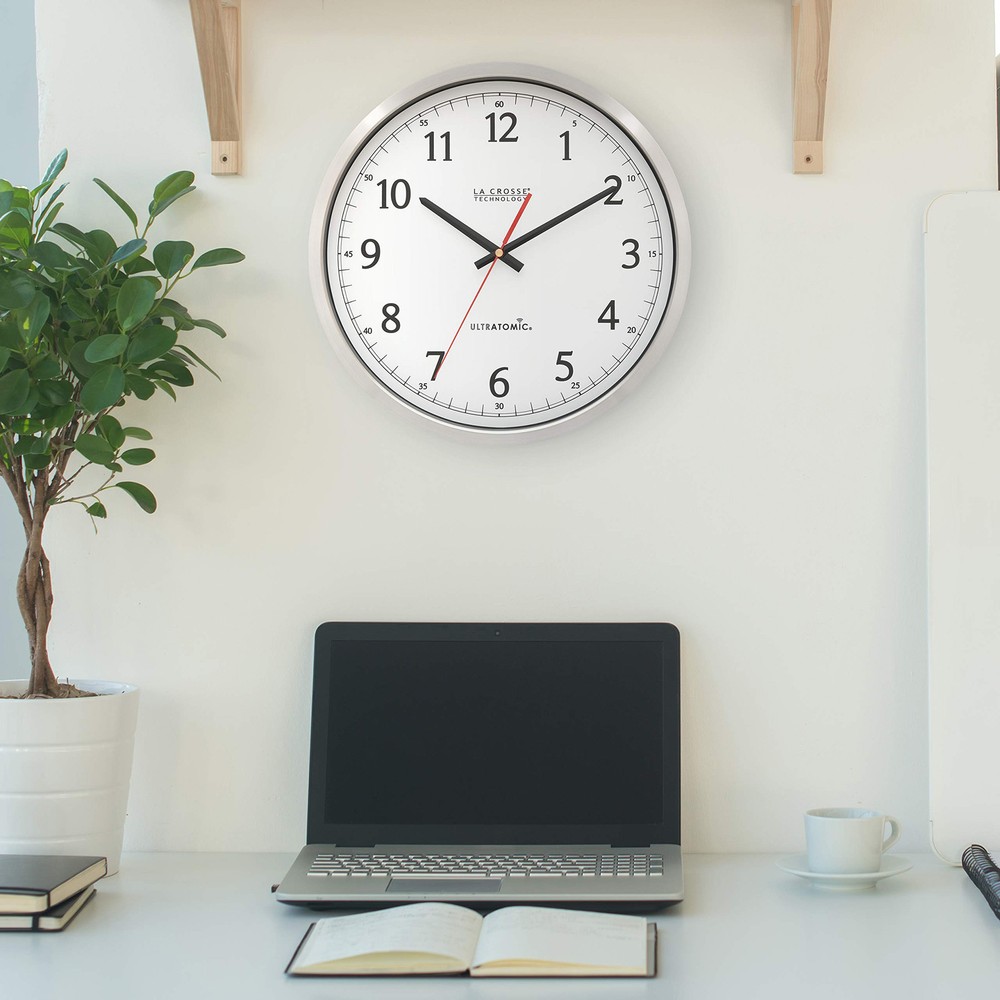 The UltrAtomic wall clock features the most accurate atomic movement on the market. Like a traditional atomic clock, this clock automatically sets itself and updates for Daylight saving time. However, this clock is equipped with two antennas that allows it to work in the nosiest, hostile electronic environments such as busy office buildings, hospitals, or other institutions. With this enhanced reception UltrAtomic clocks increases the WWVB signal reliability and penetration. No more worrying about changing out batteries every year, with its additional battery compartment you’ll keep your UltrAtomic clock running longer. This feature keeps the batteries in your clock running for approximately 3 to 5 years before you would need to replace. Optional ECO-MODE feature is a battery saving feature that will pause the second hand at 12:00 during the hours of 11:00pm-5:00am. Wrapped in a modern 14" stainless steel frame with a plastic shatter-proof lens, this clock attracts in a commercial or residential space. [5-YEAR BATTERY LIFE] – A quality set of 4 “C” batteries will keep the clock running for up to 5 years – an impressive feat offering unparalleled convenience and peace of mind [ROBUST RECEPTION] Dual antenna provides best reception to WWVB time broadcast, even in heaviest electronic traffic areas such as hospitals or commercial buildings [CUSTOM TIME SET] Select from 4 USA time zones or Customize to any World Time [METAL FRAME] Stainless steel polished silver frame and shatter-proof lens [ECO-MODE] Optional Eco-mode feature also saves battery life; Q-MODE (Quartz mode) sets to any manual hour