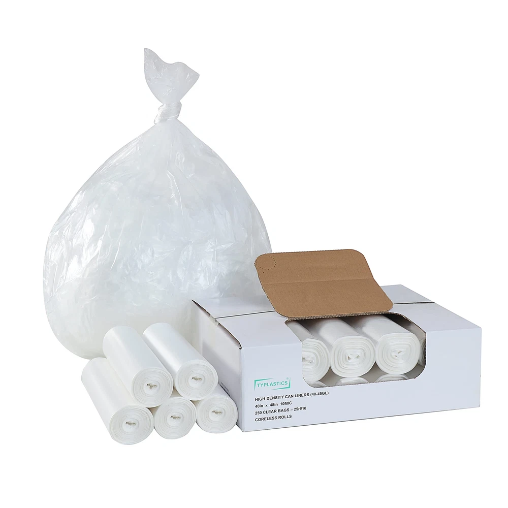 40-45 Gallon Can Liners: 250 count. Scent free. Size: 40" x 48". Packing: 25 clear bags per roll, 10 rolls per box. Fits most 40-45 Gallon trash cans: Bags are made from high performance polyethylene, Star Seal Bottom allows for Even Weight Distribution, Tear Resistance, Leak-Proof, and Easy Removal from Trash Bin. Cost Efficient Multipurpose Bags: 250 durable bags are neatly packaged on Perforated Coreless Rolls for Clean Storage and Easy Dispensing. Recommended for carrying mediumweight trash without sharp edges, such as yard leaves, clothes, styrofoam, paper, plastic bottles for recycling, and etc. in office, home, yard, hotel, home, kitchen, bathroom, and more Institutional janitorial needs. Environmentally Friendly: Our Bags are manufactured using 20% Less energy without sacrificing the performance to reduce our carbon footprint.