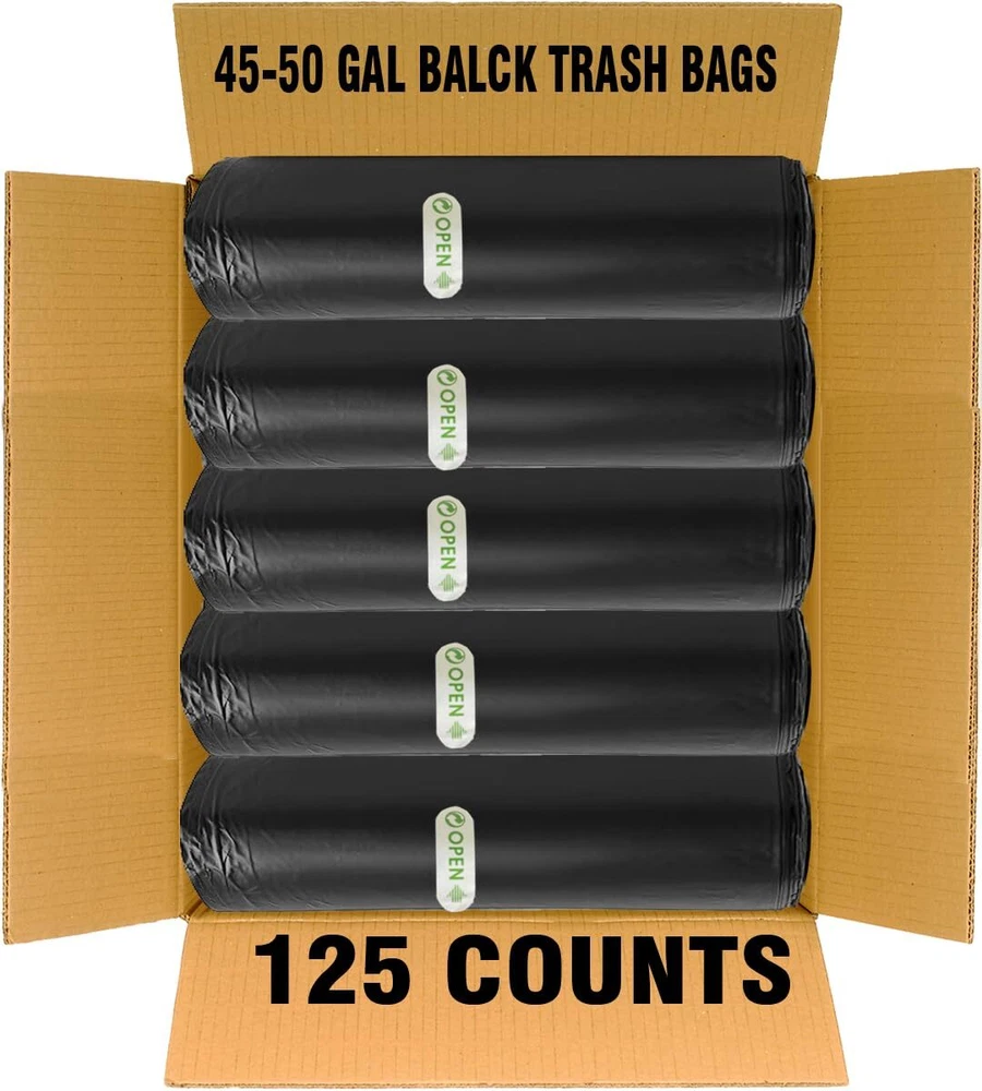 1, Product information: 40-45 gallon large balck plastic recycling trash bags, Size: 40" x 48"x 14 mic, Total 125 bags bulk (25 PCS/ROLL, 5 CORELESS ROLLS/CTN), Perfect for 40-45 Gal Capacity Office, commercial, industrial, or residential waste. 2, Reducing the use of plastic, the high-density polyethylene film trash bags are designed super lightweight and thin, and their durability is not compromised in any way. They can handle a wide range of waste without puncturing or tearing for everyday cleaning needs. 3, High quality customized garbage bags design, Star seal at the bottom can increase the load carrying capacity, leak-proof trash bin liners does not break or tear easily. 4, Open simply and easily, Coreless rolls in dispenser box for easy use and neat storage, easy to pull apart and easy to open.It can also be used as a gift wrapping, 5, Our liners are perfect for cleaning purposes in municipal, institutional and industrial environments, Compatible with most commercially available standard buckets, bins and tanks,Choose our bulk cost-effective options garbage bags and you'll have plenty of bags for months to come.