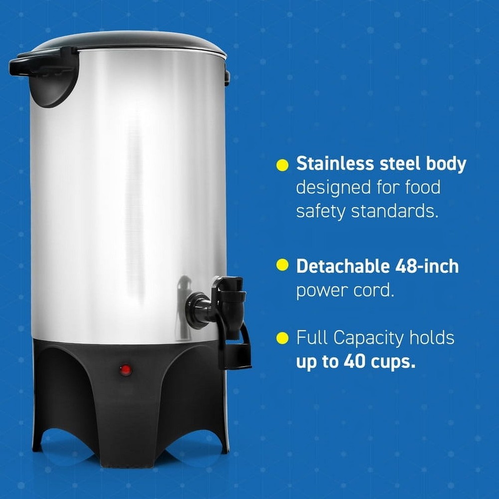 Designed to serve large parties, the 40-cup Coffee Brewer is the best solution for office breakrooms and social gatherings. Brew time is around 1 minute per cup, which means your high volume gathering will be refreshed and energized in no time! Internal water level markings allow you to fill the brewer to the desired serving amount so you can make just the right amount of coffee or plenty extra. Constructed in an attractive Stainless Steel interior and exterior for easy cleaning and a great look! Heat resistant handles and a locking lid allow for safe carrying and transport. A high flow, drip-less dispenser allows you to fill single servings or carafes with ease! Forget wasteful paper ! The Coffee Brewer features a removable for quick and easy cleaning. 40 Cup large capacity perfect for office use or at large gatherings. On/Off Power Switch Power Indicator Light Easy to read water level markings 2 way dispenser for single cup or continuous filling