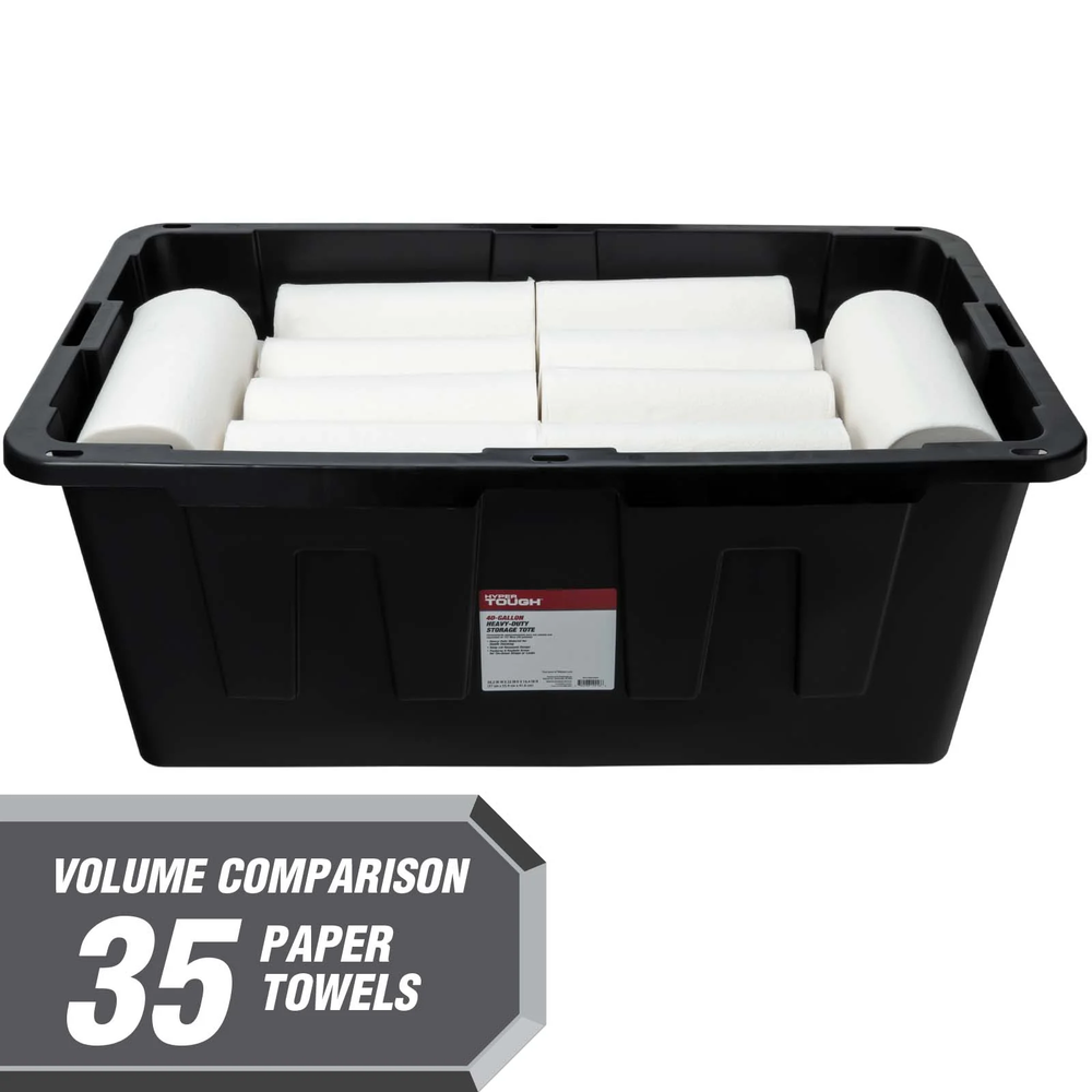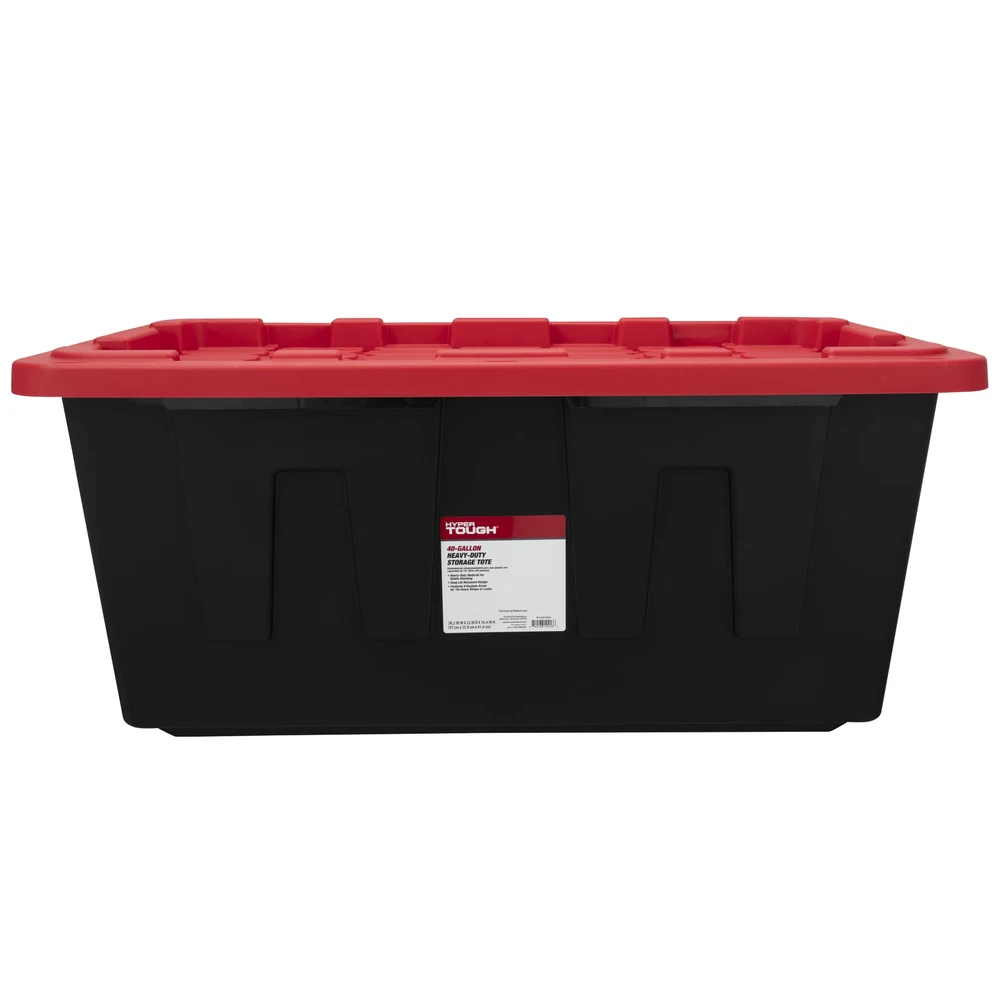 Organize clutter and hide unused items with the Hyper Tough 40 gallon snap-lid plastic storage tote. Made of durable polypropylene, the black storage tote allows you to hide away things you don’t want to be seen while the red snap-lid adds a pop of color to your space. The 2-point snap-lid ensures your items are safely secure during storage or transport. The specially molded lid allow you to stack multiple totes on top to prevent toppling and maximize storage space. Protect your valuable by utilizing the 6 tie-down holes made for zip-ties and padlocks. The long lasting Hyper Tough tote works great in basements, closets, pantries, sheds, barns, and attics. This tote is great for organizing household products, gardening supplies, pet treats and supplies, shoes, clothing, seasonal gear like boots, sporting equipment such as golf balls, tennis balls, or drill cones, and many other items. Sturdy black plastic construction resists rust, dents, stains and peeling to ensure lasting use Stackable lid design creates stability and reduce toppling when multiple storage bins are stacked Snap-Fit Lid lip keeps your content from spilling or falling out Lockable Lid comes with X holes ideal for zip-ties or padlocks to keep your items safe and secure Exterior Dimensions - 38.2 IN WX22 IN DX 16.4 IN H (97 cm x 55.9 cm x 41.6 cm) Easy to clean surface Indoor or Outdoor use Made from recycled materials Reusable Set of 1 – Includes 1 black base and 1 red lid Weight – 9.3 lbs Available in multiple sizes: 5 Gallon, 12 Gallon, 17 Gallon, 27 Gallon, 40 Gallons and 50 Gallons