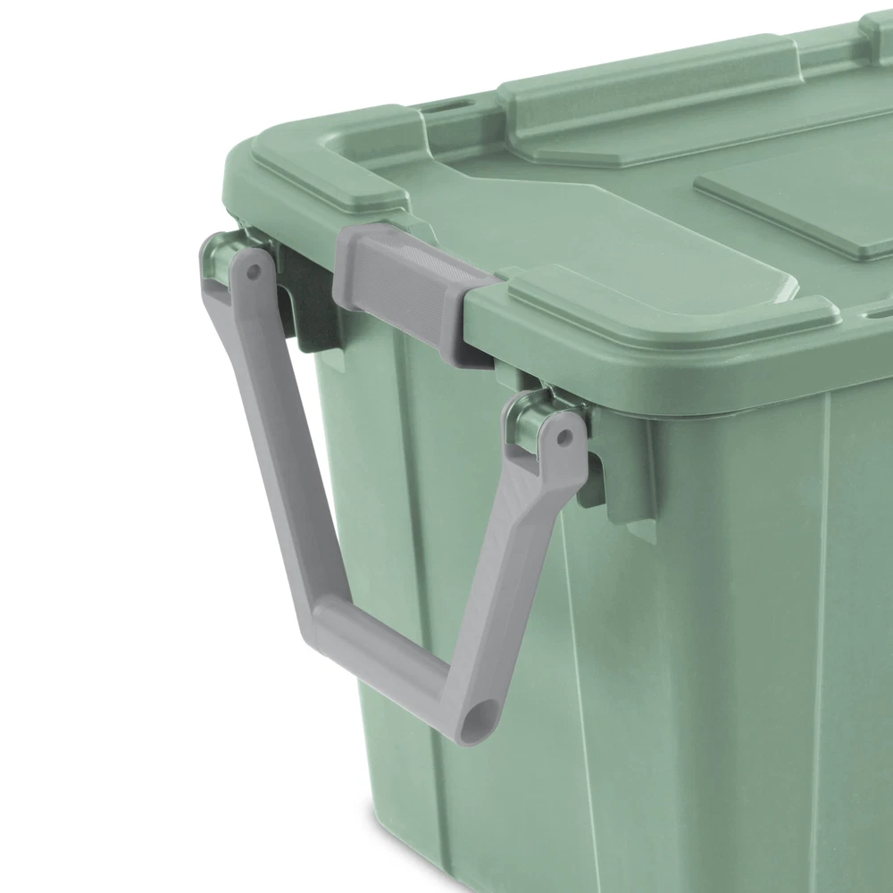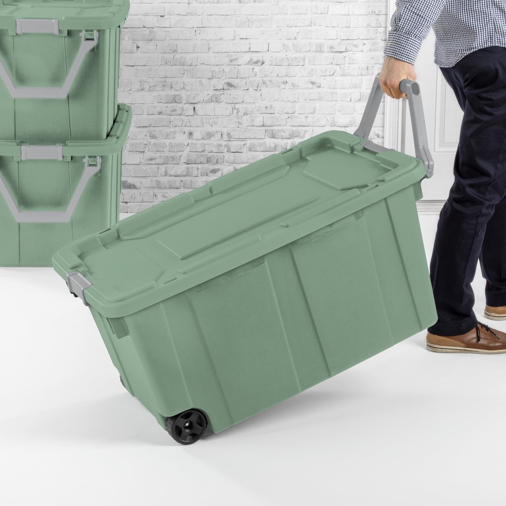 Bring order to garages, basements, and attics with the heavy-duty design and unique features of Sterilite’s Industrial Tote line. Be confident that stored items will stay protected in the durable 40 Gallon Wheeled Industrial Tote, the ideal portable solution for storing larger and heavier supplies. The grooved lid design and keyholes provide options for tie-downs to simplify transportation, and keep totes in place in the back of a pick-up truck. The ergonomic handle rotates up for easy pulling while the large wheels and metal axle allow for rolling over rough surfaces. The innovative drip-resistant lid provides maximum protection against items getting wet, while the tight-fit lid keeps items contained. The robust latches offer extra security that the lid will stay attached to the base, and the textured surface makes for a sure grip when carrying. Sterilite Adult Plastic 40 Gal. Wheeled Industrial Tote Green Sage Outside Dimensions: 36 3/4" x 21 3/8" x 18" Interior Dimensions at bottom: 30 1/2" x 16" x 17 1/8" Heavy-duty construction with robust non-slip grip latches Ergonomic handle rotates up for easy pulling and large wheels with metal axle allow for rolling over rough surfaces Deep recessed lids offer secure stacking capabilities helping to maximize available storage space Tight fit drip-resistant lid provides maximum protection against items getting wet BPA-free and phthalate-free