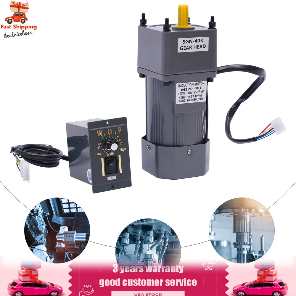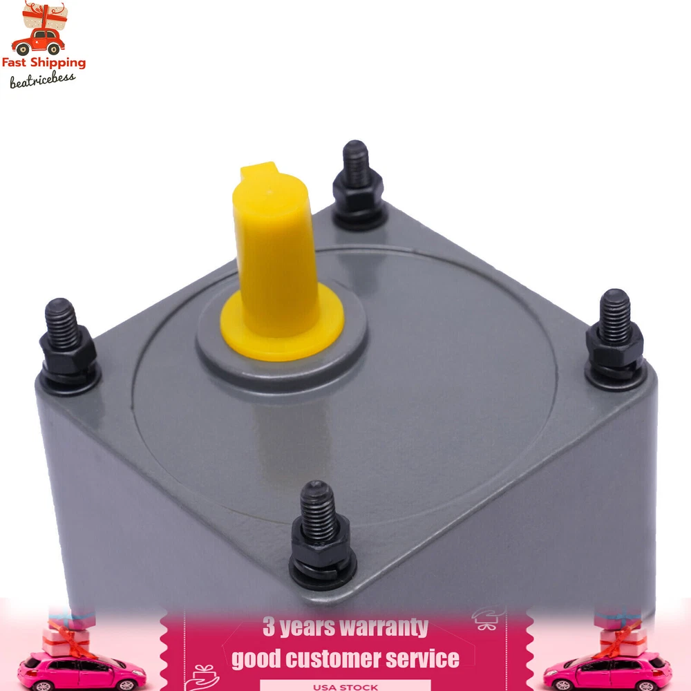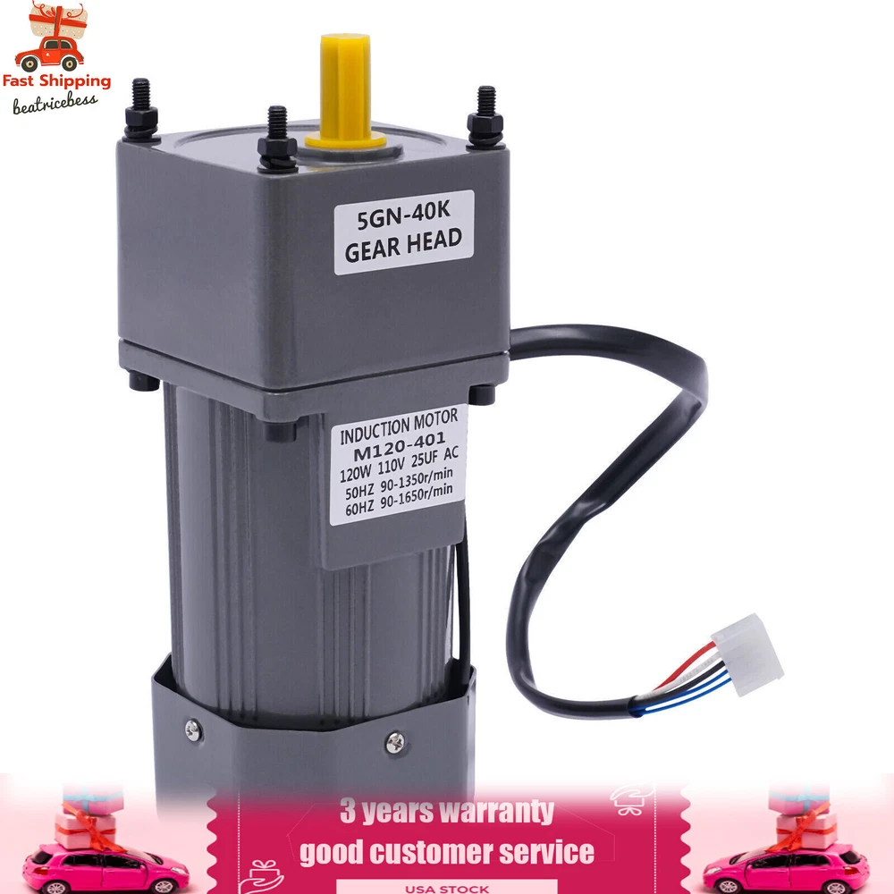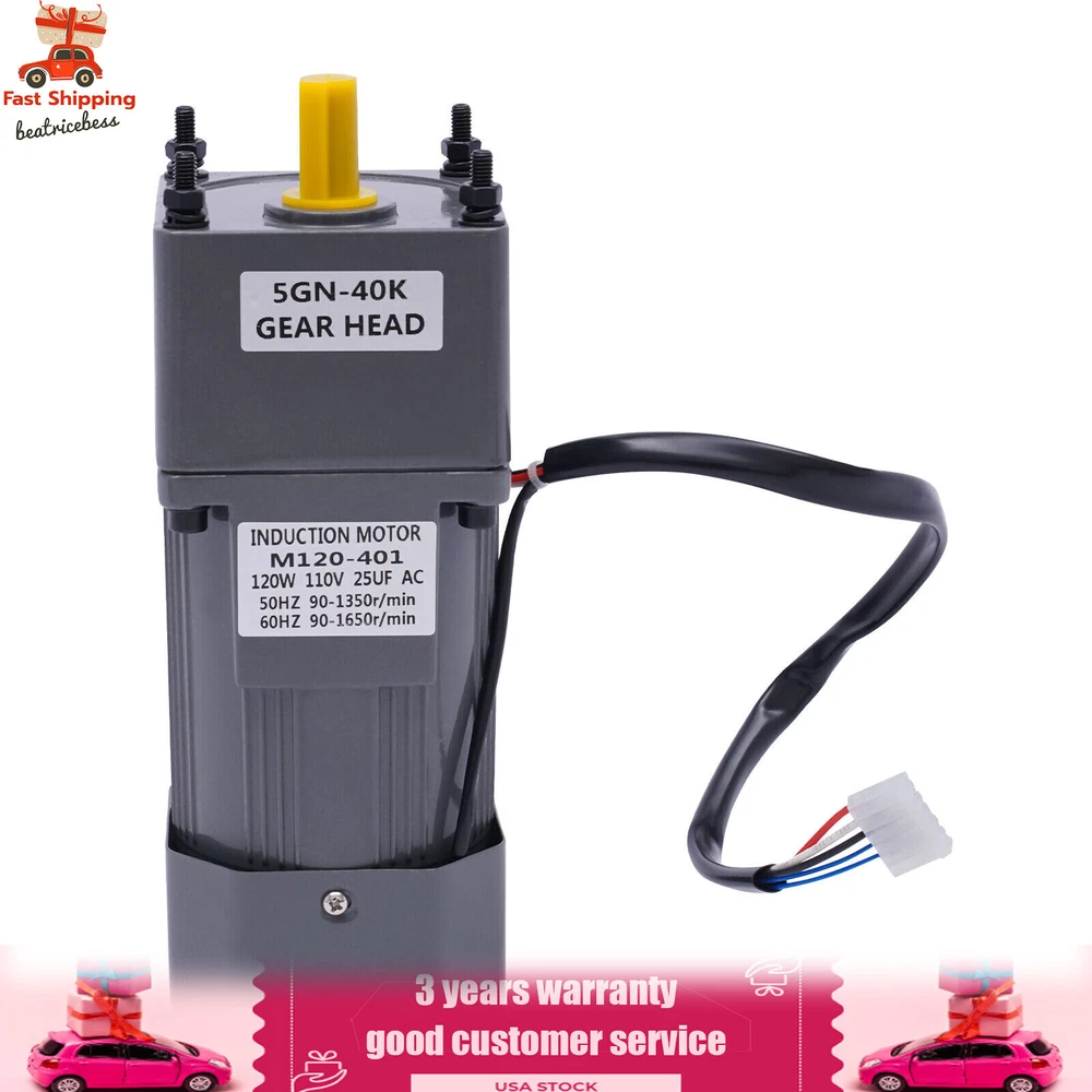 40K Gearbox Electric Motor 110V AC Geared Motor High Torque Single-phrase Gray 120W 40K 110V AC Motor Low Speed Mini Gearbox Electric Motor Barbecue High Torque 110V Geared Motor Synchronous Reduction Motor Reversible Description This is an AC 110V gear motor with 120W power, which can achieve the 1350r/min speed. It uses pure copper coils and allows for low-noise&powerful working, making it suitable for homes, handcrafts, school projects, model-churning soda machines, low-speed machines, and any other product you want. You can turn the speed control knob to adjust the motor speed, realizing the desired effect. Key Features Build to Last: Our product is made of high-quality cast aluminum shell and carburized carbon steel gear and is characterized by heat resistance, high quality, and long service life through plastic spraying, integration, and heat treatment. Speed Adjustable : With the speed controller that has various optional speeds and large torque, you can adjust different speeds according to different products to achieve the desired effect. Good Heat Dissipation: The built-in cooling fan(>60W), cooling window design on the bottom, and pure copper coils with stable performance can effectively dissipate heat to ensure long-term stable operation. Integrated Reducer: The integrated reducer with a heat treatment process improves the gear wear resistance and work efficiency. Stable Operation: Both ends of the rotor are equipped with ball bearings, which can reduce friction and temperature during use to ensure stable operation. High Safety: The slow start function can effectively avoid current overshoot and protect the motor. And it is adjustable to meet different personalized use needs. Reversing Function: It has a reversing function that is flexible with normally open and closed control systems. Easy to Operate&Assemble: With the simple structure, you can assemble this product quickly. The simple switch button and speed control knob make it easy for you to operate. Protective Package: To prevent the product from being damaged and bumped during transportation, we packed it with foam boxes and bubble pads to protect your products to the maximum extent possible. Buy with Confidence: We have been working hard to provide better service and quality for our customers, which is our goal. If there is any problem with our products, please contact us in time. Details Clear Marks: These clear number&letter marks on the machine allow for easy and convenient operation. Power Cable: The power cable has distinct colors for different wires, so you can connect them easily without confusion. Holster: The yellow holster can effectively protect the shaft when not in use. Application It is widely used in packaging, printing, textile, dyeing, chemical, food, and pharmaceutical construction machinery as well as advertising, office, petrochemical, instrumentation, stage lighting, transmission, automatic warehouse, parking, and other equipment. How to Install Please remove the holster before installation. Fix the reducer on the gear motor with four screws. Install the keyway at the keyway opening. Plug the speed controller and gear motor together (main wire to main wire). Unscrew the two AC screws on the back of the speed controller. Connect single-phase power to both AC ports (without distinguishing between zero and fire wires) and tighten the screws. Turn the speed control knob to adjust the motor speed. Install the bracket(not included) on the motor. Specifications Model: M120-401 Color: Gray Material: Cast Aluminum Gear Material: Carburizing Steel Processes: Plastic Spraying, Integration, Heat Treatment Process Type: AC Gear Motor, Induction Motor Shape: Square, Round Feature: Portable Power Phrase: Single-phrase Motor: Pure Copper Motor Noise: About 50-60db Built-in Fan: >60W Torque: 21N.m Voltage: AC 110V Power: 120W Capacitance: 25UF Speed: 50Hz 90-1350r/min, 60Hz 90-1650r/min Reduction Ratio: 1:40 (40K) Shaft Diameter: 12mm/0.47inch Shaft Length: 28mm/1.1inch Keyway: 4mm/0.16inch Key Depth: 25mm/0.98inch Dialogue Mounting Holes: 104mm/4.09inch Axis Eccentricity: 18mm/0.7inch Disc Diameter: 34mm/1.34inch Through-hole: ∅8 Gear Motor Height: 16.5cm/6.5inch Reducer Size: 9*9*6.2cm/3.5*3.5*2.4inch Speed Controller Size: 9*6*10cm/3.5*2.4*3.9inch Package Size: 28.5*24.1*12.5cm/11.22*9.48*4.9inch Net Weight: 4.96kg/10.9lbs Gross Weight: 5.3kg/11.68lbs Package Included 1* Speed Controller 1* Gear Motor 1* Reducer Notes Based on the industrial standard, to meet the different needs of customers, our motor does not include a power cord. You need to purchase a power cord to connect. The bracket is not included in this package, so you should purchase it yourself. Please do not plug&unplug the power cable when the power is on. Please do not knock or beat the machine. The speed reduction motor is composed of a motor and reducer, different speed ratios can achieve different speed regulation ranges, and they have different strengths. Under different deceleration ratios, the output shaft speed is different. The output shaft speed is equal to the motor speed of 1350 rpm divided by the deceleration ratio. When the gearbox decelerates, the greater the speed ratio, the greater the force. The slower the speed regulated by the governor, the smaller the torque. The motor can run for a long time within the safe speed regulation range. The safety speed range of a small load: is 50% of full speed-full speed; The safety speed range of a large load: is 70% of full speed-full speed. Please allow the slight color difference caused by the shooting light and 1-3cm error due to manual measurement, and make sure you do not mind before you order. Payment Delivery details Terms of sales About us Contact us Payment We accept ebay payment 。 Fees such as import duties, taxes are not included in the item price or shipping costs. These charges are the buyer's responsibility. Delivery details Shipping: 2-9 working days to: USA Terms of sales We