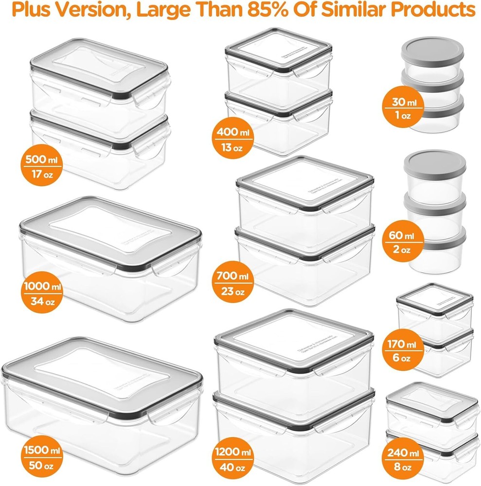 1 ~ 50 OZ - Set of 40 -- Includes 20 containers and 20 lids of varied sizes, and 2 pieces of Labels & 1 washable marker pen, To match different storage needs, This set includes 6 rectangular containers (1*50 oz, 1*34 oz, 2*17 oz, 2*8 oz), 8 square containers (2*40 oz, 2*23 oz, 2*13 oz, 2*6 oz), and 6 round sauce boxes (3*2 oz, 3*1oz). Leak Proof & Airtight -- Our food storage containers equipped with a premium silicone seal and 4 Reinforced locking clips.The use of food containers can keep your food fresh and tidy by preventing food spillage and leakage of food smell. Microwave, Freezer, Dishwasher Safe -- Our food containers can be stored in freezer, heated in microwave, washed in dishwasher,save your precious time perfectly. remove the lid when heating, avoid that the steam generated during heating cannot be dissipated because the lid is too tight. Stackable Kitchen Organization -- Storage containers with lids have a sequential stack design along with reusable labels and marker, These space-saving and efficient pantry organizers will keep cabinets, freezer, refrigerator and kitchen organized while adding to the decor. More Durable & Easy to Carry -- Made from strong and solid PP (polypropylene) plastic material,100% BPA free plastic, The enhanced version of the snap will be more durable than the normal version and light weight than glass. Perfect for a variety of occasions & events: workers, students and trippers and more.