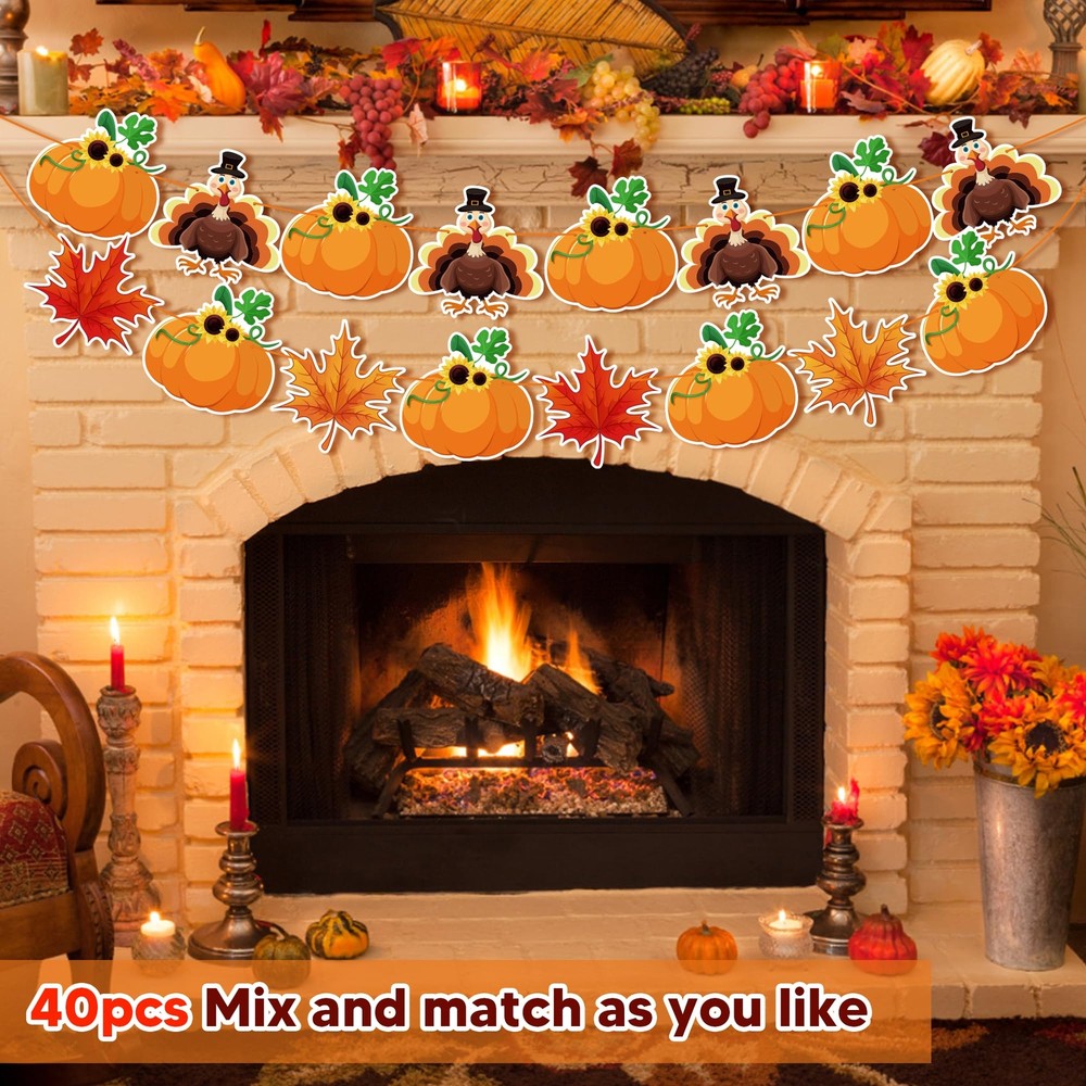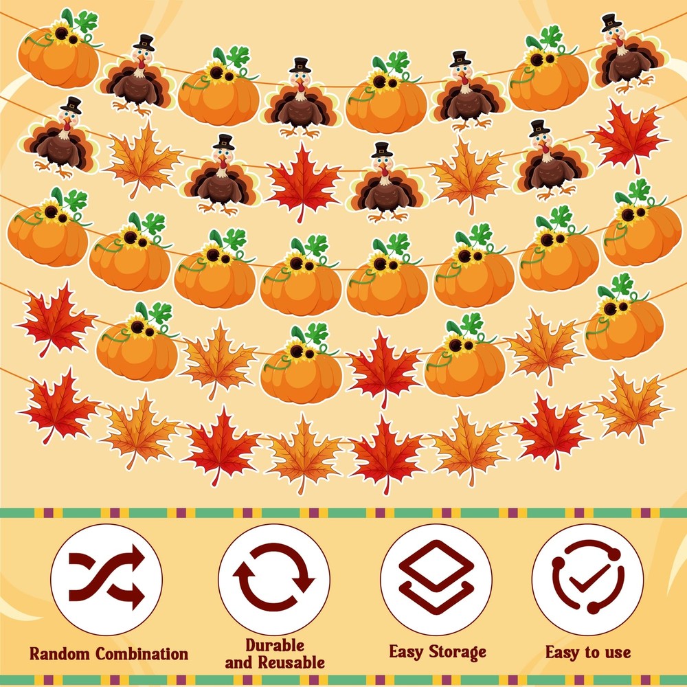 Thanksgiving Decorations Festive and Charming Thanksgiving Decor: Enhance your Thanksgiving celebrations with our exquisite banner featuring delightful turkey, pumpkin, and maple leaf patterns. Perfect for creating a warm and festive atmosphere at your home or office. Durable and Reusable Design: Crafted from high-quality materials, our Thanksgiving banner is built to last. It's easy to hang and can be stored for reuse year after year, making it a sustainable choice for beautiful holiday decor. Generous Size for Maximum Impact: Measuring 9 feet in length, this Thanksgiving banner includes 40 intricately designed pieces that will make a stunning focal point at any gathering. Impress your guests with this eye-catching decoration. Versatile Decoration for Any Space: Whether it’s your living room, dining area, or office, our Thanksgiving banner adds a festive touch anywhere. Ideal for Thanksgiving dinners, autumn-themed parties, or seasonal photoshoots, it’s a versatile addition to your decor collection. Celebrate with Joy and Style: Share the spirit of Thanksgiving with this beautifully crafted banner. Its unique patterns of turkey, pumpkin, and maple leaf embody the essence of the season, making it a perfect accessory for your festive celebrations.