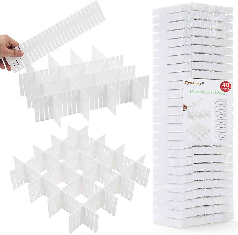 40Pcs Drawer Dividers, Adjustable Drawer Organizer for Socks, Underwear, Makeup, Can Help Tidy Kitchen, Bedroom, Dresser White Pack of 40 pieces, single one size: * 32*7cm ). Can be cutting to fit for any kind of drawers. Made of high quality safe and environment-friendly PP material, strong and durable,stay well for a long time. The drawer dividers can be moved and cut according to your cabinet and drawer,to fit in your drawers. Can help organize your dresser makeup, office supplies, socks, necktie, belt, scarf and underwear, etc. Improve the utilisation of your drawer space,help find your things at a glance, saves much time on picking your items. Drawer Divider Storage Set Best for your office supplies,kitchen Utensil tools,bathroom,hosiery,necktie,belt,belt,scarf and underwear,etc.