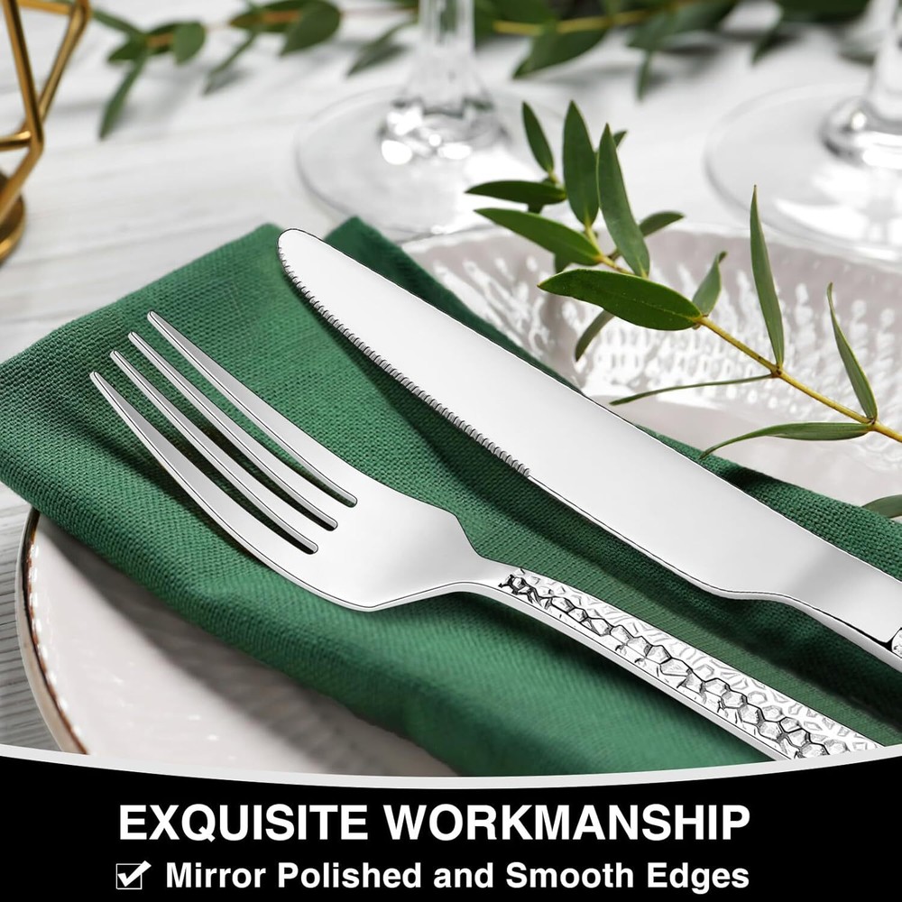 Hammered Silverware Set, 40-Piece Stainless Steel Square Mirror Finish Description Features: PREMIUM 40-PIECE SILVERWARE SET FOR 8: This flatware set contains 8 dinner forks, 8 salad forks, 8 dinner spoons, 8 dessert spoons, 8 dinner knives. It’s the ideal set for home daily use, and also for restaurants, pubs, cafes, and hotels. This cutlery set also help your dinner full of design while having a party. USE AND MAINTENANCE: Recommend hand wash first, storage them after drying. Wire brush, hard sponge, cleaning cloth or any other hard material are not recommend , it will damage the silver. PROPER WEIGHT AND COMFORTABLE HANDLE: The curvature of our utensil handles is designed according to the posture of the hand, and the appropriate weight and perfect balance are added to ensure maximum comfort during use that avoids you feel tired. Moreover, the smooth edges ensure safety and no scratches. ASHIONABLE APPEARANCE - Elegant style with hammered design on the front side of each square handles, Making every meal like a high-end banquet and bring a pleasant dining atmosphere, Matching different tablecloths, The design of the handle can highlight more styles HIGH-QUALITY STAINLESS STEEL: Made of premium food-grade stainless steel, providing the longest term value and the best properties, it offers nice resistance to rust and corrosion to get the most sturdy and healthy experience while using, never bend in daily use. Product Details: Brand: EWFEN Number of Pieces: 40 Material: Stainless Steel Color: Mirror Finish Product Care Instructions: Dishwasher Safe Recommended Uses For Product: Indoor Special Feature: Rust Resistant Finish Type: Polished Included Components: 8 Dinner Forks, 8 Salad Forks, 8 Dinner Spoons, 8 Dessert Spoons, 8 Dinner Knives Style: Square Hammered Is Stain Resistant: Yes Is Dishwasher Safe: Yes Package Dimensions: 9.65 x 4.65 x 2.44 inches Item Weight: 4.6 pounds Item model number: xike-1004CA Handling We will ship all orders within 3 business day of payment. Delivery We take pride in offering fast and reliable delivery for your orders! We are committed to getting your products to you as quickly as possible. Generally, we would like to inform you that all orders will be delivered to you within 1-3 business days after processing.However, in some cases, delivery times may vary depending on the buyer's location. Especially in remote or rural areas, the expected delivery time may be extended. In such situations, we do our best to ensure that your order reaches you as quickly as possible.If there are any delays, we will be happy to contact you to explain the situation. Our goal is to enhance your satisfaction with our fast delivery times. We work diligently to ensure that your order arrives safely.Trust us and enjoy our speedy delivery! Return Policy All items qualify for returns within 30 days of receipt. Buyer is responsible for return shipping on any item that is not damaged. Feedback We take our reputation seriously, we buy and sell online, so we understand the value of trust. If you are unsatisfied with your order, please contact us and we will work with you to resolve it to your satisfaction.