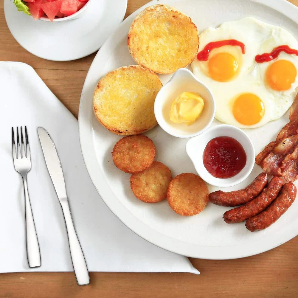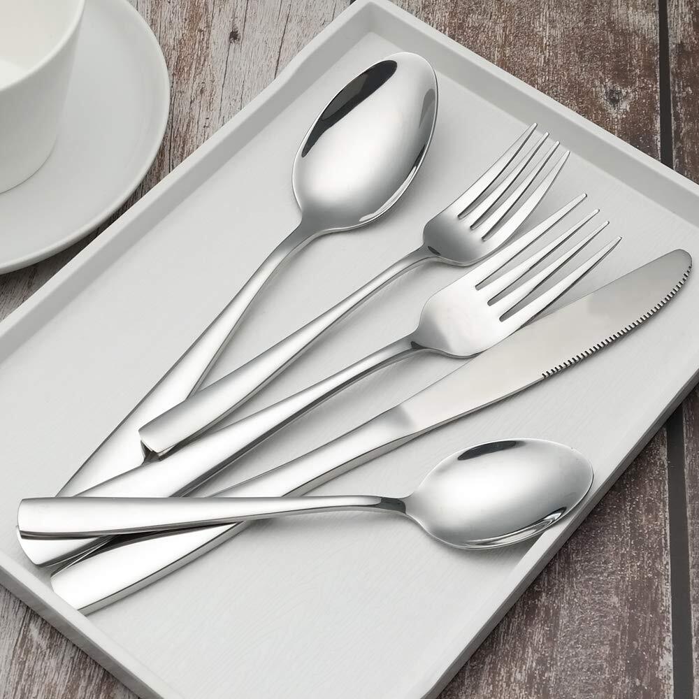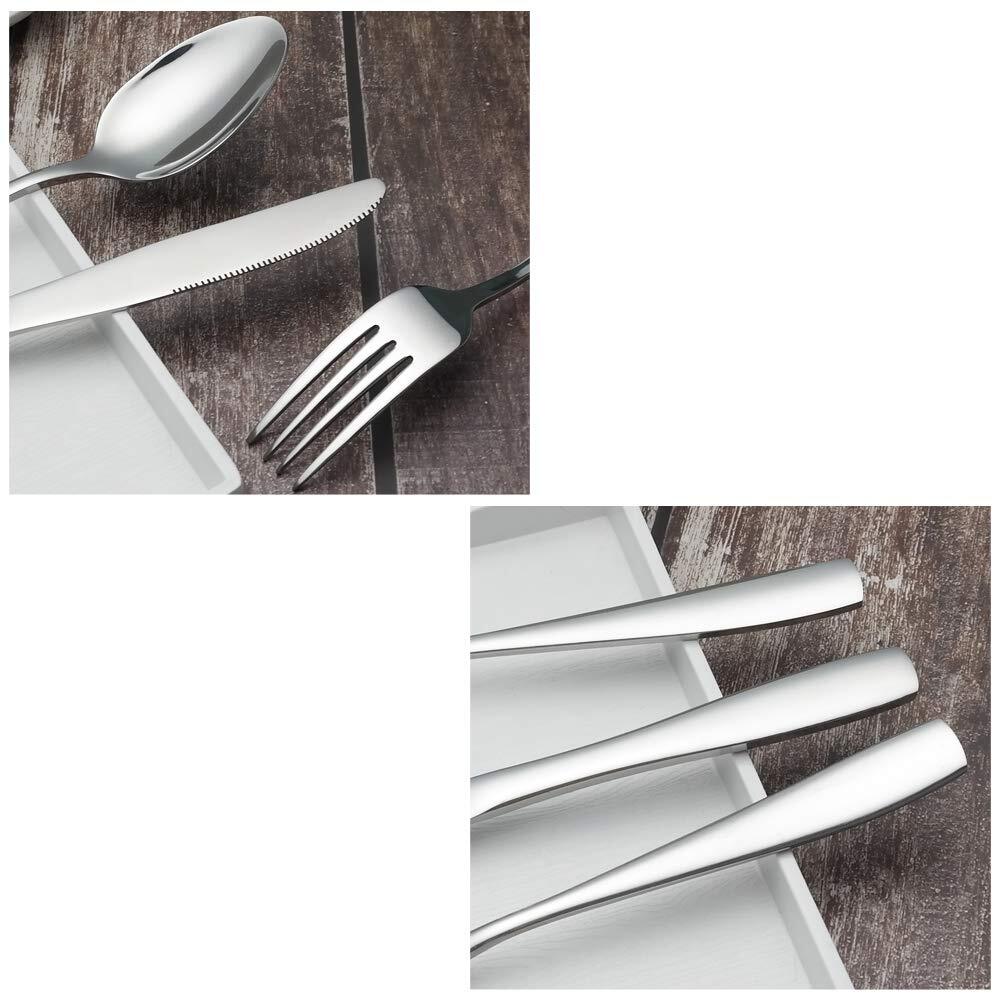 Totally 40 pieces a set, 8 dessert forks + 8 dessert spoons + 8 dinner knives + 8 dinner forks + 8 dinner spoons Made from high quality stainless steel Dessert spoon: 6.6"L x 1.37"W; dessert fork: 6.6"L x 0.9"W; dinner knives: 9.1"L x 0.7"W; dinner spoons: 8"L x 1.6"W; dinner fork: 8.1"L x 0.98"W Applicable occasions: home, kitchen, restaurant Easy to clean, reusable, durable
