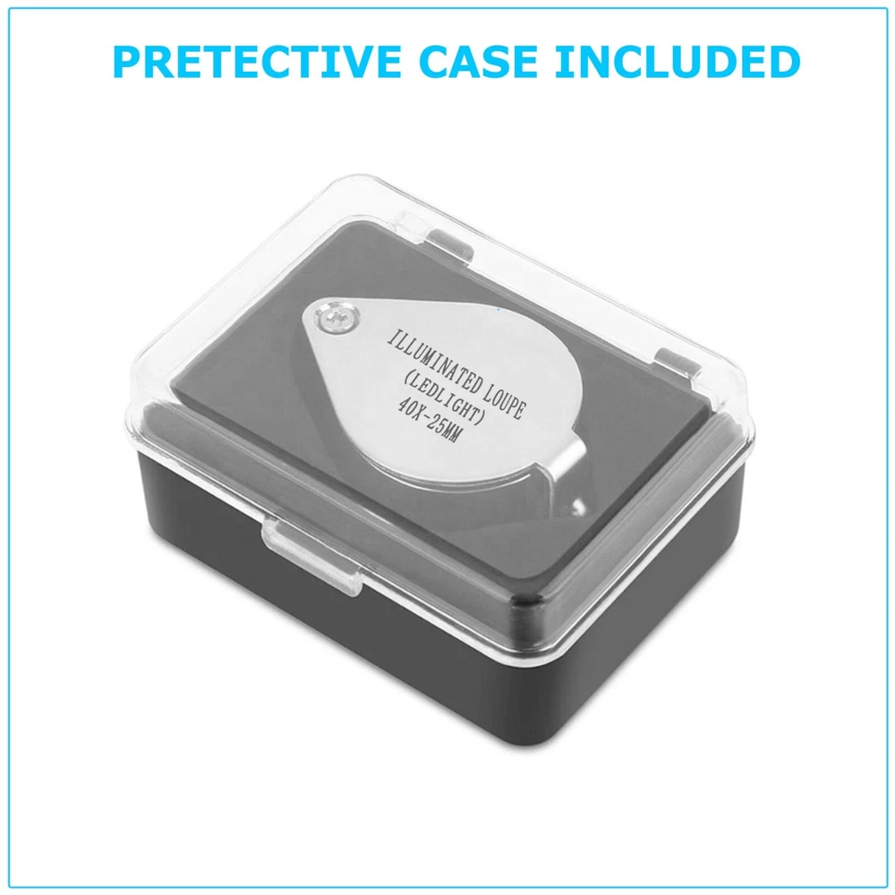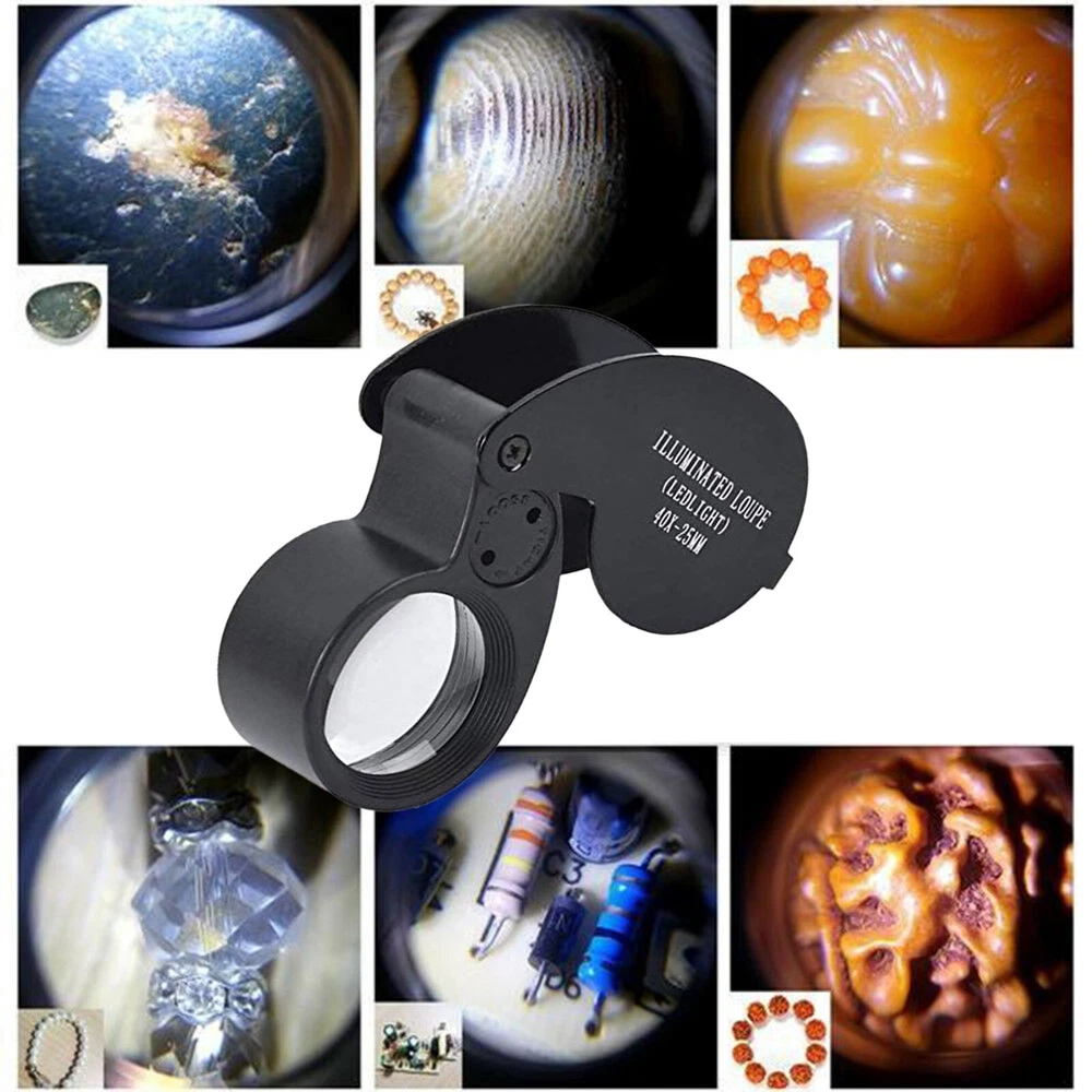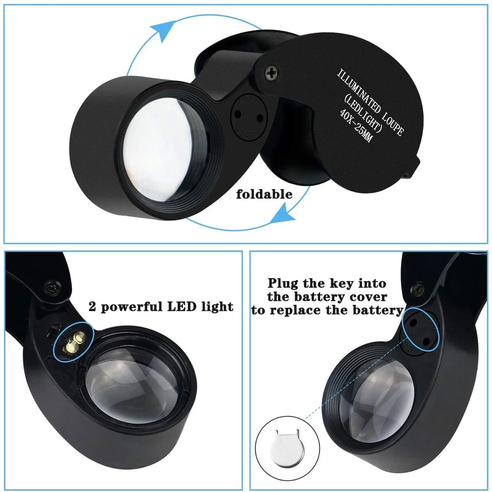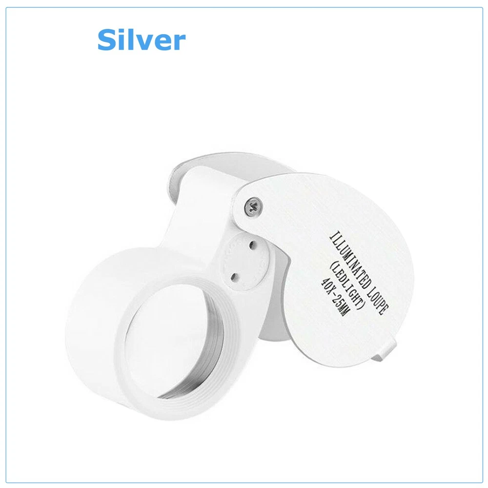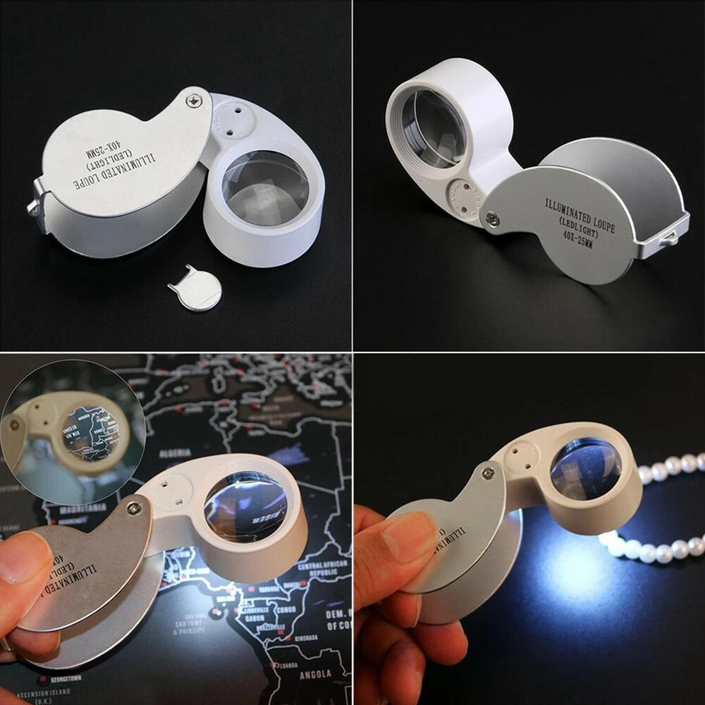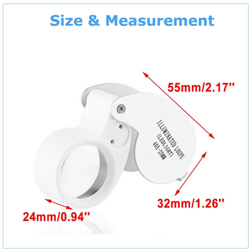 Welcome to Kumbala eBay Store Description: - 100% brand new and high quality - 40X Magnifying Loupe Jewelry Eye Glass Magnifier LED Light Jewelers Loop Pocket W/ - FREE Plastic Storage Case - Colors: Black, Silver - Magnification: 40 X - Lens diameter: 25 MM - Weight: 58 g - Material: aluminum alloy, ABS and Acrylic - Size: 58mm*33mm*25mm - Button Battery: 3 X LR927 (Included) Features: - Wide Application Range: offices, hospitals, schools, printing, homes, electronics, stamps collection, jewelry appraisal, mechanical processing and so on. - Weight: 58 g - Small size, take and keep easily - With LED lights, can use in dark - With 40 X magnification, very clear Battery Placement: - Insert the key attached this product into the two holes of battery cover, turn c ounter clockwise to loosen battery cover, take out old battery and then put new battery inside, finally turn the cover board clockwise to tighten it. Included in this package: - 40 X 25 magnifier X 1 PC - 3X Button batteries (inside) - Please choose your color. Shipped according to your selection Warranty & Customer Service : 30 days money back 60 days seller's guarantee, 24 Hours friendly customer service!