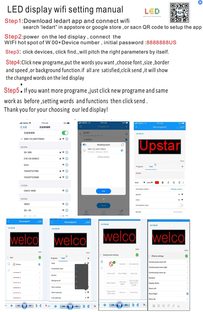 40"X8" LED Sign Scrolling Message Display Board RGB 7-Colors Programmable Board Description This LED seven-color sign is made of high-quality LED wicks with high brightness and long service life. It uses high-quality power-saving materials, so it's not only energy-saving and environmental protection but also beautiful and bright. In addition, it is made of a high-quality aluminum composite panel, so it is anti-aging and non-deforming. It remains unaffected even in the harsh outdoor environment. It can be used not only for brand stores to increase its attention. It can also be used to decorate rooms to easily create the sense of atmosphere you want. If you set the parameters through WIFI, USB flash disk, APP, but the parameters displayed errors, you can use the computer to change the parameters, which must be consistent with the parameters pasted on the back panel. Key Features Easy to Use : Our LED seven-color sign supports two control methods, a computer, and a USB flash drive. The computer and mobile phone edit the content to play through the data line and wifi connection. And the U disk is stored first and then played, which is easy to operate. Selectable Lighting Modes : Our products have two lighting modes: stable lighting and flashing lighting. The steady mode saves energy during the day, while the flashing mode can flash at night to attract people's attention. Attractive Design : Our LED billboard is equipped with a 39.4 x 7.5-inch display that supports a high resolution of 96 X 96 and dazzling color changes. It catches people's eyes. Excellent Quality : It is made of an aluminum frame and plastic unit board, so it is stable and durable. When you put it outdoors, you don't have to worry that bad weather will easily damage it. Energy-saving : It uses SMD technology LED bulb, which is lightweight, high frequency, and low energy consumption. Even if it doesn't turn off 24 hours a day, you don't need to worry about it consuming too much energy. Multiple Applications : Our LED advertising message signs are widely used in shopping malls, barber stores, beauty chains, restaurants, bars, parking lots, entertainment venues, etc. They are suitable for all kinds of indoor and outdoor commercial billboards. Small Size : Its size is only about 100.08 x 19.05 x 5 cm (39.4 x 7.5 x 2 inches). It does not take up much space when placed in the room or outside the door. High-quality Service : We also provide you with high-quality pre-sales and after-sales service for free. If you have any problem during the use, please feel free to contact us and we will try our best to help you. Details Super Dense Wicks : It consists of dense and neat LED wicks with an LED spacing of only 1cm. The item is carefully made to make the displayed text clear. Seven Colors of Light Source : It has seven colors of the light source to make the design of commercial advertisements more attractive. Applications It can be used for commercial advertising, such as shopping malls, barber stores, beauty chains, restaurants, bars, parking lots, entertainment venues, etc. The merchants can design the text etc. according to their needs and place it in front of the store, which is clear and eye-catching and can attract the attention of passers-by. It can also be used for events such as festivals or birthday parties. It can be designed according to the theme and placed in the event place, which can well render the atmosphere and decorate the room. Specification Product: LED Sign Product Size: About 100.08 x 19.05 x 5 cm (39.4 x 7.5 x 2 inches) Package Size: 107 x 7 x 23 cm (42.13 x 2.76 x 9.06 inches) Gross Weight: 2.4 kg /5.29 lbs LED Pitch Size: 1cm/0.39inch Pixel Resolution: 96*96/Plane Material: Aluminum Alloy, Plastic Color: Seven Colors Package Included 1 x LED Seven-color Sign 1 x Manual All Accessories for Assembly Notes 1. The instruction manual has detailed instructions on how to connect the device, please check it carefully. If you encounter any problem in connection, please feel free to contact us and we will reply as soon as possible. 2. Please allow for a slight color difference due to shooting light and 1-3mm error due to manual measurement, please make sure you don't mind before ordering. Note: This LED Sign is Programmable If you set the parameters through WIFI, USB flash disk, APP, but the parameters displayed errors, you can use the computer to change the parameters, which must be consistent with the parameters pasted on the back panel. Payment Delivery details Terms of sales About us Contact us Payment We accept ebay payment 。 Fees such as import duties, taxes are not included in the item price or shipping costs. These charges are the buyer's responsibility. Delivery details Shipping: 2-9 working days to: USA Terms of sales We maintain high standards of excellence and strive for hundred percent customer satisfaction. Feedback is very important to us. We hope that you contact us immediately before you give neutral or negative feedback, so that we can address your concerns. It is impossible to address issues if we do not know about them! About us Your satis faction is our ultimate goal. We work hard to earn your trust and future business. Our certified technicians have tested each item before shipping. The unit comes with 1 year limited warranty on all manufacturing defects. a) If you receive a defective item, you may return it or ask for a discount. Please contact us within 14 days after you receive the package. b) What you returned must be intact and in its original packaging as re? u. Customer is responsible for shipping costs of the returned item. c) We will cover the cost of shipping back t with the shipping rate indicated in the registration page. We will send you a new unit or refund the full payment you paid. Thank you. Contact us Business Hour Business Hour: Monday To Friday: 8:30 AM to 5:00 PM (Beijing China time) Due to time zones, our reply to your questions may not be immediately. But within above worki