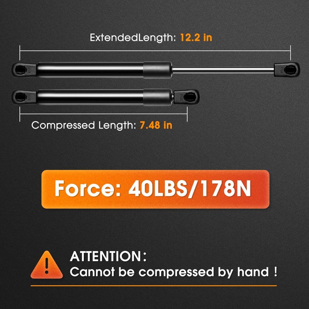 C16-11028 12 inch 40lbs/178N Gas Strut Shock Prop Lift Springs, 12" Gas Strut for A.R.E. Leer Camper Shell Topper Window Weatherguard Tool Box Snugtop Truck Cap Replacement Parts, Set of 2 by [Parameter of 12 inch Gas Struts]:Extended Length( hole to hole): 12.2", Compressed Length( hole to hole): 7.48", Force: 40Lb/178N per shock. Package include 2 struts. Fit for Lid weighing between 32-44 pounds [12 in gas shock Interchange Number]: C1611028, C16-11028, ML1540, SL15-40. SL15-40-1, LGP6-120-40s, spd-gs-5100-40, 012177, 4040, 8195562, 8340ME, CS120040; Warm tip: For your shopping experience, please check your interchange number before purchasing [Most Commonly Used]: 12 inch 40 pound gas spring for Camper Shell, Truck Pickup Tool Box, A.R.E. Leer Camper Shell Rear Window, RV Door,Rear Topper Window and other DIY applications [Why Choose Us]: 12 inch gas shock 40lb have gone through more than 30 testing procedures, 18,000 times of compression test, fearless of high temperature and cold. Give you a reliable using experience [Promise]: 12" gas struts comes with 18 months product support - If you have any questions before or after your purchase, you can come to us at any time to let us know, and we will provide professional service for you within 12 hours [Parameter of 12 inch Gas Struts]:Extended Length( hole to hole): 12.2", Compressed Length( hole to hole): 7.48", Force: 40Lb/178N per shock. Package include 2 struts. Fit for Lid weighing between 32-44 pounds Shipping We offer FREE shipping on all orders! We ship within Three business days of payment, usually sooner. We use a selection of shipping services such as UPS, FedEx, USPS etc. We only ship to the lower 48 states, no APO/FPO addresses or PO Boxes allowed. Local pickups and combined shipping options are not provided at this time. Return You can return a product for up to 30 days from the date you purchased it. Any product you return must be in the same condition you received it and in the original packaging. Please keep the receipt. Payment We accept payment by any of the following methods: PayPal Please pay as soon as possible after winning an auction, as that will allow us to post your item to you sooner! Feedback Customer satisfaction is very important to us. If you have any problem with your order, please contact us and we will do our best to make you satisfied. Contact Us If you have any queries, please contact us via ebay. We usually respond within 24 hours on weekdays. Please visit our eBay store to check out other items for sale! Thank you for shopping at our store.