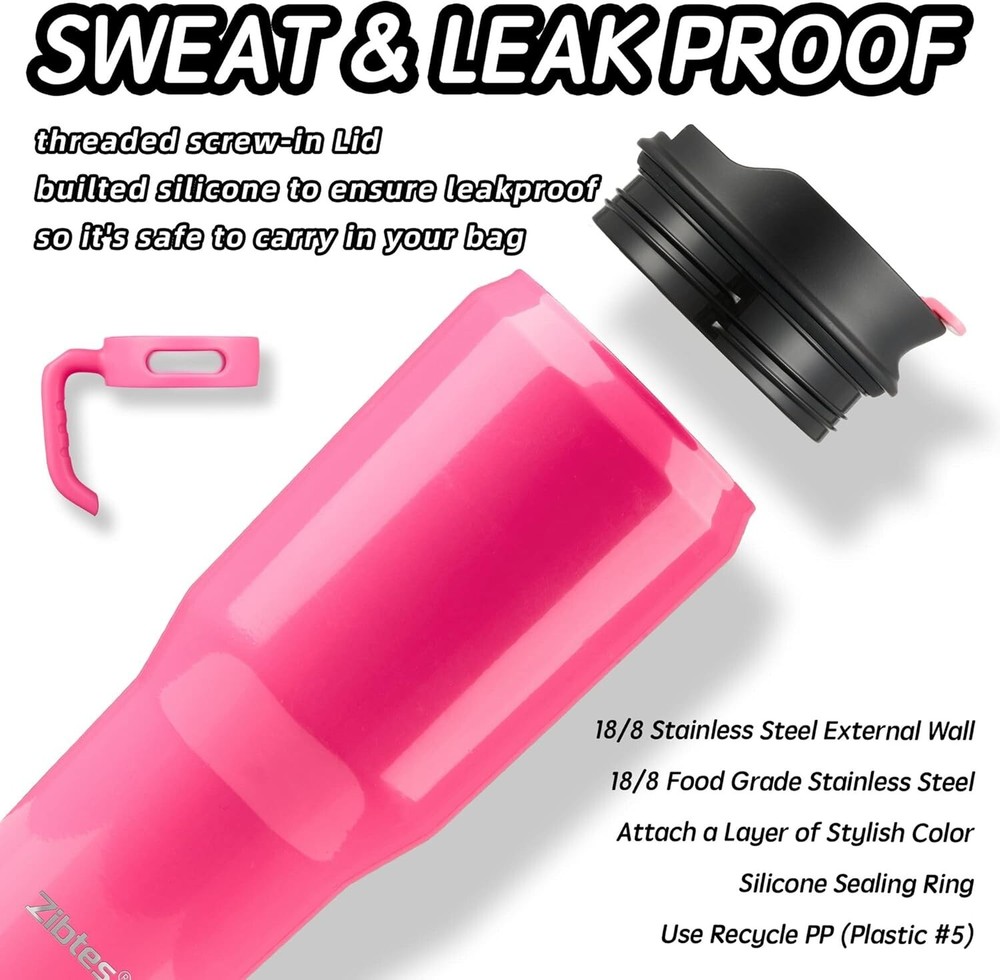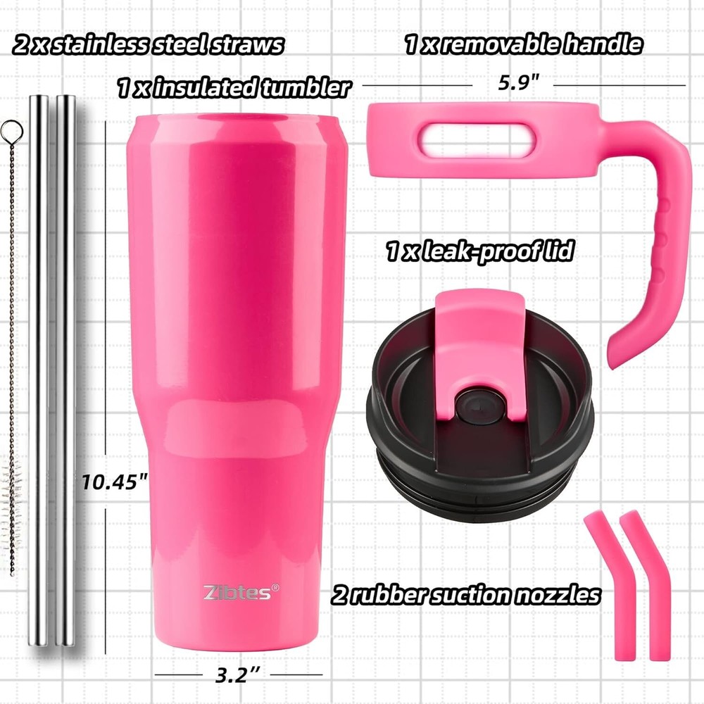 DESCRIPTION Brand Zibtes Color Hot Pink Special Feature Bpa-free,Double,Vacuum Insulated Style Tumbler 40oz Theme About this item STAINLESS STEEL INSULATED TUMBLER: It is made of food-grade 18/8 stainless steel. Stainless Steel Coffee Tumbler is firm, Rustproof, No harm to human health, and without metallic taste. The interior is electro-polished. The outer layer is coated with a powder that is non-sweat. Keep your tumbler dry and neat. 40 OZ BPA-free Travel Cup: Comes with a threaded lid, 100% leak-proof or bullet-proof. You don't have to worry about spilling it when you carry it. Plus a removable handle, two reusable stainless steel straws, and brush. VACUUM INSULATED TUMBLER: 40oz Insulated tumbler has a vacuum double wall design which ensures good insulation. No matter which season you are in, you can enjoy your favorite hot and cold drinks for a long time-keeping hot drinks hot for up to 12 hours and cold for 34 hours. Portable super-capacity coffee cup: tumbler (9.84" tall x 4.33" diameter x 3" base) can be safely placed in most car cup holders, With the handle to use more portable. Larger cups are easier to clean.