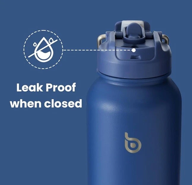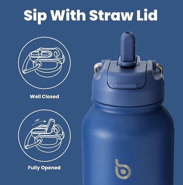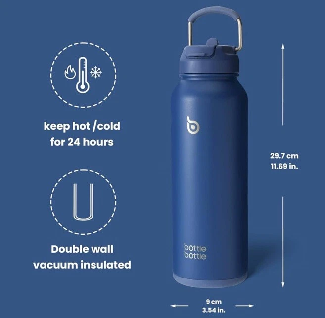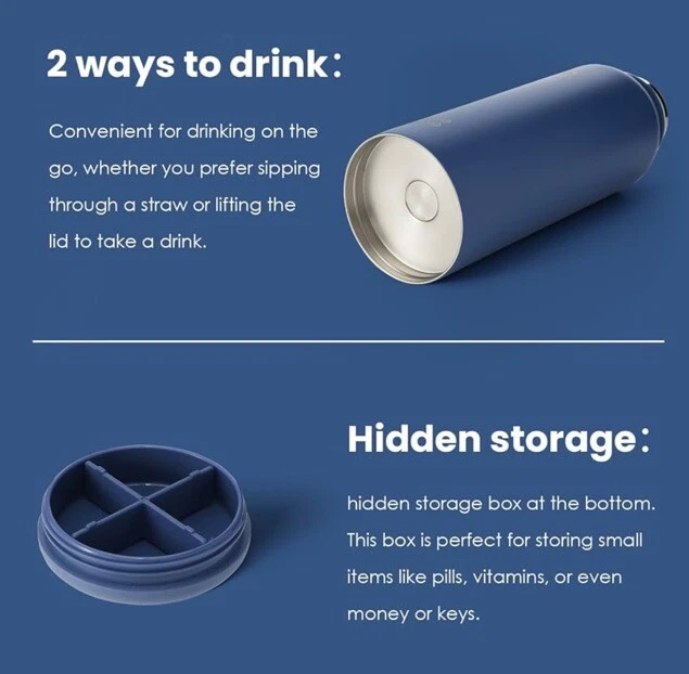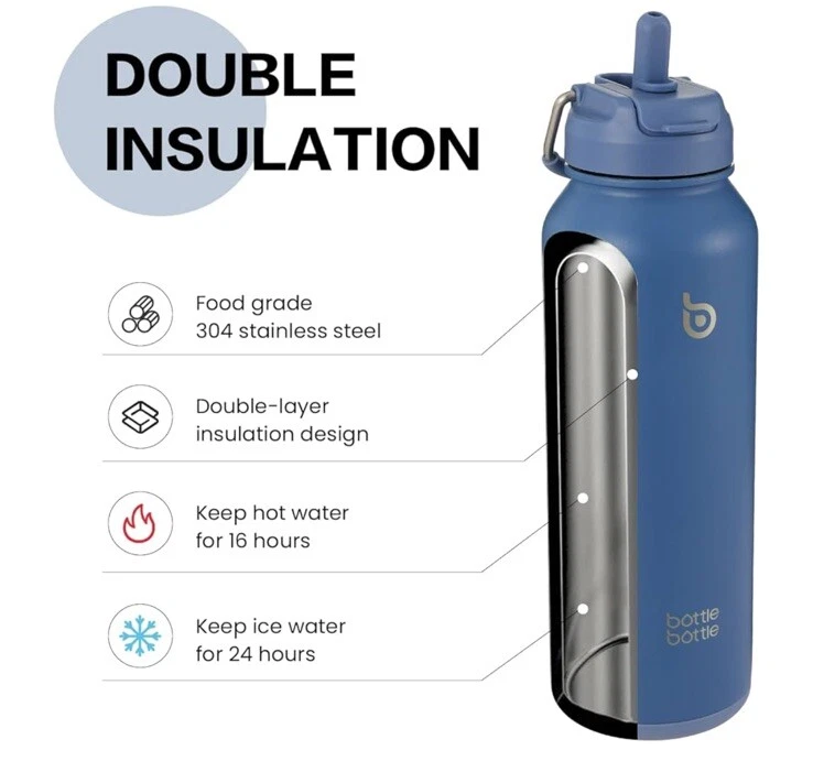 New, Sealed BOTTLE BOTTLE 40 oz sports water bottle stainless steel insulated water bottle with straw and pills holder (blue) DOUBLE INSULATION (1,086) Food grade 304 stainless steel Double-layer insulation design Keep hot water for 16 hours Keep ice water for 24 hours Has hidden storage on the bottom for medication