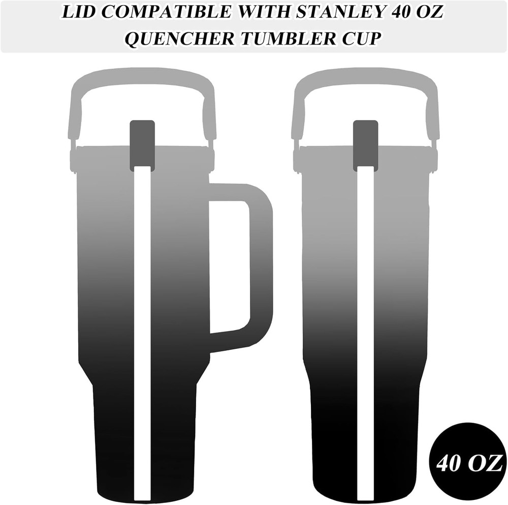 40 Oz Flip Straw Lid for Stanley Quencher Travel Tumbler 40 Oz Cup, Replacement Product Description: Features Made of food-grade plastic, BPA free, safe for your health. The replacement flip straw lid is specifically designed for the Stanley Quencher 40oz Tumbler. Specifications Color: Black Material: Plastic, Silicone Package List 1 x 40oz Flip Straw Lid 1 x Silicone Straw About this item: FITS: Compatible with Stanley 40oz Quencher Tumblers, which is threaded to fit perfectly in the mouth of the cup - and comes with a straw RELIABLE MATERIAL: 40 oz. flip straw lid is made of durable food-grade plastic that is BPA-free and safe for direct contact with beverages. FITS: Compatible with Stanley 40oz Quencher Tumblers, which is threaded to fit perfectly in the mouth of the cup - and comes with a straw. TIGHT SEAL: The lid can perfectly keep your drink warm, plus our lid's fully enclosed top design can keep outside dust out. 2 MODES: 2 different openings to meet your different drinking habits. Color Black Style Casual Included Components No Shape Round