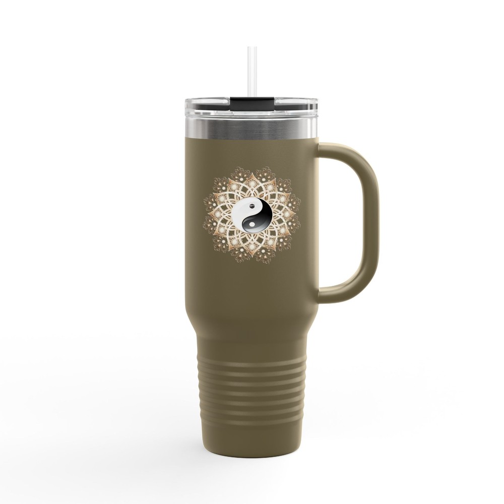 This travel mug is a game-changer! The 40oz size holds plenty, and the insulation keeps drinks hot or cold for hours. Love the ergonomic handle—super comfy to carry. Perfect for yoga, road trips, or just daily use. The yin yang design adds a nice touch. A must-have for anyone who values style and functionality in their drinkware. Great gift idea too!