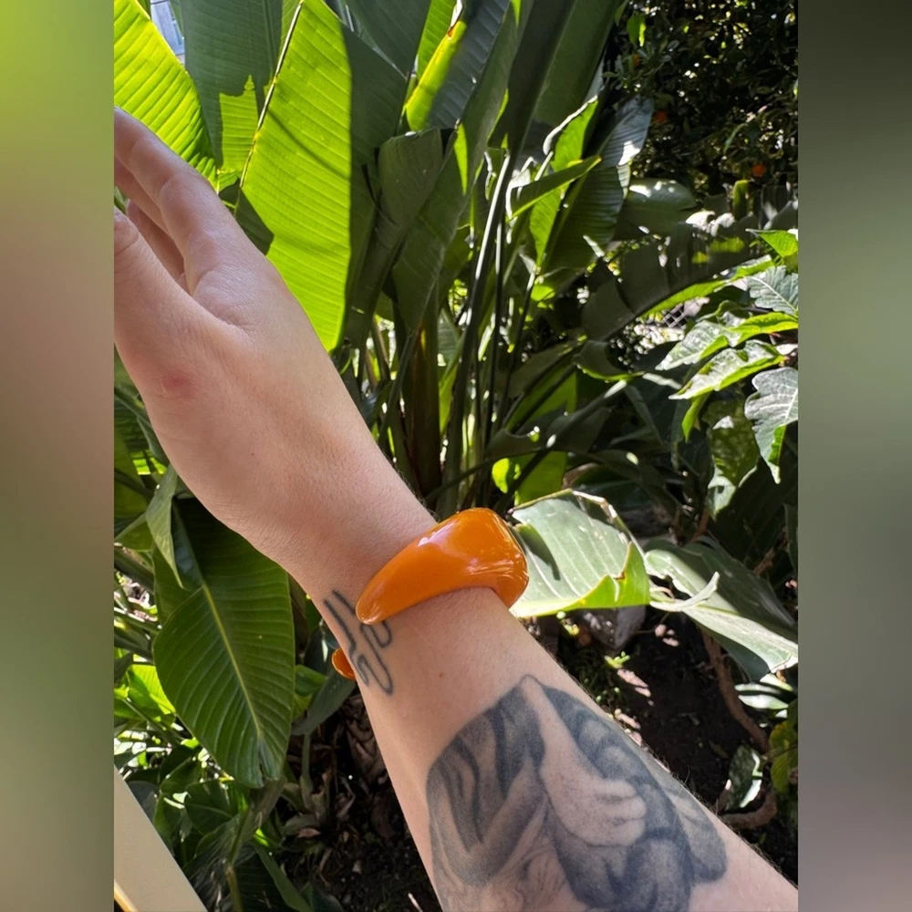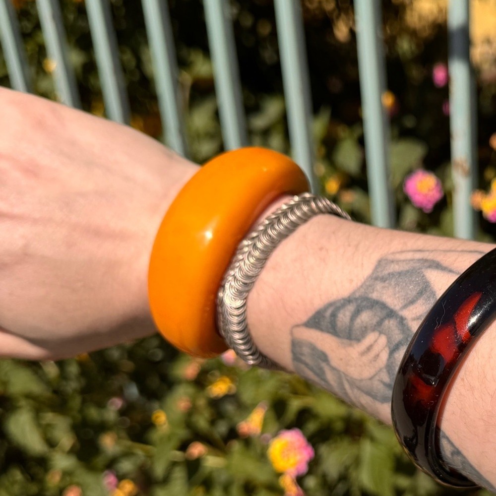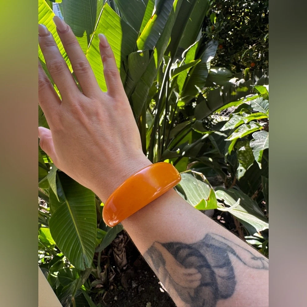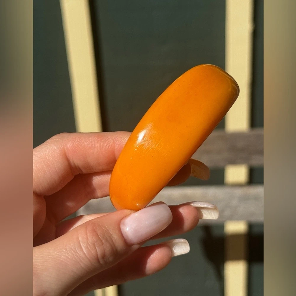 This 1940s cuff is a true collectors piece! Made of an orange opague bakelite, its a chunky, bubbly cuff that measures 4.5 inches round. In good condition - some minor scratching throughout. Looks great paired with a stack of bakelite cuffs or on its own!