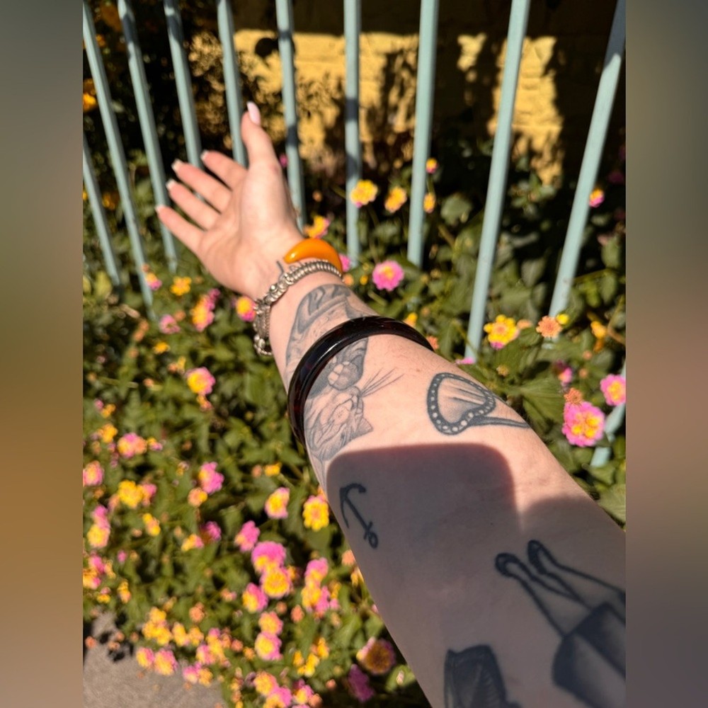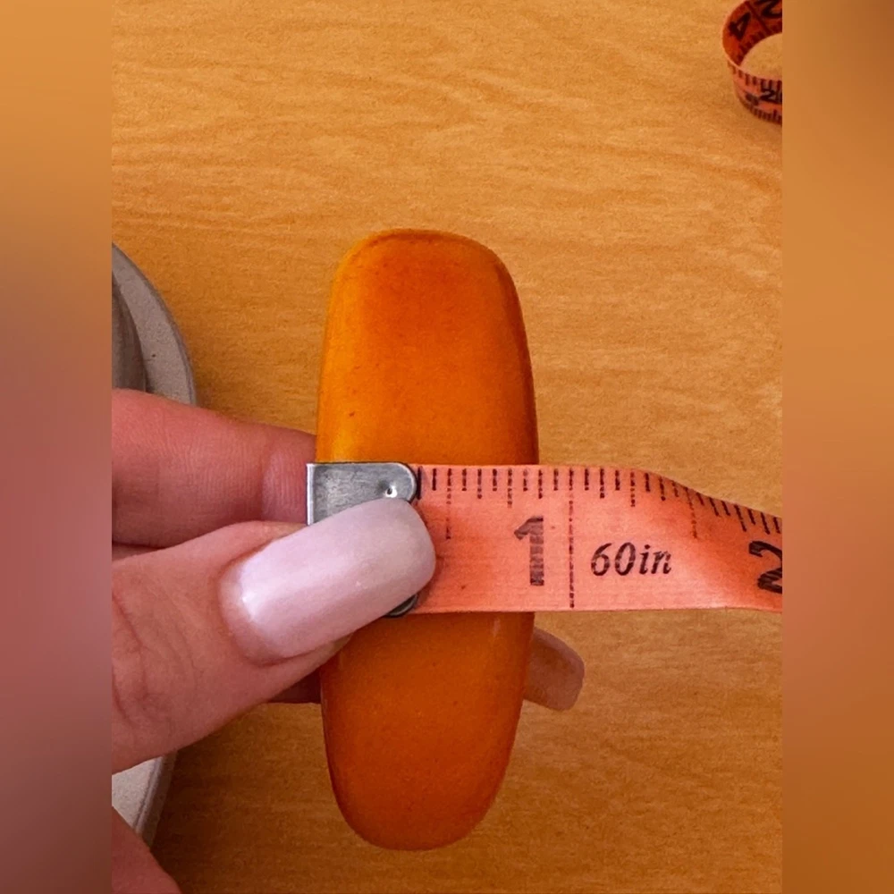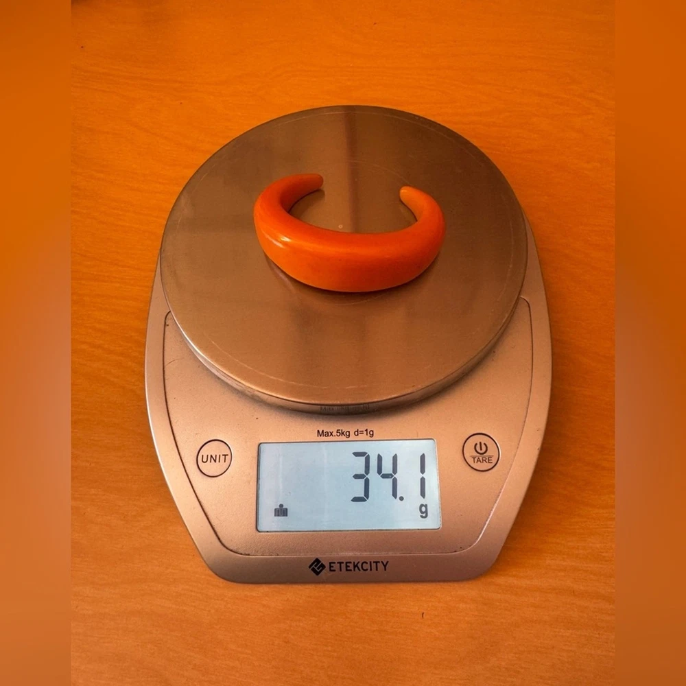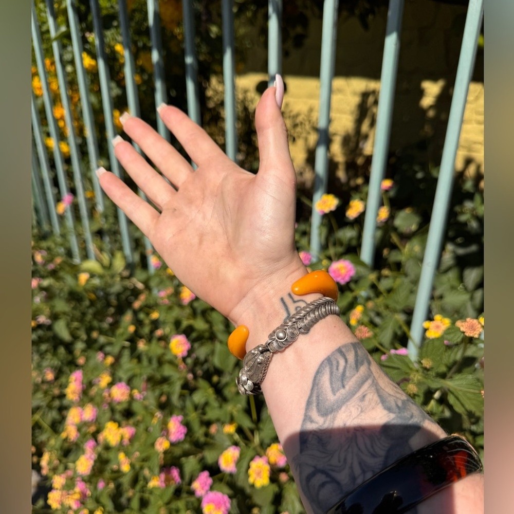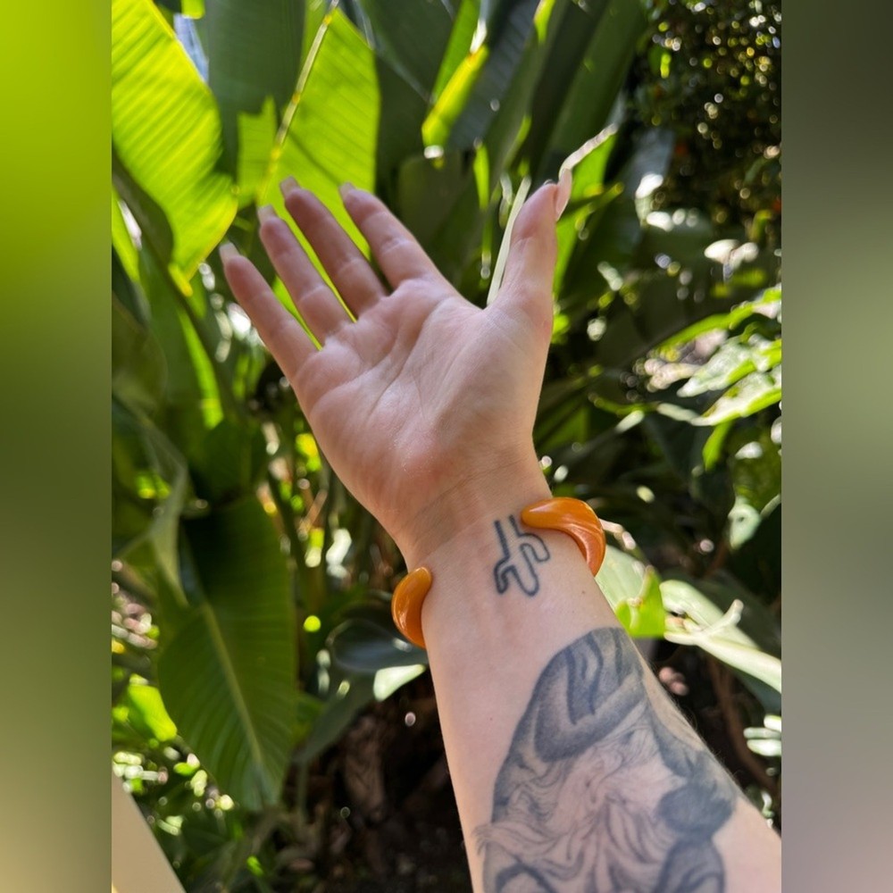 This 1940s cuff is a true collectors piece! Made of an orange opague bakelite, its a chunky, bubbly cuff that measures 4.5 inches round. In good condition - some minor scratching throughout. Looks great paired with a stack of bakelite cuffs or on its own!