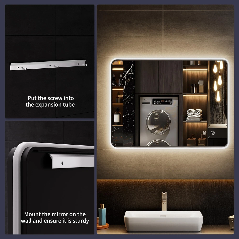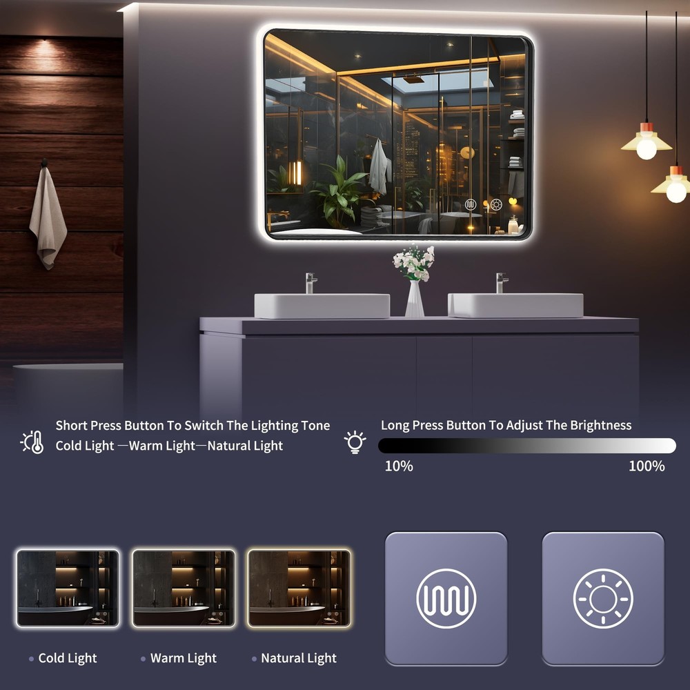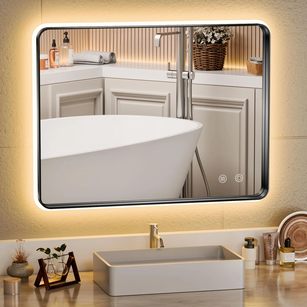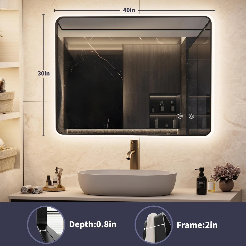 40''×30'' Vanity Mirror with Lights, Black Frame Rounded Corner Rectangle LED Bathroom Mirror, Smart Touch Control 3 Colors Dimmable Lighted Makeup Mirror, Anti-Fog, Modern Wall Mirror Product Details Color: C. Exterior-lit Black-framed Size: 40x30 Brand: Vosuja MPN: MB-Ur-Re-3S-10176-BK UPC: Does not apply EAN: Does not apply Brand: Vosuja Room Type: Cloakroom, Bathroom, Hair Salon, Hallway, Hotel Shape: Rectangular Product Dimensions: 40"L x 30"W Frame Material: Iron Brand: Vosuja Room Type: Cloakroom, Bathroom, Hair Salon, Hallway, Hotel Shape: Rectangular Product Dimensions: 40"L x 30"W Frame Material: Iron Style: Modern Mounting Type: Wall Mount Finish Type: Brushed Surface Recommendation: Glass Special Feature: Waterproof, Round Corner Rectangle, Dimmable Brightness, Anti-fog, 3 Color Temperature Color: C. Exterior-lit Black-framed Theme: Modern Specific Uses For Product: Dressing, Makeup, Home Decor Number of Pieces: 1 Number of Items: 1 Material: Metal Frame Type: Framed Assembly Required: No Frame Color: black Manufacturer: Vosuja Item Weight: 30.1 pounds Item model number: MB-Ur-Re-3S-10176-BK Date First Available: July 5, 2023 Unique Design: This wall mirror stands out with its special LED light strip surrounding the black metal frame. It serves not only as a vanity mirror but also as a decorative ornament, making it an eye-catching addition to any space. This black mirror transcends the ordinary by combining the functionality of a mirror with the aesthetic appeal of an ornament. Modern and Textured: The brushed treatment on the black frame surface gives this rectangular mirror a textured look, adding a touch of sophistication to your decor. The high-quality brushed frame material, along with the floating glass panel, ensures a modern and stylish appearance and enhances the overall ambiance of your space with its sleek design. Multi-functional Mirror: With adjustable 3 lighting tone and brightness dimmable feature, this lighted makeup mirror allows you to customize the lighting according to your needs. The dimmable LED lights provide the perfect ambiance for your makeup routine. It is equipped with anti-fog technology to ensure a clear view even in humid conditions. Furthermore, it offers both hardwired and plug-in wiring options to accommodate different wiring needs. High-Definition Reflection: Experience crystal-clear imaging with this LED bathroom mirror. The high-quality upgraded silver glass used guarantees a real HD reflection. The 4mm thickness of the mirror and the silver nitrate coating eliminate any visual distortion, even when viewed from a distance. Multi-room Use: Our bathroom vanity mirror with lights is carefully packaged in a thick foam box, ensuring that 4030 mirror Passes drop test.The Illuminate mirror can be placed in the cloakroom, makeup vanity for matching aid.