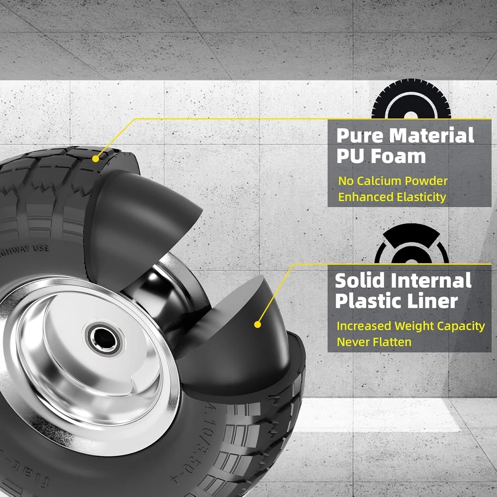 4.10/3.50-4 Tire and Wheel Flat Free, 10 Inch Solid Rubber 101, Black Product Details Size: 101 Brand: Iococee Wheel Size: 10 Inches Pitch Circle Diameter: 10 Inches Item Weight: 1.5 Kilograms Item Diameter: 4 Inches Vehicle Service Type: Mower Load Index: 91 Rim Width: 17 Inches Color: Black Manufacturer: Well1314 Model: 4.10/3.50-4 Tire and Wheel Flat Free Item Weight: 3.29 pounds Item model number: 4.10/3.50-4 Tire Manufacturer Part Number: 4.10/3.50-4 Construction: Cast Speed Rating: l Bolt Pattern (Number of Holes): 4 Offset: 2 Inches Size: 101 Brand: Iococee Wheel Size: 10 Inches Pitch Circle Diameter: 10 Inches Item Weight: 1.5 Kilograms Item Diameter: 4 Inches Vehicle Service Type: Mower Load Index: 91 Rim Width: 17 Inches Exterior FinishMaterial: SilverRubber Wheel BackspacingRim Size: 10 Inches3.5 Inches Say Goodbye To Flat Tires: Dolly Tires 4.10 3.50-4 Flat Free 4 pack,made of high-quality urethane tires and iron hub. The flat free tire can prevent from getting punctured or deflated. Keep you away from the trouble of inflating tires frequently. Please pay attention to check if your old tire model number matches before buying. (note:suitable for dynamic loads, but not for static loads). Widely Applicable: The 10 inch wheels are the most common size of tires used for home. Perfect replacement for your wheelbarrow wheel, hand truck tires, dolly tires, wagon tires, handtruck tires,dolly cart wheels, garden cart tires. Scientific Design: Staggered serrated tread design and heavy duty double sealed ball bearings with 5/8” axle bore,scientific structural design and high-quality metal materials greatly increase its bearing capacity, which makes our wheelbarrow tires good at the grip, drainage, slip-resistant, and shock-absorbing. Provides superior maneuverability and ground clearance for your cart. You can easily use it to complete your work. Flat Tire Solution Expert: We are a tire manufacturer with thirty years of experience. After years of tests, we finally add polyurethane material to enhance the durability of the solid rubber tire, completely preventing the falt tire of the free wheel barrow. The upgraded tires are about 1 pound heavier than the ordinary ones. Although this has increased our costs, but it is recognized by our customers. After Sales: Don’t spend hundreds of dollars to buy one new cart ,high-quality 410/350 x 4 tire save you time and money, any reason you are not completely satisfied, you can ask for replacement. Dear friends, use your brain and hands to diy work!