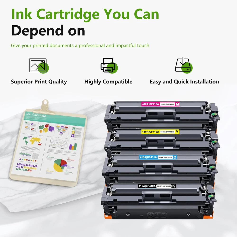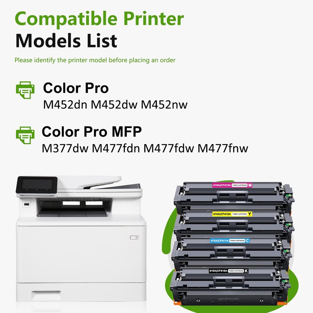 4 Pack 410A Toner cartridge. (BK/C/M/Y) Suitable for the following printers: Color Pro MFP M477fdw, MFP M477fnw, MFP M477fdn MFP M377dw, Color Pro M452dn, M452nw, M452dw Printer High-end quality, excellent printing Firm fixing: good fluidity, strong permeability, no color loss when repeatedly applied. Good Ink Cartridges should be like this: Increased efficiency- Improved technology and Ink help you meet your printing needs efficiently. Print in no time at all. Excellent quality- Professional quality management strives to ensure excellent quality and keep your prints free of lines, spots and penetration. Secure packaging- Sealed packaging. Multiple protection. Avoid damage during shipping. Better Print With Products from are manufactured by high quality materials with minimal resource loss from the factory. We devote ourselves to offering you an enjoyable printing! Package Contents: 4 Pack 410A Toner Cartridge (1Black/1Cyan/1Magenta/1Yellow) Compatible Printers:Color Pro MFP M477fdw, Color Pro MFP M477fnw, Color Pro MFP M477fdn, Color Pro MFP M377dw, Color Pro M452dn, Color Pro M452nw, Color Pro M452dw Printer Little cost for more: 2800 pages per 410A CF410A Black Toner cartridges, 2800 Pages per CF411A CF412A CF413A 410A Color Toner cartridges (at 5% coverage) Outstanding performance and high quality: The 410A Toner cartridge ensures clear prints and delivers the desired color effect on paper, meeting all your office and home printing needs. Enjoy its reliable performance whenever you need it. Each 410A Toner cartridges undergoes a strict quality testing procedure to ensure quality and compatibility with your printer