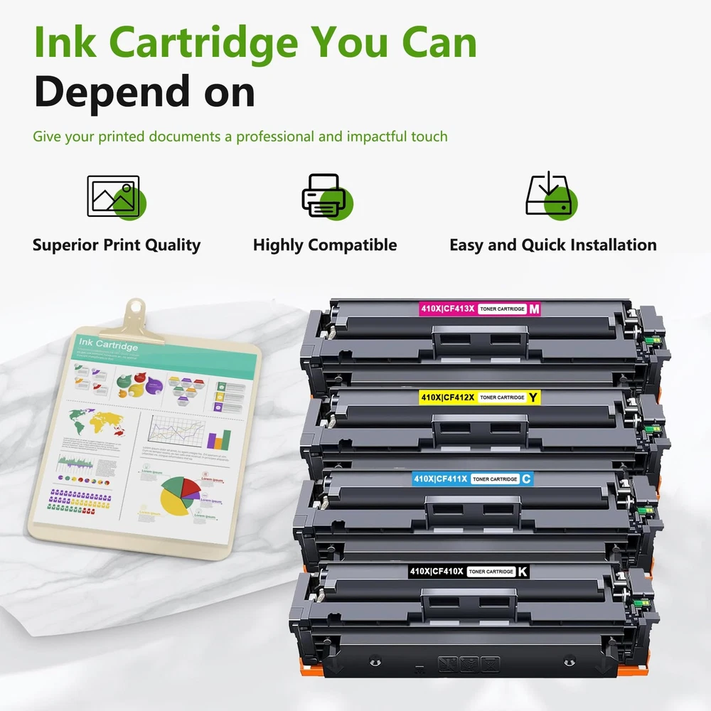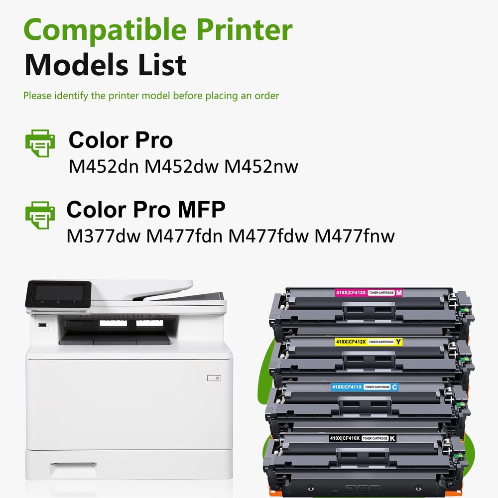 What you will get: 4 Pack 410X Toner cartridge. (BK/C/M/Y) Suitable for the following printers: Color Pro MFP M477fdw, MFP M477fnw, MFP M477fdn MFP M377dw, Color Pro M452dn, M452nw, M452dw Printer High-end quality, excellent printing Firm fixing: good fluidity, strong permeability, no color loss when repeatedly applied. Good Ink Cartridges should be like this: Increased efficiency- Improved technology and Ink help you meet your printing needs efficiently. Print in no time at all. Excellent quality- Professional quality management strives to ensure excellent quality and keep your prints free of lines, spots and penetration. Secure packaging- Sealed packaging. Multiple protection. Avoid damage during shipping. Better Print With Products from are manufactured by high quality materials with minimal resource loss from the factory. We devote ourselves to offering you an enjoyable printing! Package Contents: 4 Pack 410X Toner Cartridge (1Black/1Cyan/1Magenta/1Yellow) Compatible Printers: Color Pro MFP M477fdw, MFP M477fnw, MFP M477fdn, MFP M377dw, Color Pro M452dn, M452nw, M452dw Printer Little cost for more:6800 pages per CF410X 410X Black Toner cartridge, 5300 Pages per CF411X CF412X CF413X 410X Color Toner cartridges (at 5% coverage) Outstanding performance and high quality: The 410X Toner cartridges ensures clear prints and delivers the desired color effect on paper, meeting all your office and home printing needs. Enjoy its reliable performance whenever you need it. Each 410X Toner cartridges undergoes a strict quality testing procedure to ensure quality and compatibility with your printer