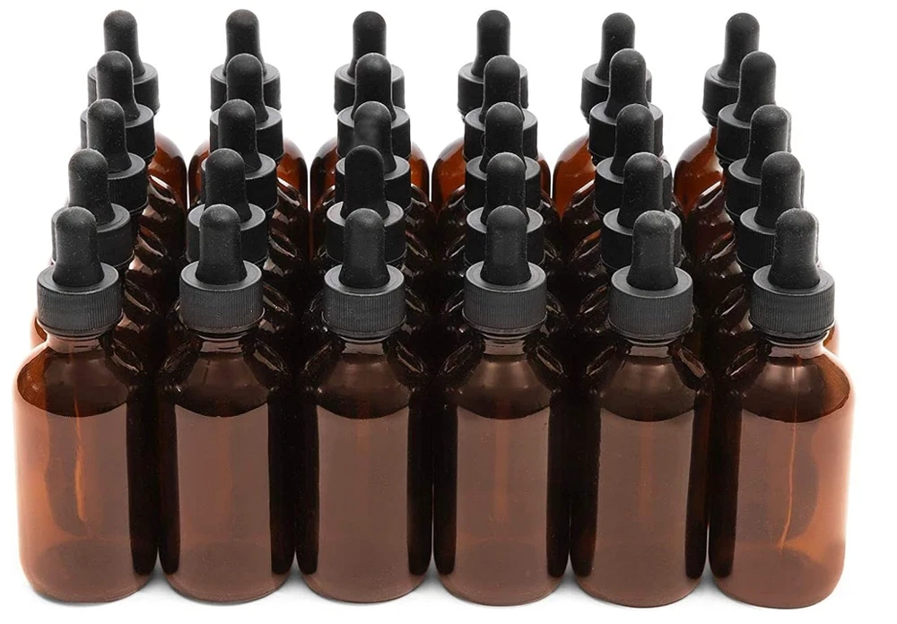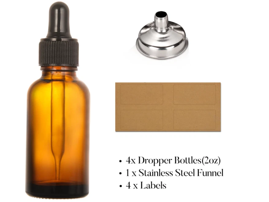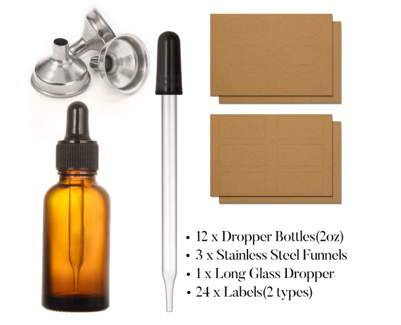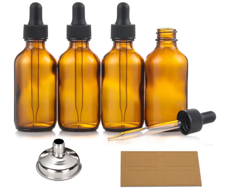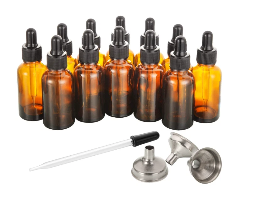 4/12/30-Pack Amber Glass Dropper Bottles 2oz + Funnels for Essential Oils
